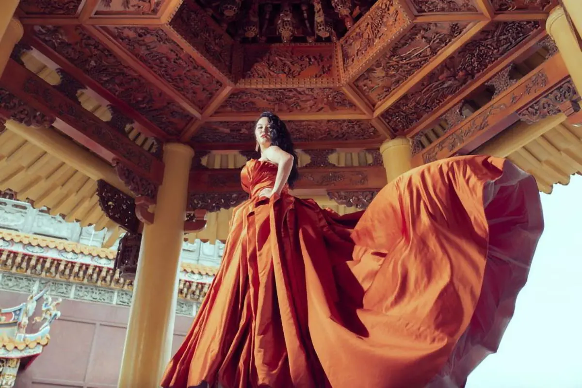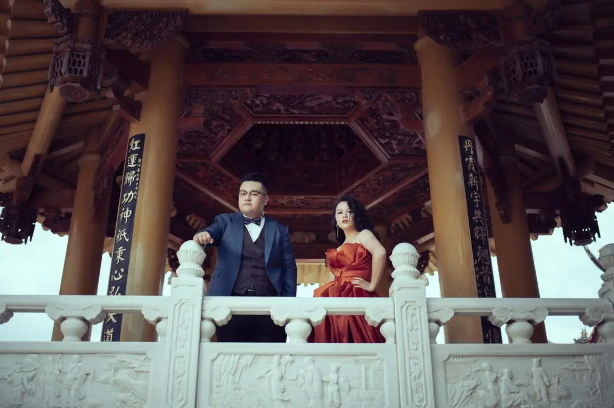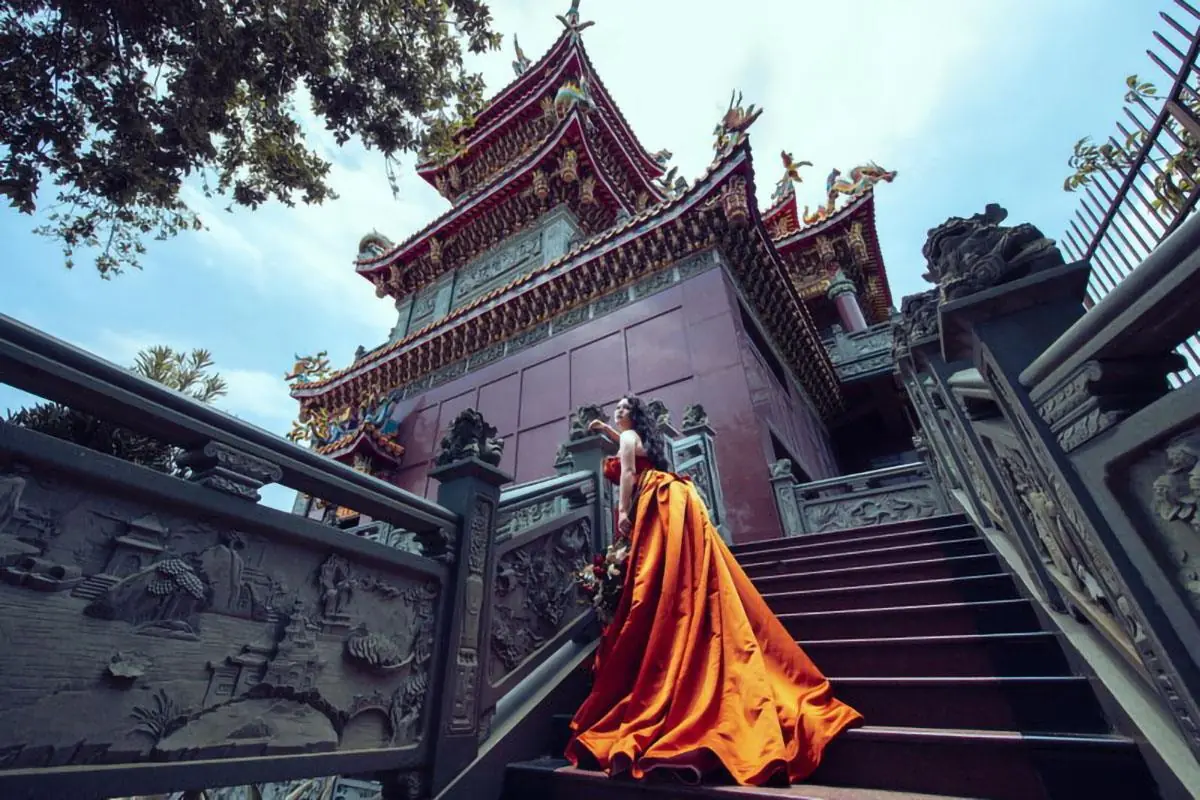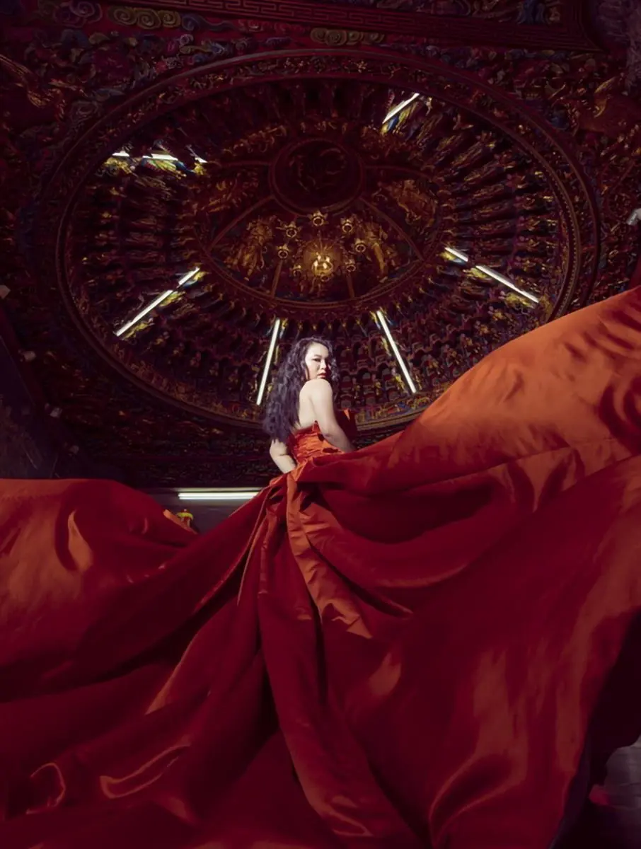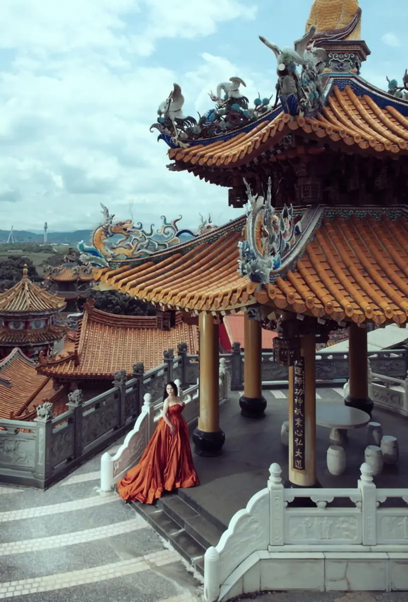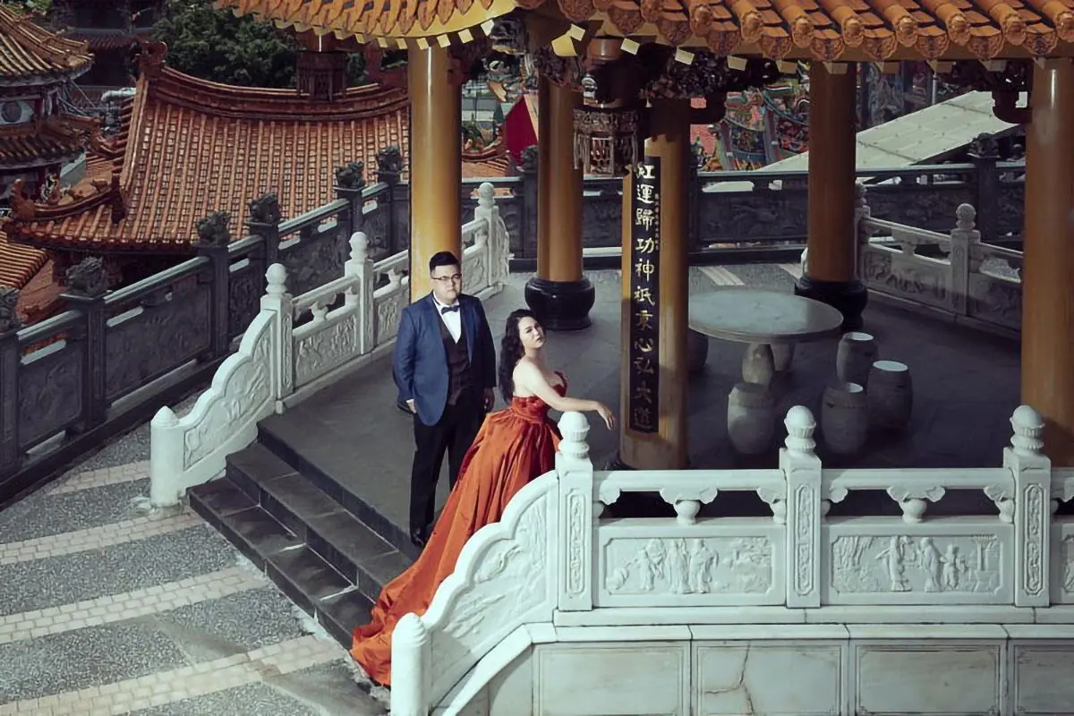 這張照片榮登關渡宮系列我的最愛,其實我在拍攝前做功課看韋麟之前的作品時,很少看過這種風格,因此難得出現一張就讓我非常很震撼,宮廟圓頂的氣勢無所不在,我們以為只是經過一個通道時,他突然緊貼趴地,捕捉富麗堂皇的圓頂,記得老公原本幫忙飄裙,但是怎麼飄都讓裙子無法成功,雅玲和Vicky神手一飄,同時雅玲再神來一手的補光,謝謝這麼完美的巧合,成就了快門鍵與裙襬完美到位的一刻,完全把我選這件禮服的理由發揮的淋漓盡致。