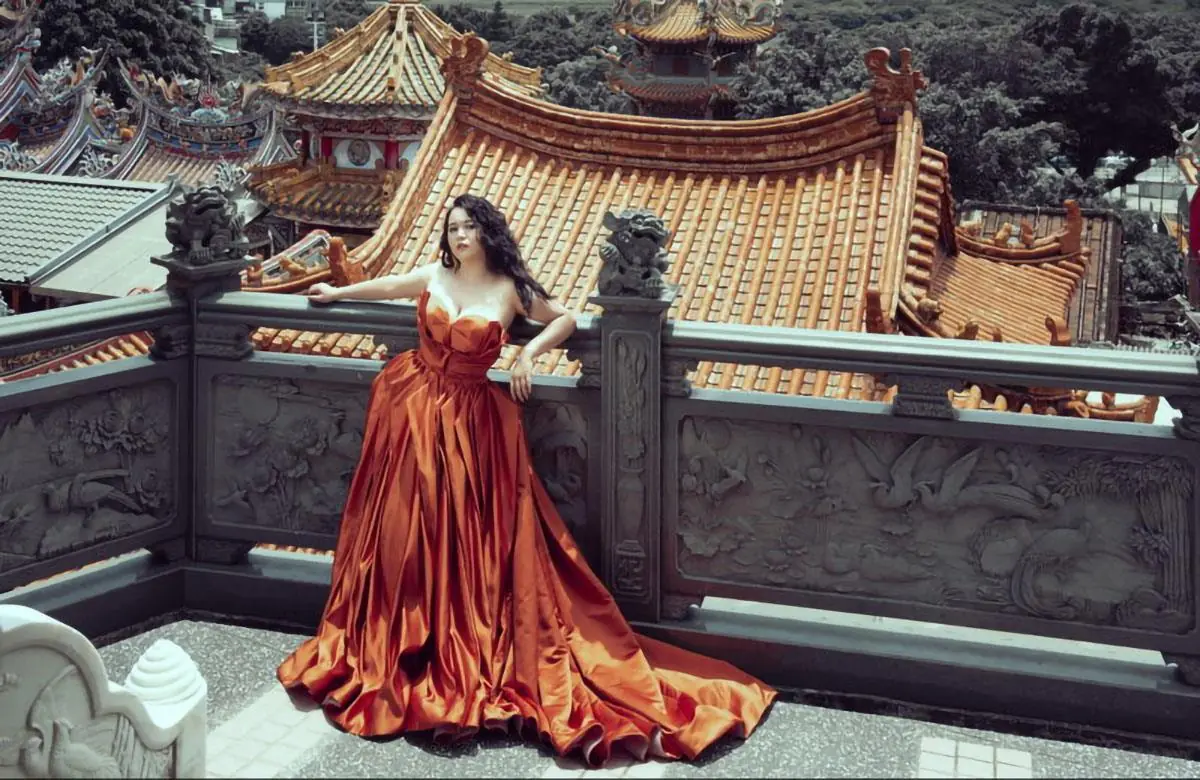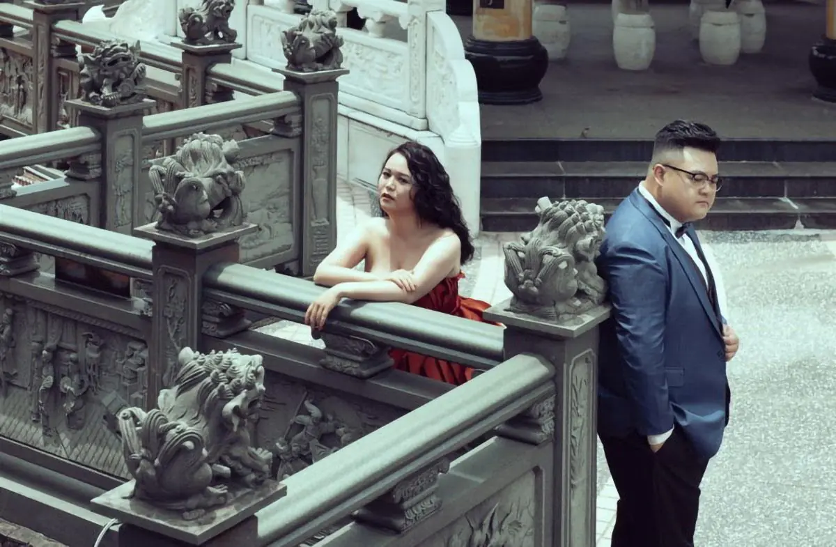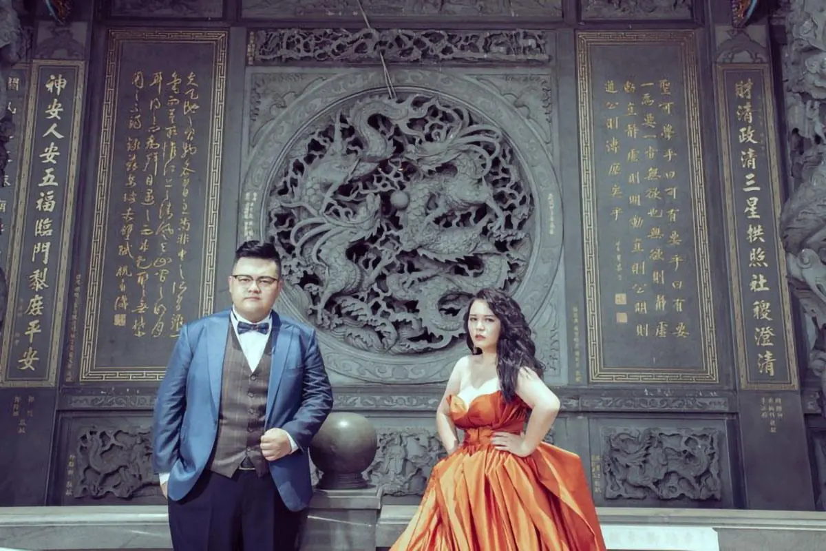 關於禮服和場景,穿插了陰錯陽差的小故事,原定計畫穿黑色禮服搭配水牛坑的戶外大景,橘色禮服搭配關渡宮,白紗搭配棚內場景,但其實我心裡的小宇宙,一直心心念念的「也想要」穿著橘色禮服在林安泰假山拍攝,當初在唯你婚紗門市看各個攝影師照片的時候,除了喜歡韋麟外拍作品唯黃和冷色交錯的美感,另外就是被其中一張新娘穿著桃紅色禮服站在假山的照片吸引,幻想著我穿著橘紅色禮服站在灰藍色岩石前留下對比顏色的衝突感,還有穿著黑色禮服在戶外大岩石的場景凸顯荒漠感,都是心裡期待很久的畫面,但我覺得很幽默的是,特地為了假山排了一個避開星期一(林安泰閉園)的日子拍攝,也正好各種因素,所以當天的行程就臨時調整成關渡宮、林安泰、棚內,關渡宮拍攝完後原本要直接去林安泰,殊不知!我在這時候竟然身體不舒服,於是只好先回棚內休息並換上黑色禮服前往林安泰,當車一開到門口,眼看就快要圓夢時,大滴雨就這麼不巧突然直落下,在時間和空間都天不時地不利的狀況下,我們回到棚內拍攝剩餘的黑色禮服和白紗。