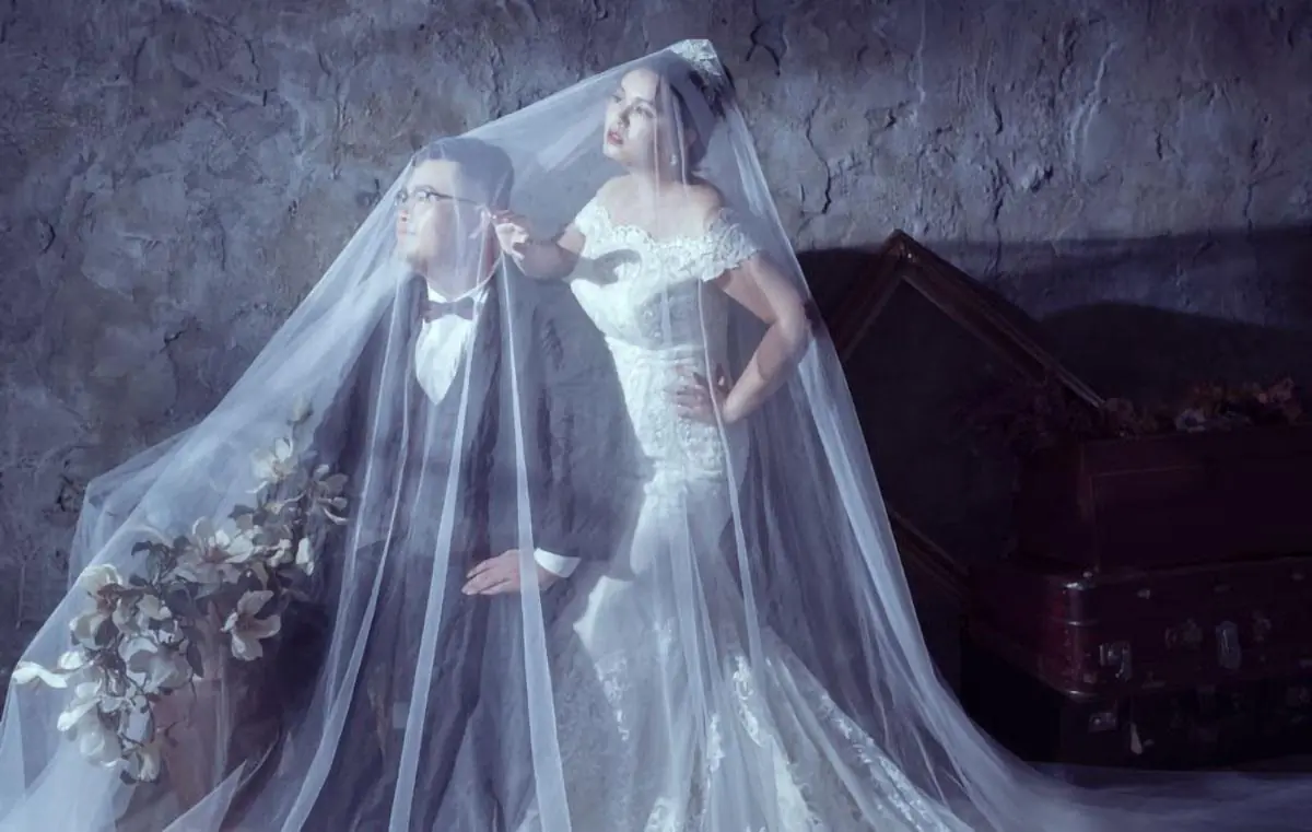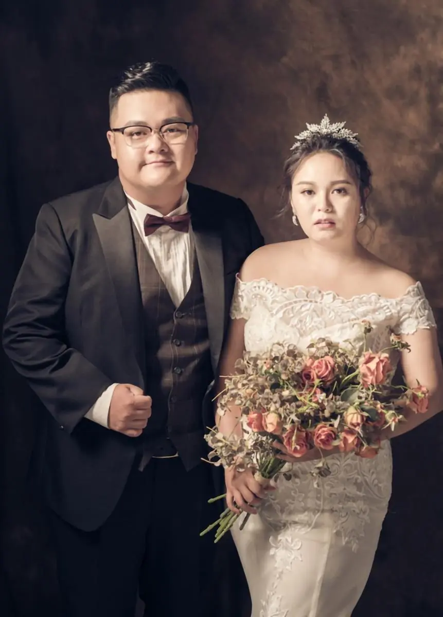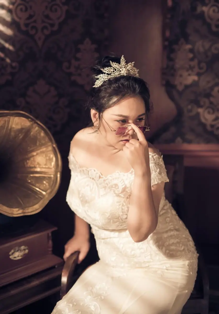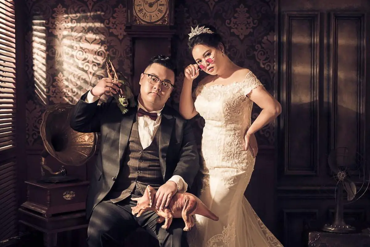 我稱這系列叫「傲嬌系列」,因為這個場景是我和老公記憶最深刻,拍攝時我也最放鬆,最入戲的場景,雅玲拿給我一副特殊眼鏡,聽到韋麟引導「這裡傲嬌就對了!再來,再來!」,我戲魂大開,幾乎是連拍式的投入,復古場景,經典黑西裝加白紗,搭配暗黃復古的燈光,衝突感的恐龍是老公一早隨手選的道具,在攝影師和造型師都覺得恐龍和我們選的場景不搭之下,還是半說半笑的叫他放回去,這一早的插曲這也是最讓我們當天最有記憶點的故事,原本就沒有把這件事放在心上的我們,在外拍回到棚內後,竟然看到韋麟和雅玲已架設好場景,突然請老公帶著恐龍過去,圓了老公的夢,謝謝雅玲給我神來一筆的眼鏡,又站在狹小的百葉窗外耐心持燈,等待我過戲精的癮,謝謝韋麟把這麼唯小的插曲放在心上,讓我們很感動。