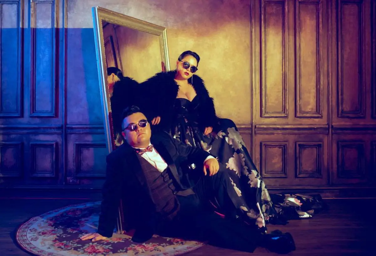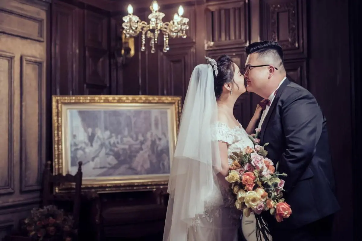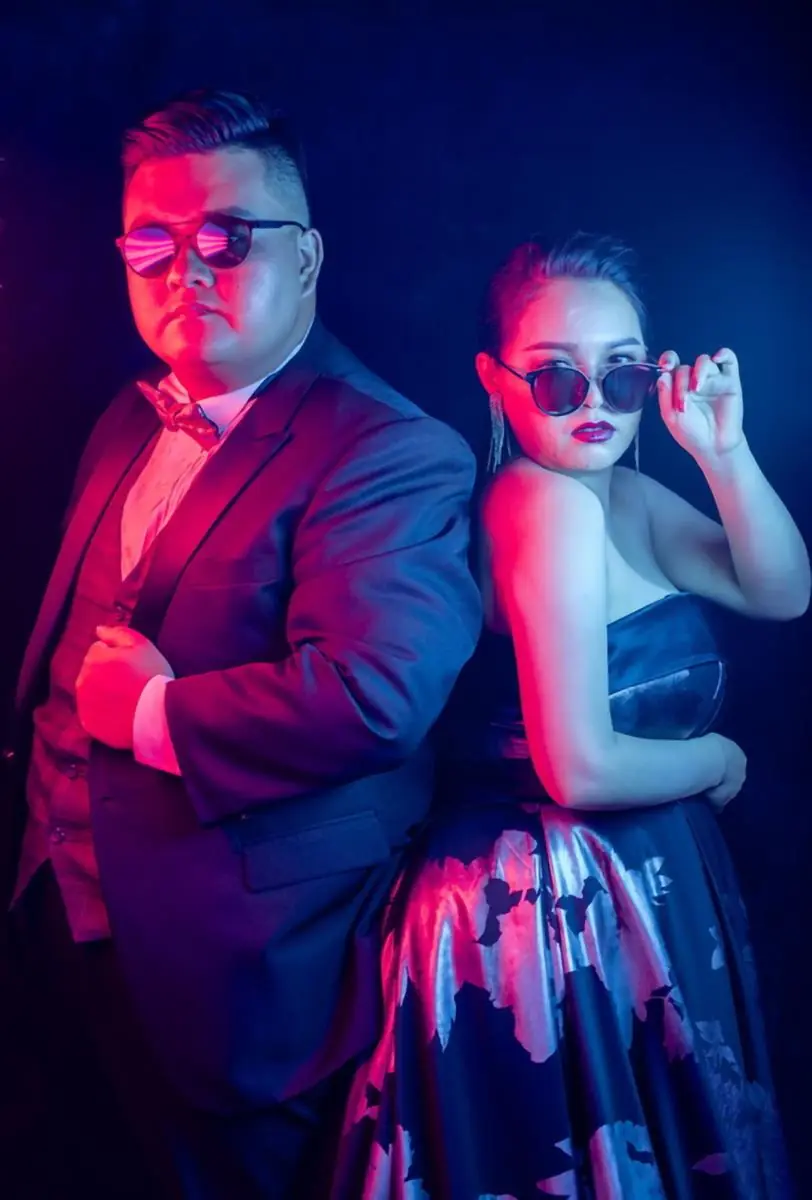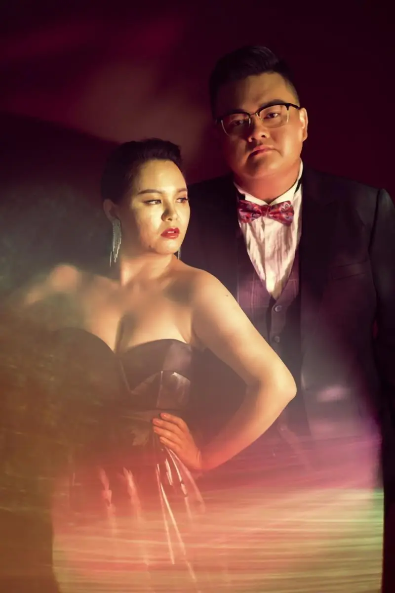 我稱這系列叫「傲嬌系列」,因為這個場景是我和老公記憶最深刻,拍攝時我也最放鬆,最入戲的場景,雅玲拿給我一副特殊眼鏡,聽到韋麟引導「這裡傲嬌就對了!再來,再來!」,我戲魂大開,幾乎是連拍式的投入,復古場景,經典黑西裝加白紗,搭配暗黃復古的燈光,衝突感的恐龍是老公一早隨手選的道具,在攝影師和造型師都覺得恐龍和我們選的場景不搭之下,還是半說半笑的叫他放回去,這一早的插曲這也是最讓我們當天最有記憶點的故事,原本就沒有把這件事放在心上的我們,在外拍回到棚內後,竟然看到韋麟和雅玲已架設好場景,突然請老公帶著恐龍過去,圓了老公的夢,謝謝雅玲給我神來一筆的眼鏡,又站在狹小的百葉窗外耐心持燈,等待我過戲精的癮,謝謝韋麟把這麼唯小的插曲放在心上,讓我們很感動。