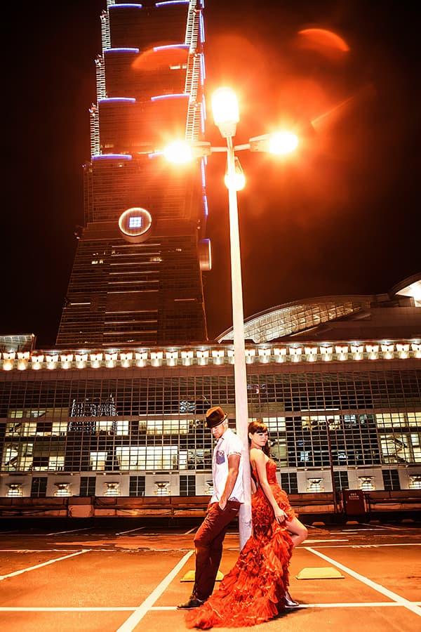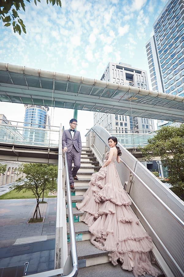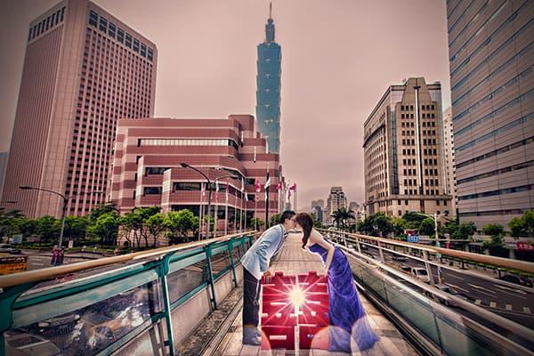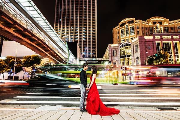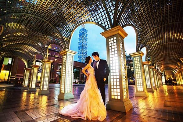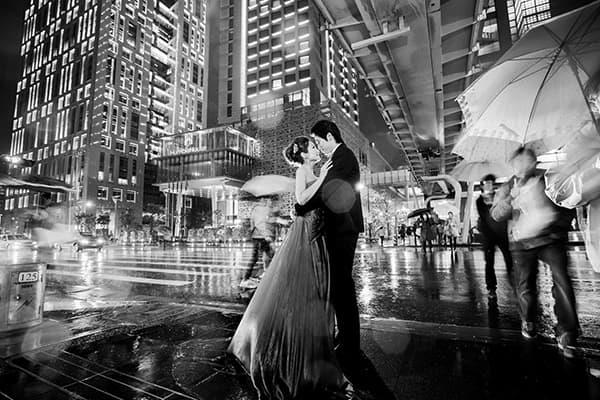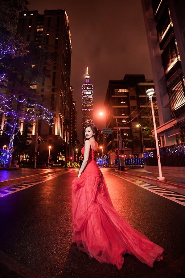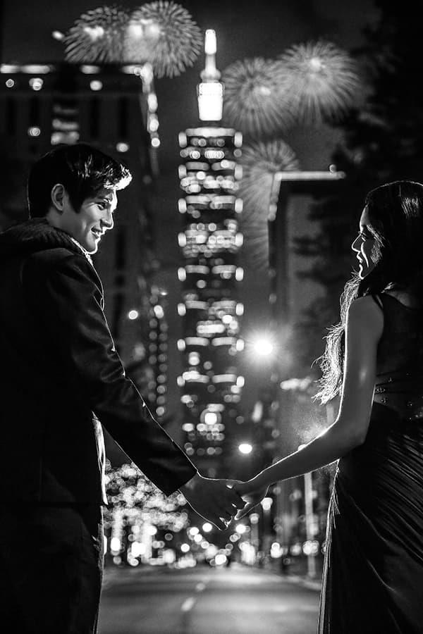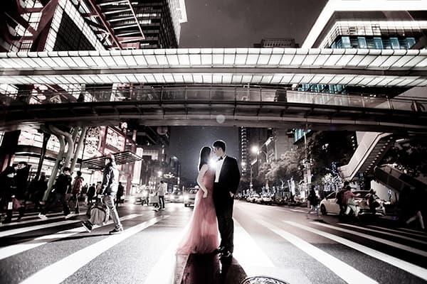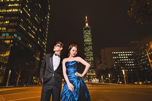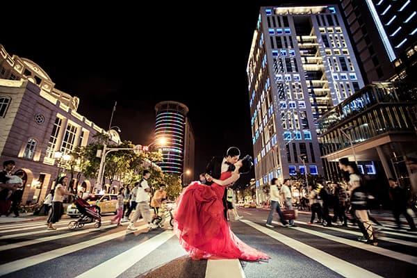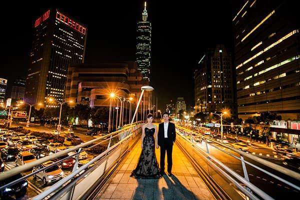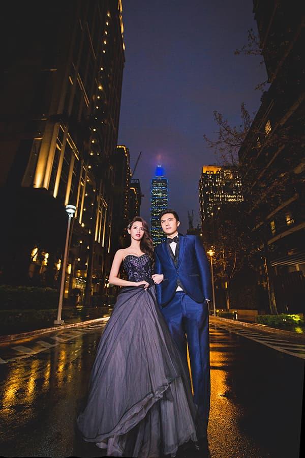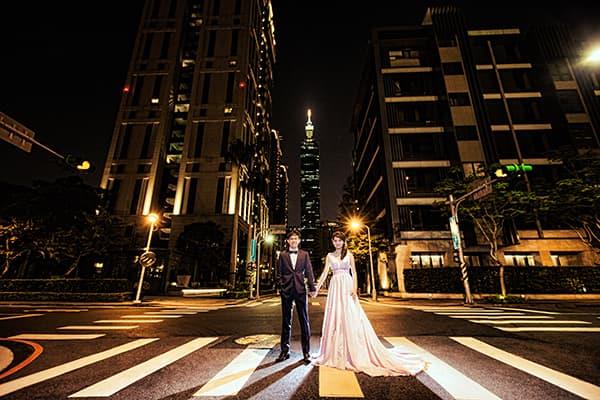 在城市的璀璨夜色裡,信義區以它的摩天輪廓與光影節奏,成為台北最具都會感的浪漫舞台。高樓林立間閃爍的燈光,倒映在新人純白的禮服上,彷彿將愛情包裹進整座城市的心跳。穿越人潮與車流,他們在斑馬線中央相擁,背後是信義大道的華麗與節奏;在台北101的光影下,每一次擁抱都顯得格外深刻。這裡的夜不只是燈火通明,更是一種屬於現代戀人的詩意——時尚、真實、閃耀。信義區的夜景,讓愛在城市的脈動裡閃爍成永恆。