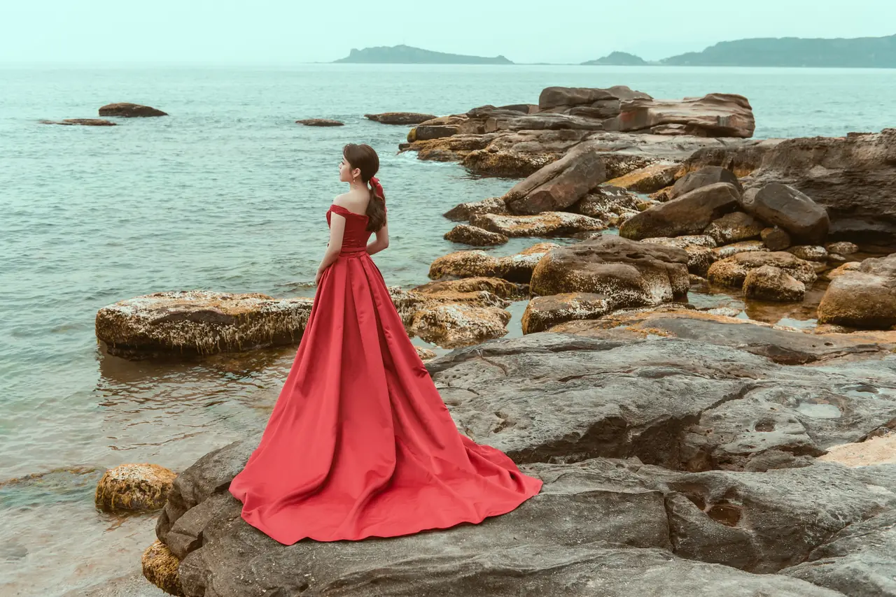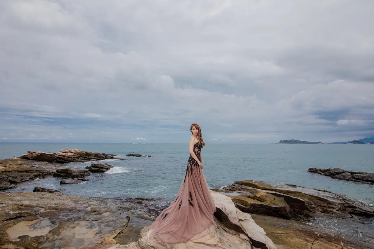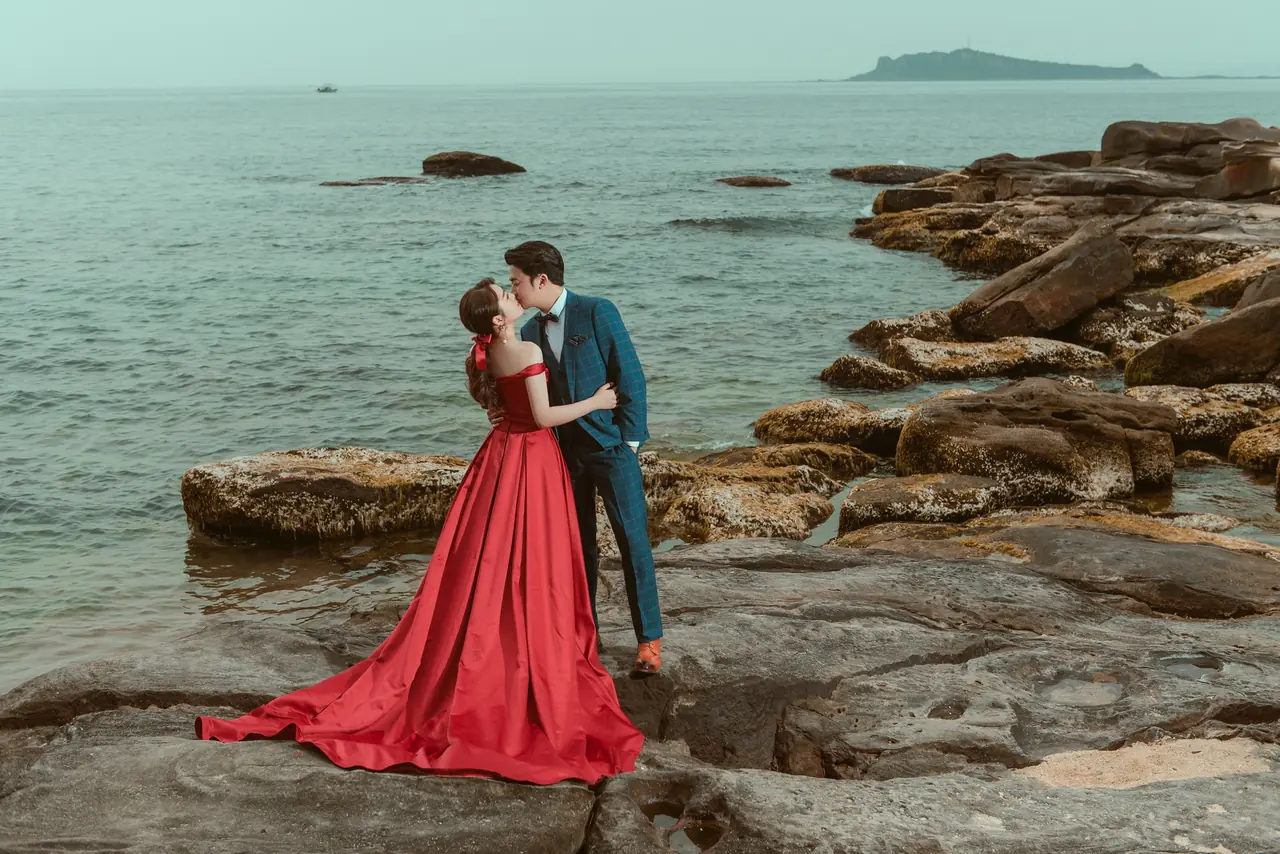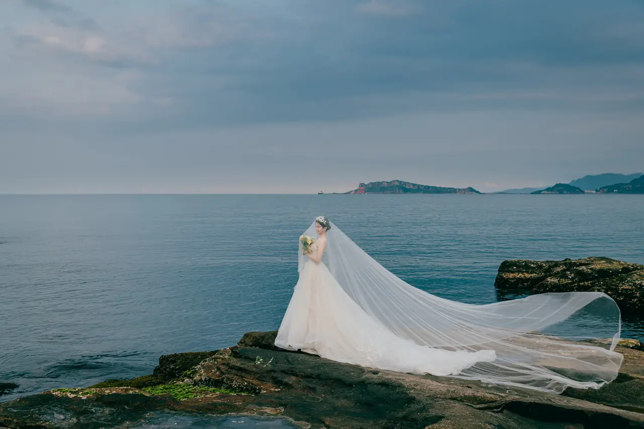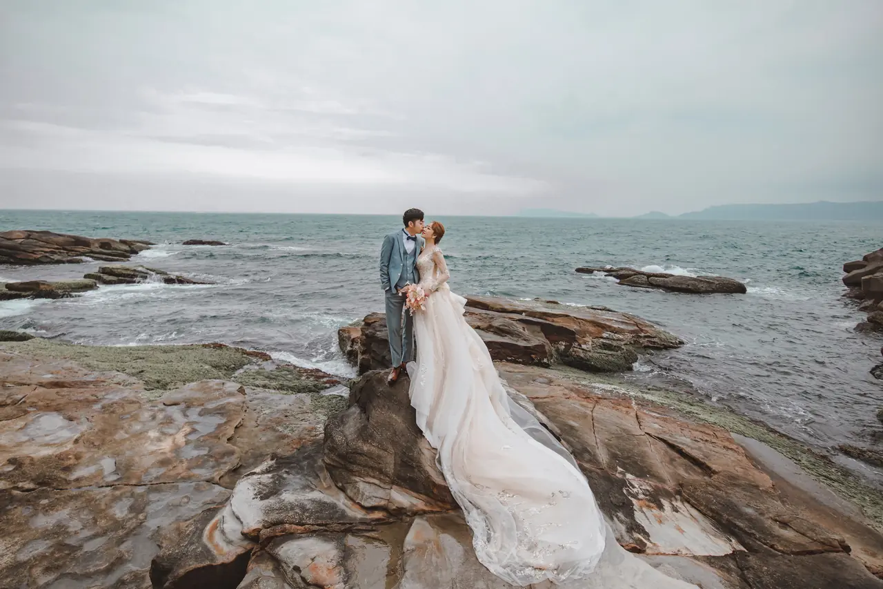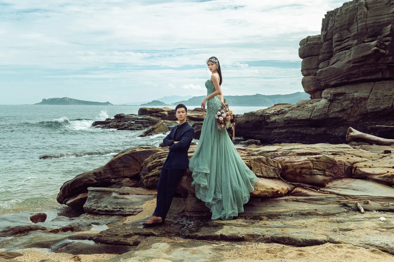 水尾漁港,是許多新人心中的婚紗秘境。沿著防波堤的小木棧道拾級而上,牽手漫步,穿過宛若一線天的岩縫,碧海與奇岩鋪展眼前;路面不滑卻有高低落差,偶有浪花拍濕鞋尖,建議著好走的球鞋,國小以上孩子與行動力佳的長輩多能同行。延線可接獅頭山公園步道,途中平台設有乾淨公廁,還可一路抵達金山遊客中心。天晴時海水透澈、天空湛藍,遠方成雙的海上奇岩與港邊光影相依,是白紗與藍海最溫柔的背景。拍攝建議選清晨或黃昏的柔光,善用岩壁縫隙、潮汐線與步道轉折構圖;平日與退潮時段更從容,也請留意浪況與濕滑處。