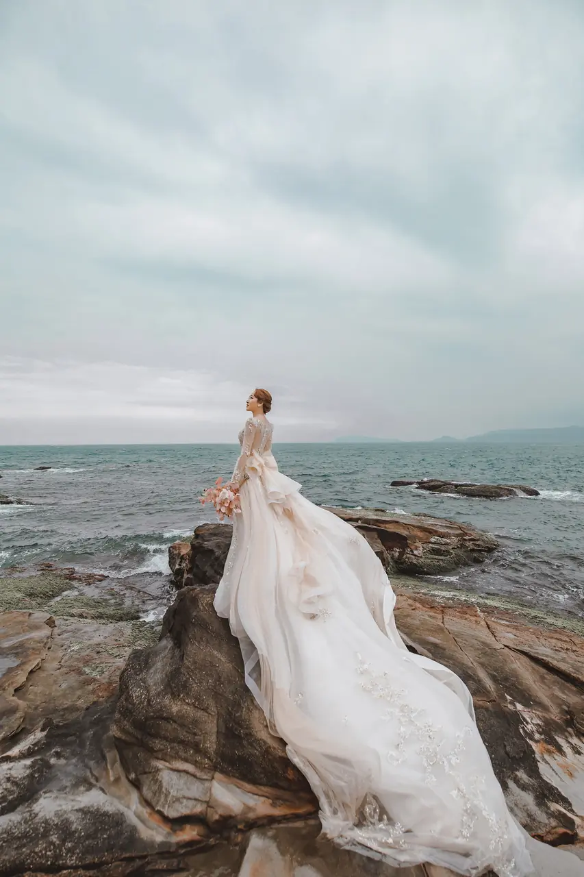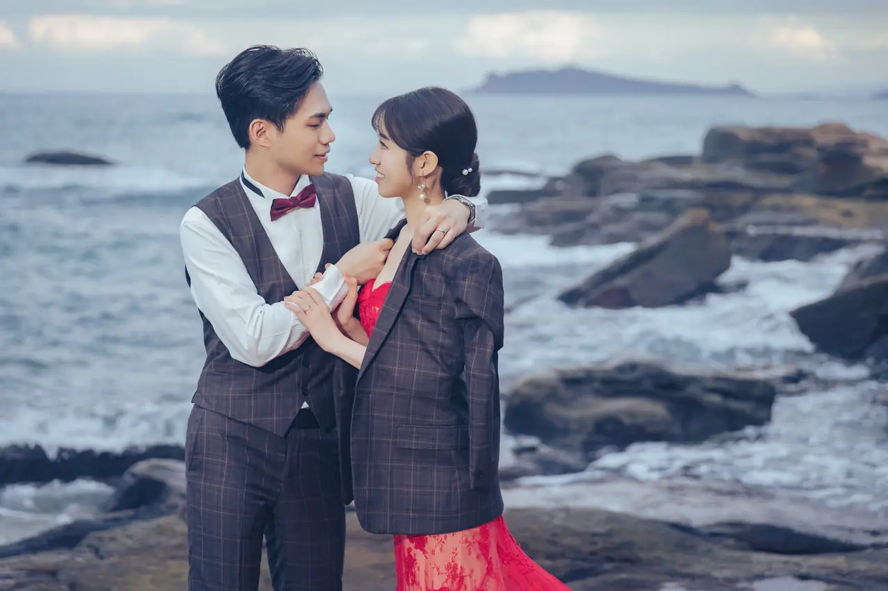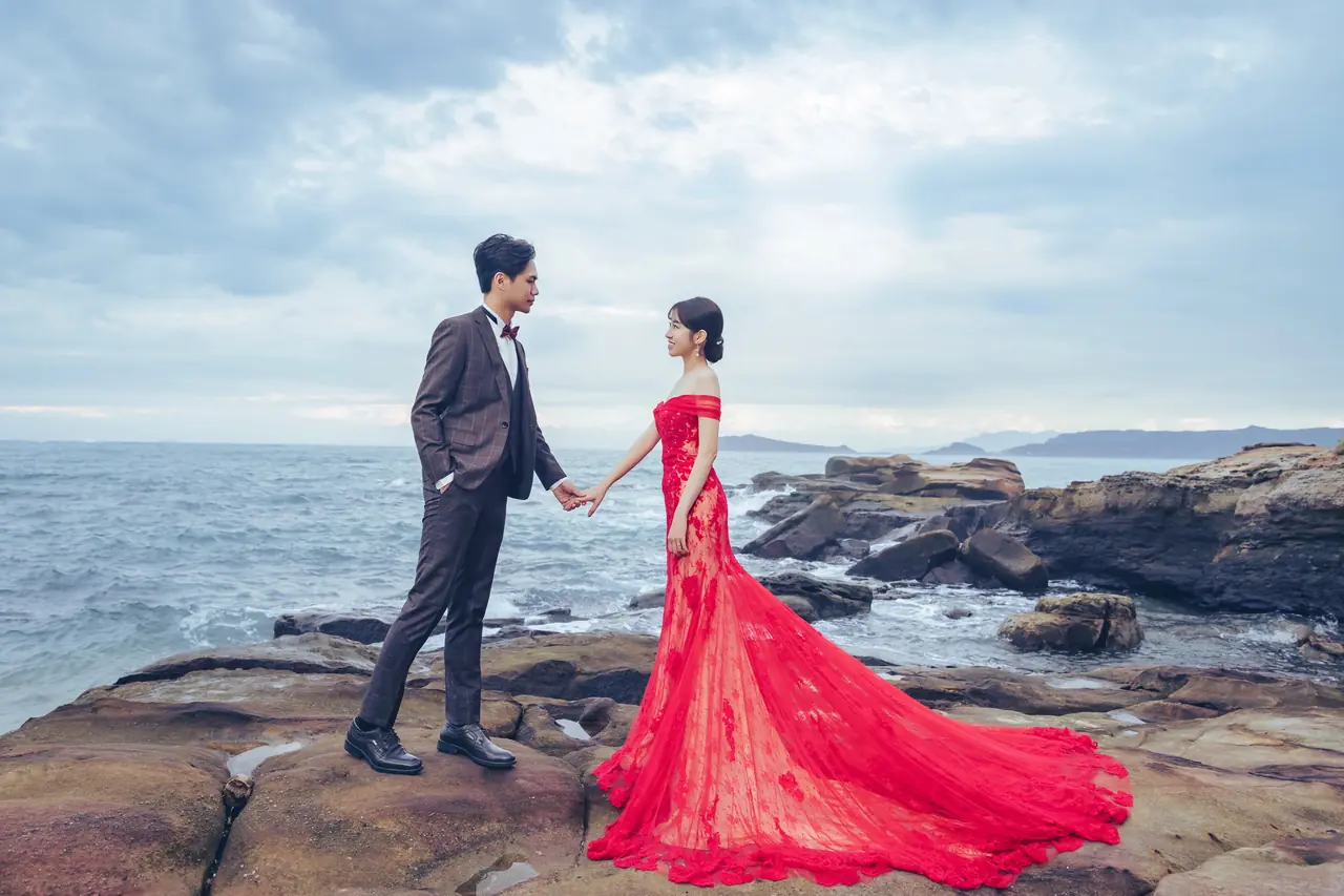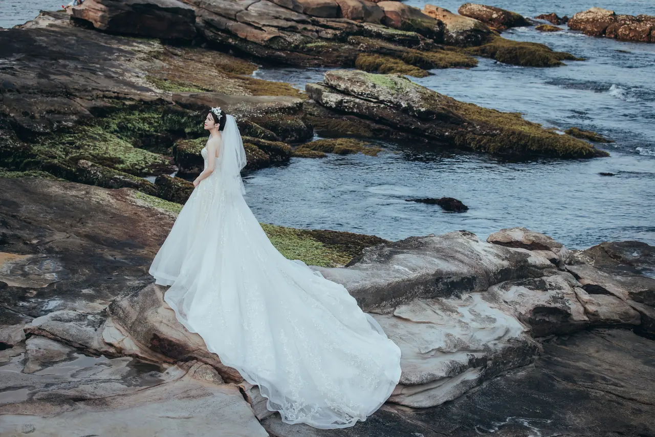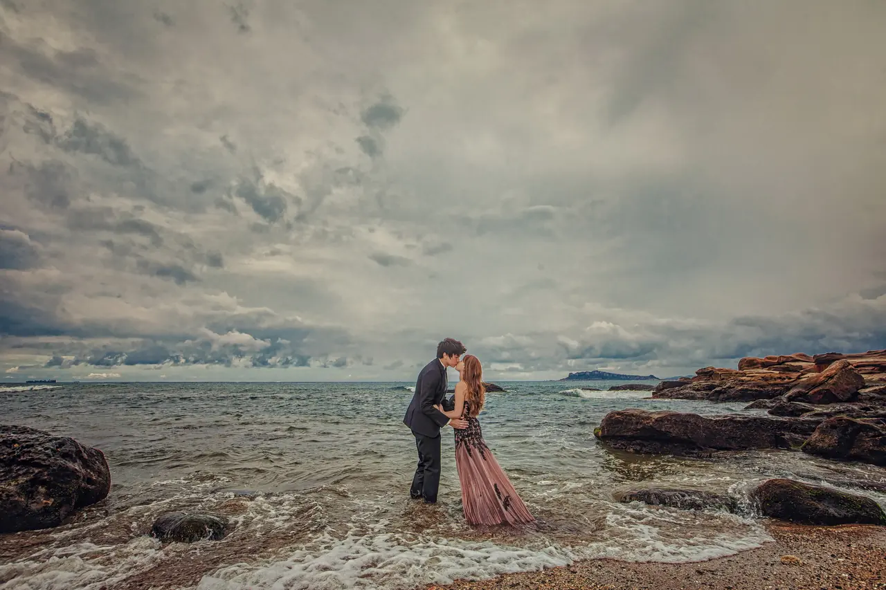 水尾漁港,是許多新人心中的婚紗秘境。沿著防波堤的小木棧道拾級而上,牽手漫步,穿過宛若一線天的岩縫,碧海與奇岩鋪展眼前;路面不滑卻有高低落差,偶有浪花拍濕鞋尖,建議著好走的球鞋,國小以上孩子與行動力佳的長輩多能同行。延線可接獅頭山公園步道,途中平台設有乾淨公廁,還可一路抵達金山遊客中心。天晴時海水透澈、天空湛藍,遠方成雙的海上奇岩與港邊光影相依,是白紗與藍海最溫柔的背景。拍攝建議選清晨或黃昏的柔光,善用岩壁縫隙、潮汐線與步道轉折構圖;平日與退潮時段更從容,也請留意浪況與濕滑處。