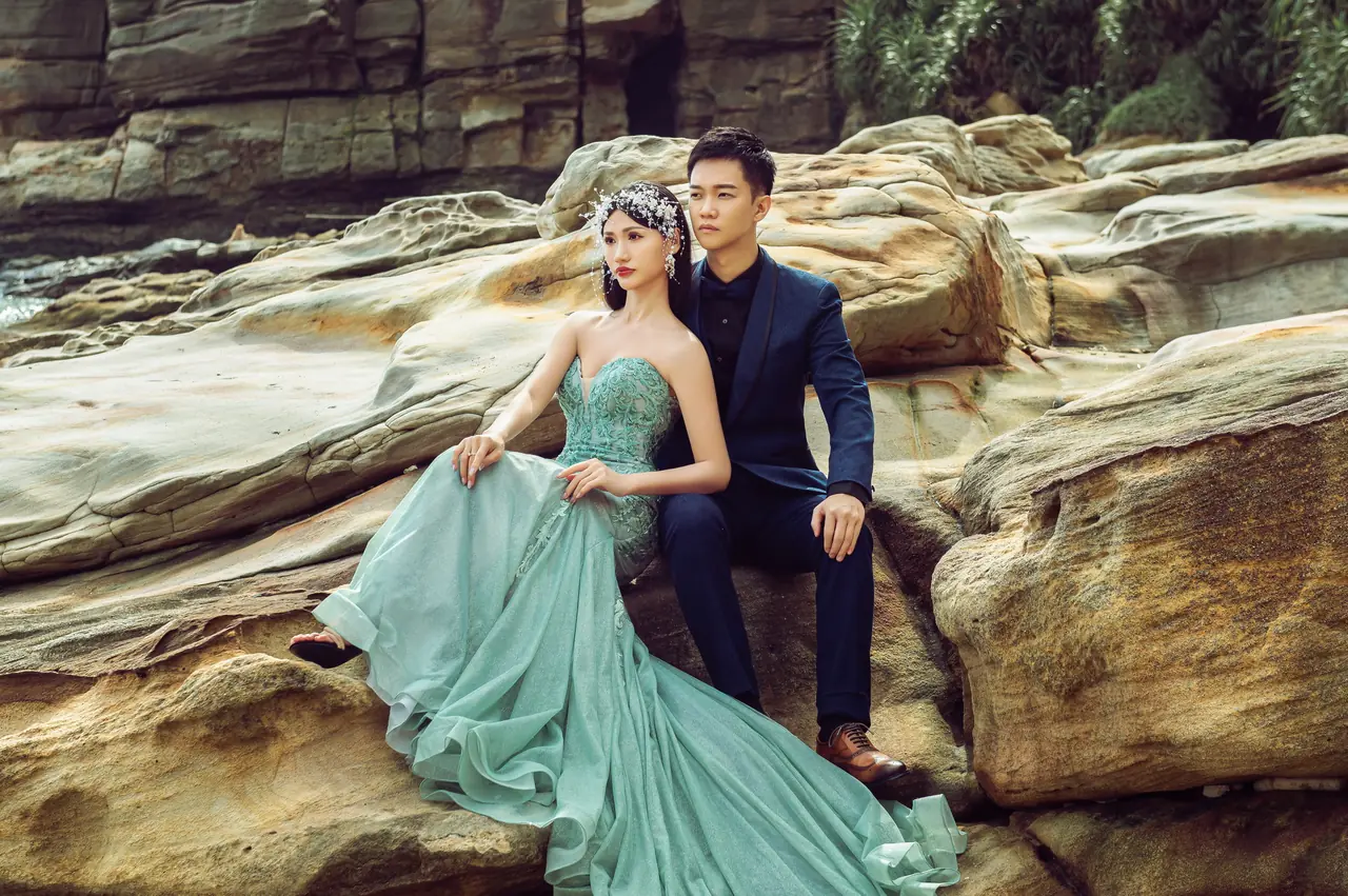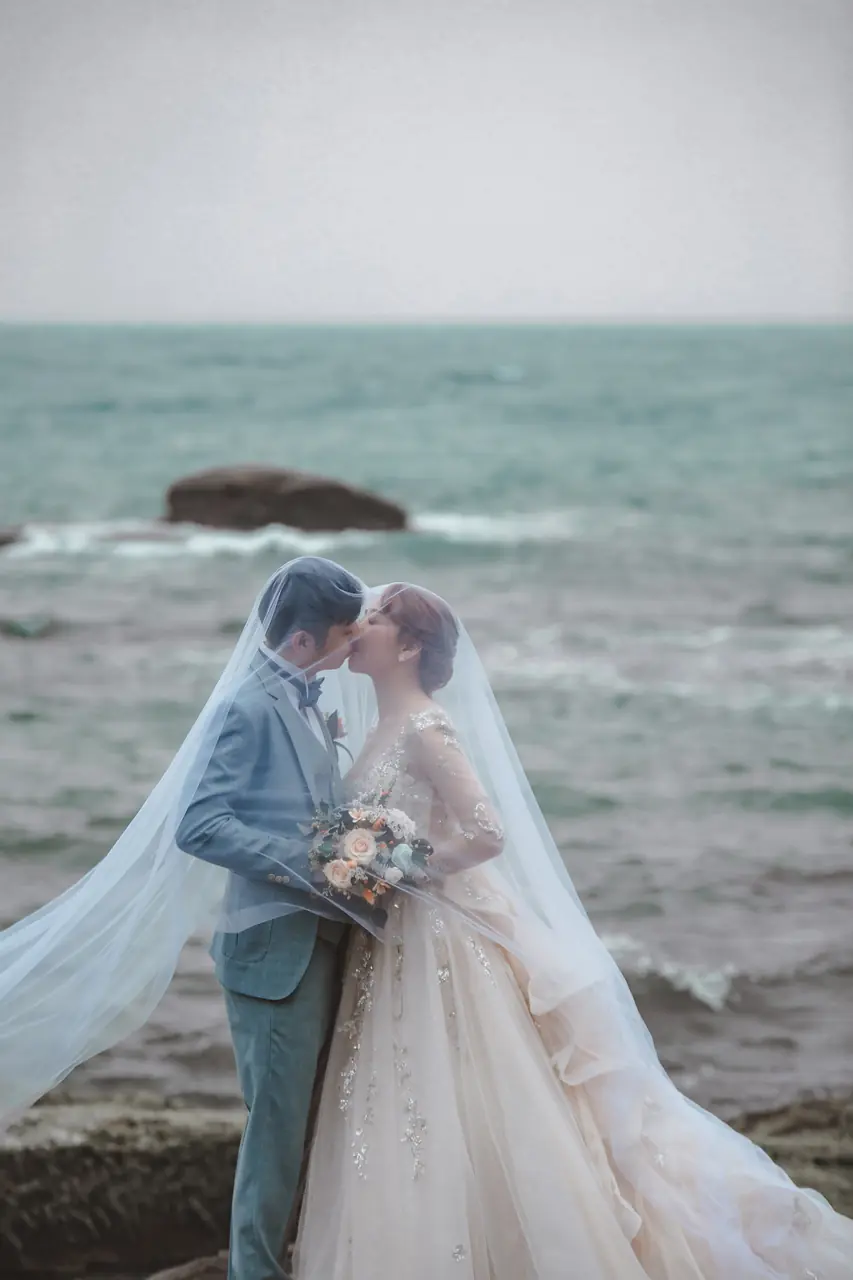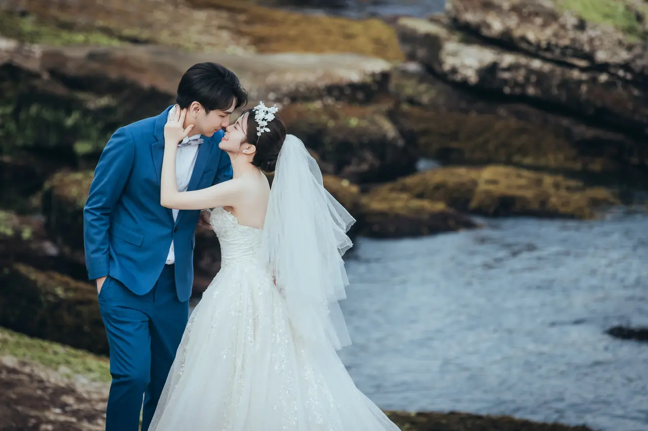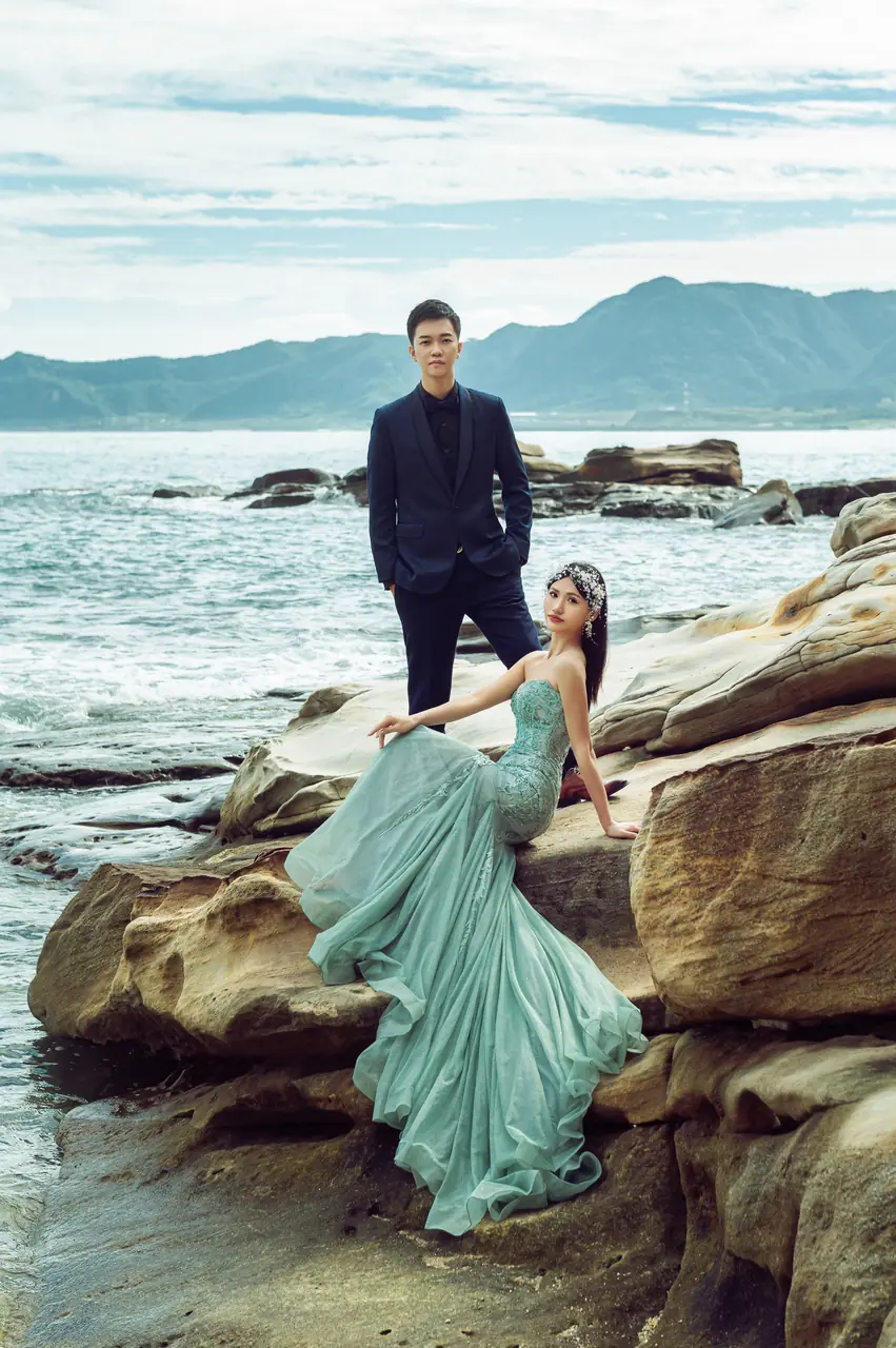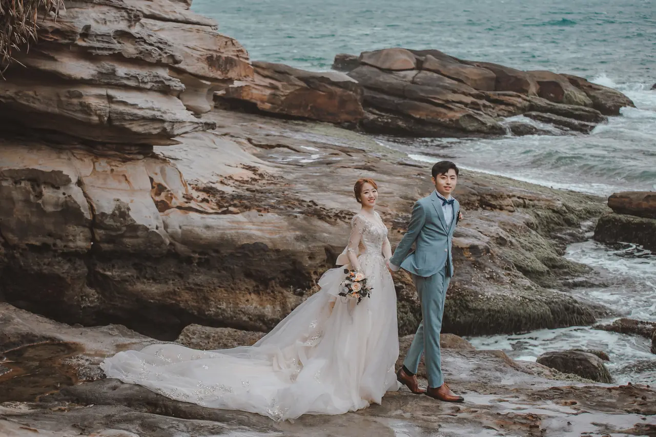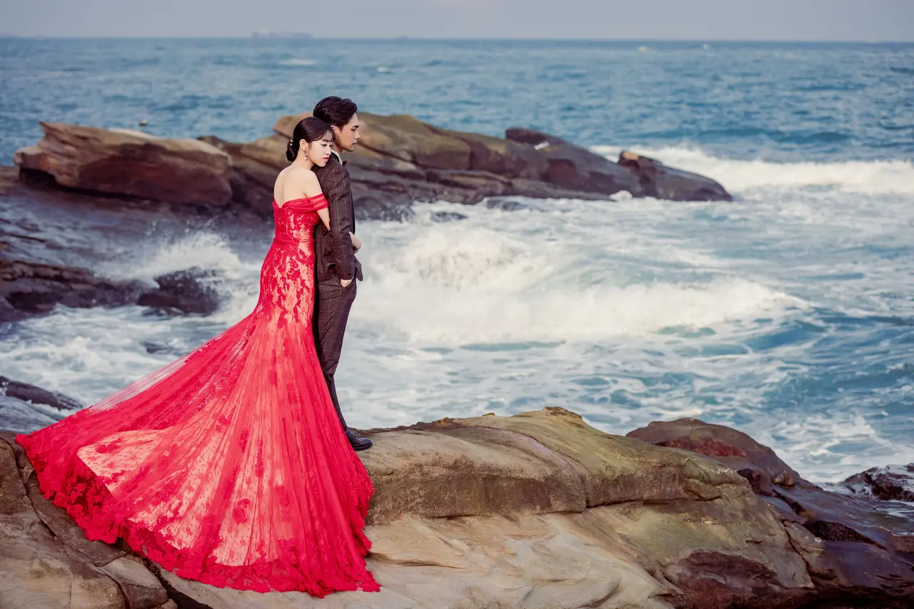 水尾漁港,是許多新人心中的婚紗秘境。沿著防波堤的小木棧道拾級而上,牽手漫步,穿過宛若一線天的岩縫,碧海與奇岩鋪展眼前;路面不滑卻有高低落差,偶有浪花拍濕鞋尖,建議著好走的球鞋,國小以上孩子與行動力佳的長輩多能同行。延線可接獅頭山公園步道,途中平台設有乾淨公廁,還可一路抵達金山遊客中心。天晴時海水透澈、天空湛藍,遠方成雙的海上奇岩與港邊光影相依,是白紗與藍海最溫柔的背景。拍攝建議選清晨或黃昏的柔光,善用岩壁縫隙、潮汐線與步道轉折構圖;平日與退潮時段更從容,也請留意浪況與濕滑處。