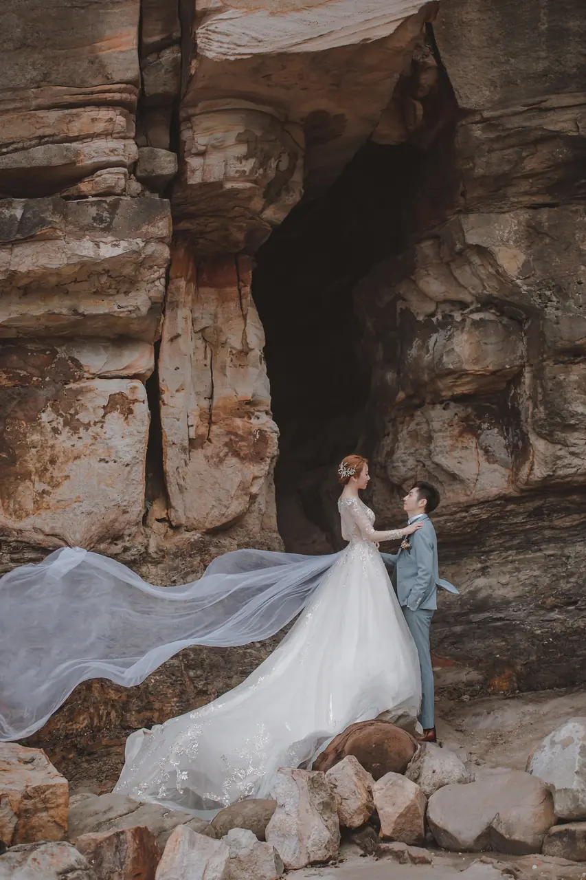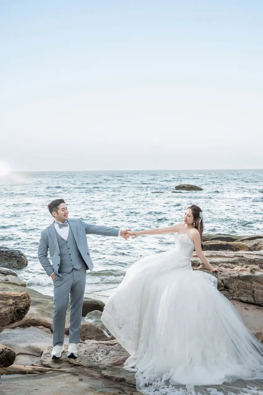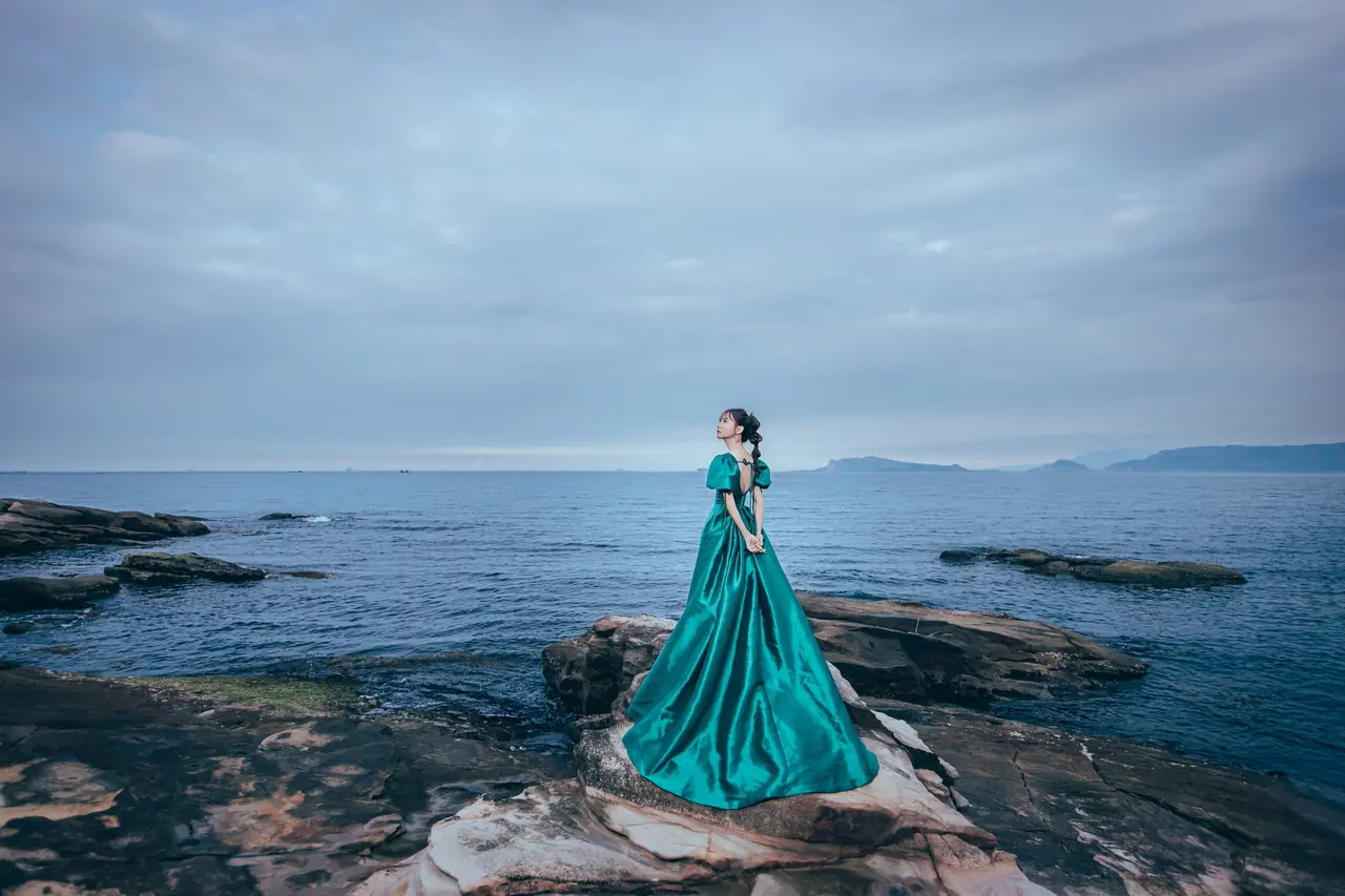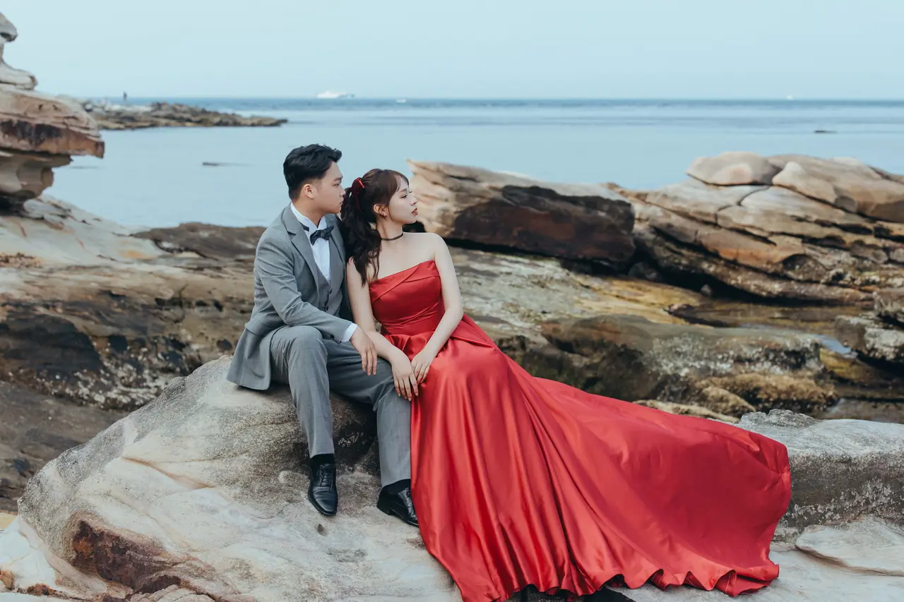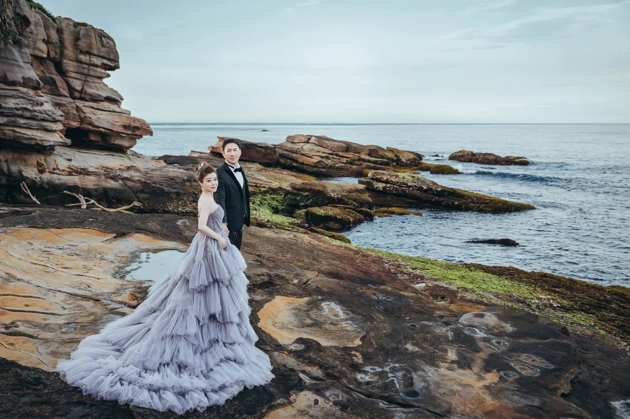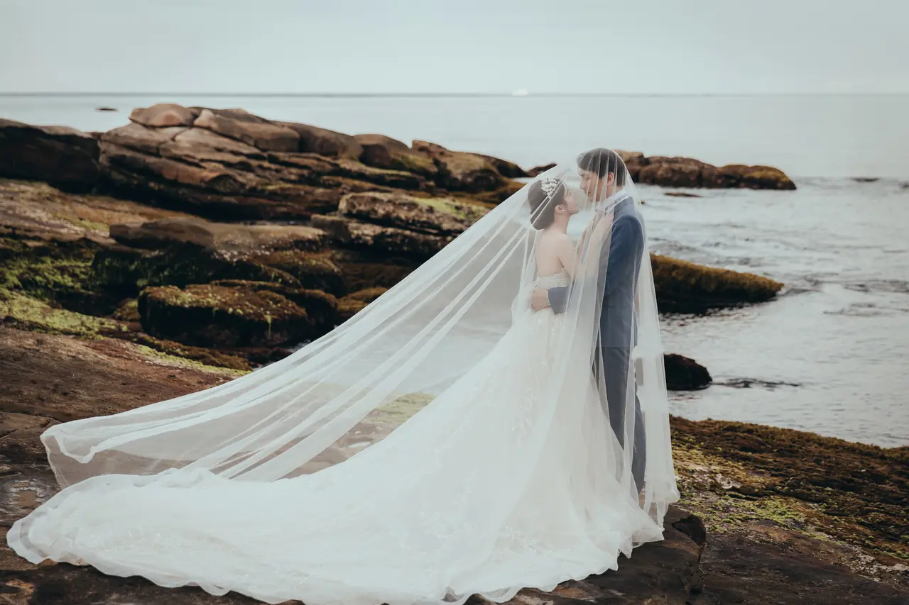 水尾漁港,是許多新人心中的婚紗秘境。沿著防波堤的小木棧道拾級而上,牽手漫步,穿過宛若一線天的岩縫,碧海與奇岩鋪展眼前;路面不滑卻有高低落差,偶有浪花拍濕鞋尖,建議著好走的球鞋,國小以上孩子與行動力佳的長輩多能同行。延線可接獅頭山公園步道,途中平台設有乾淨公廁,還可一路抵達金山遊客中心。天晴時海水透澈、天空湛藍,遠方成雙的海上奇岩與港邊光影相依,是白紗與藍海最溫柔的背景。拍攝建議選清晨或黃昏的柔光,善用岩壁縫隙、潮汐線與步道轉折構圖;平日與退潮時段更從容,也請留意浪況與濕滑處。