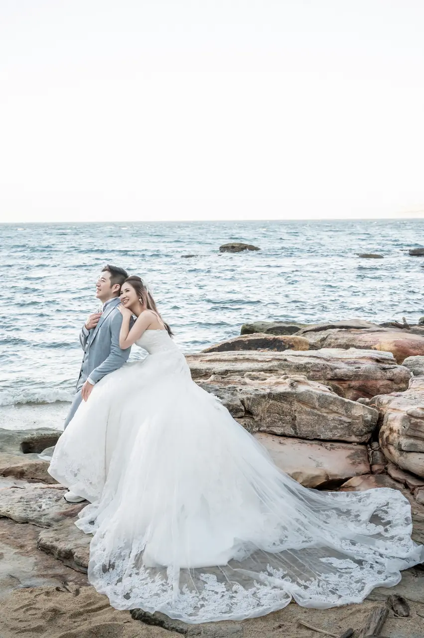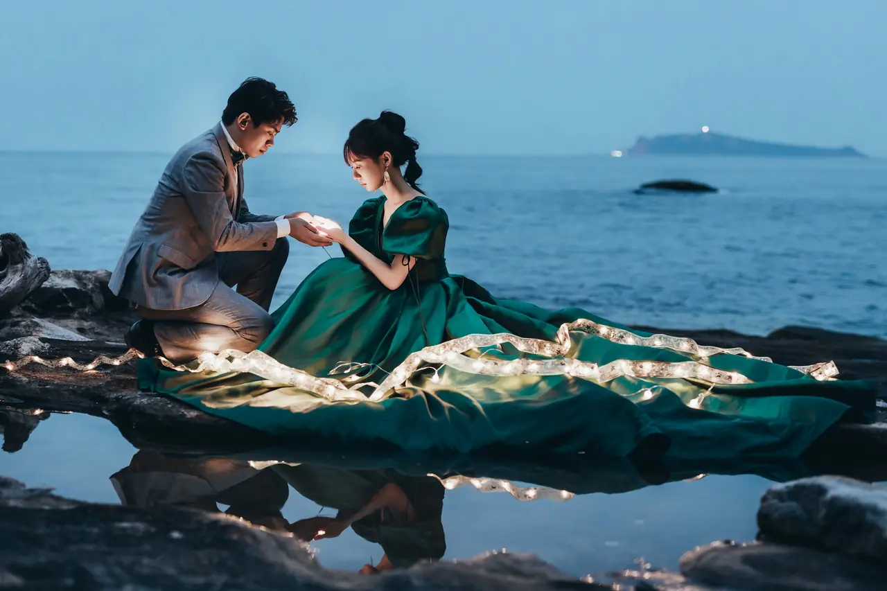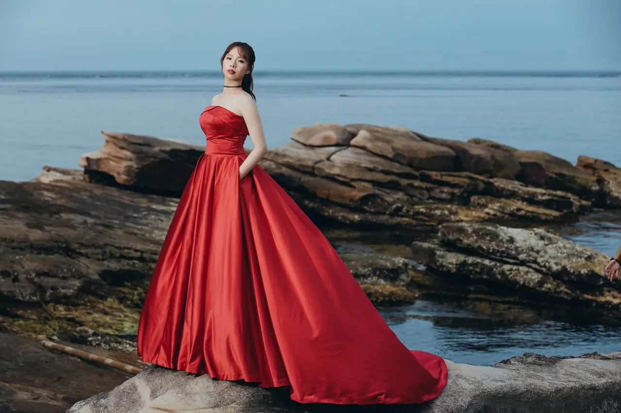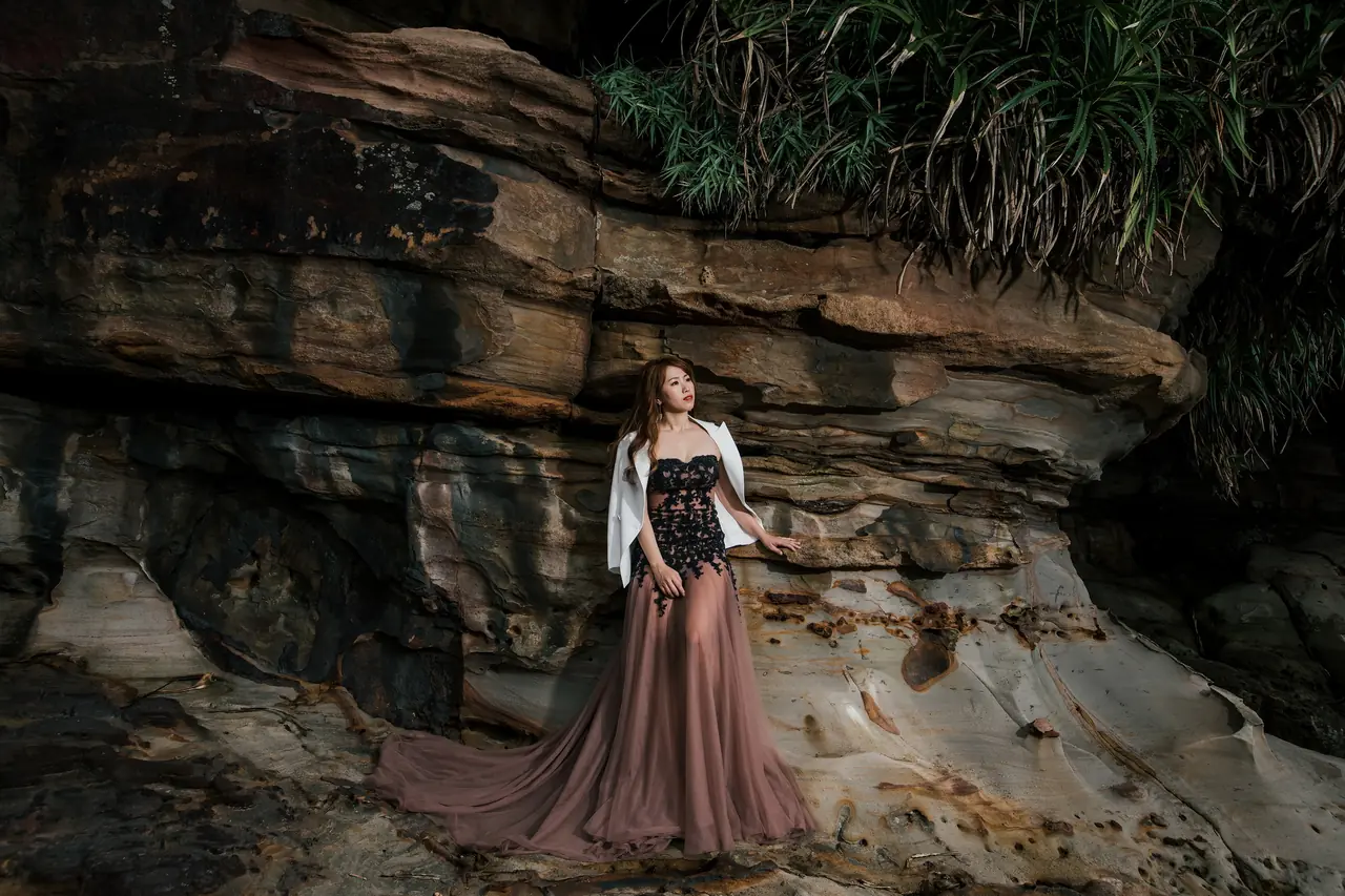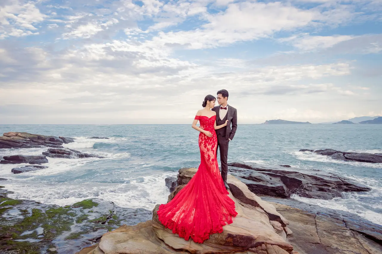 水尾漁港,是許多新人心中的婚紗秘境。沿著防波堤的小木棧道拾級而上,牽手漫步,穿過宛若一線天的岩縫,碧海與奇岩鋪展眼前;路面不滑卻有高低落差,偶有浪花拍濕鞋尖,建議著好走的球鞋,國小以上孩子與行動力佳的長輩多能同行。延線可接獅頭山公園步道,途中平台設有乾淨公廁,還可一路抵達金山遊客中心。天晴時海水透澈、天空湛藍,遠方成雙的海上奇岩與港邊光影相依,是白紗與藍海最溫柔的背景。拍攝建議選清晨或黃昏的柔光,善用岩壁縫隙、潮汐線與步道轉折構圖;平日與退潮時段更從容,也請留意浪況與濕滑處。