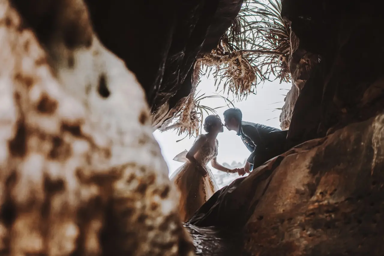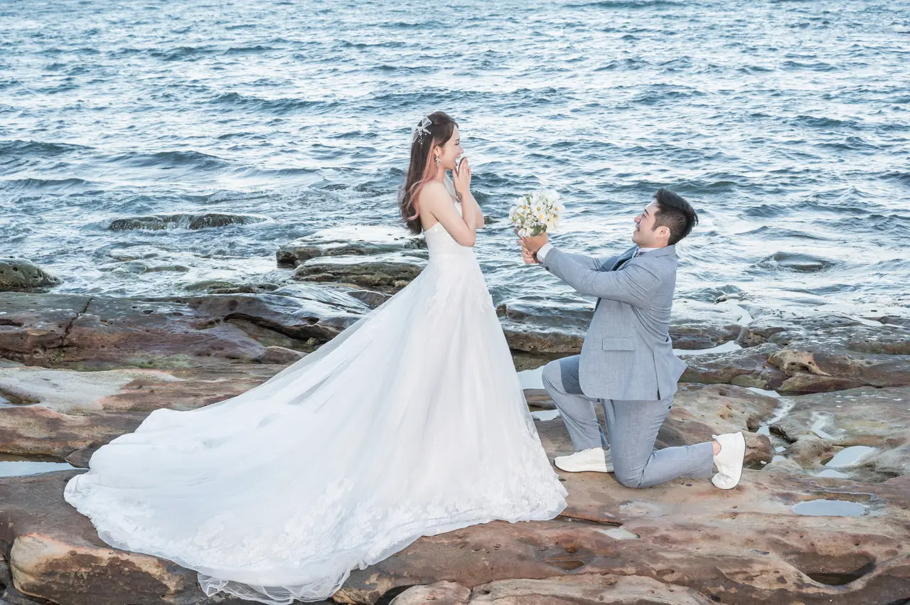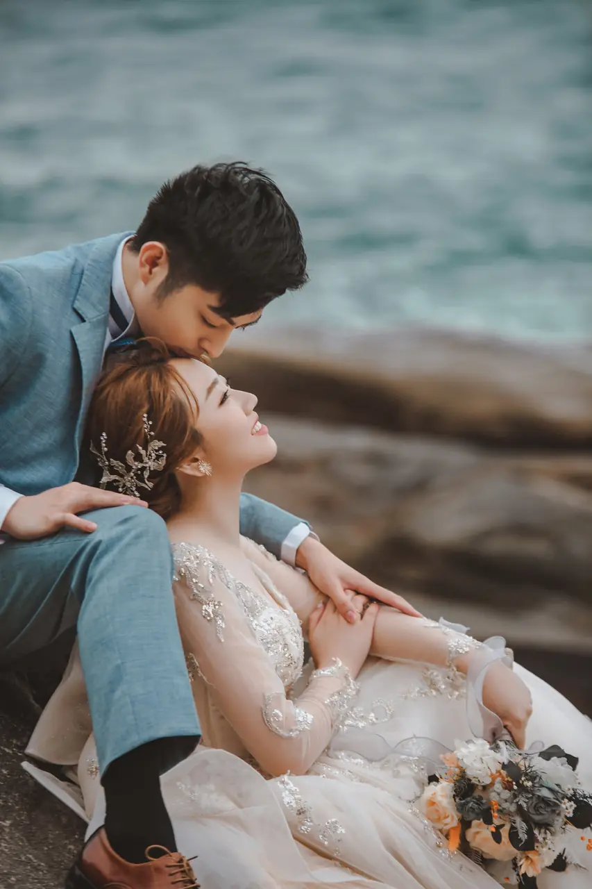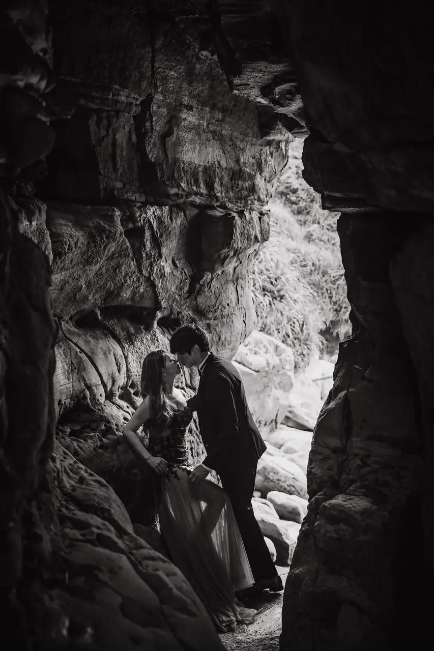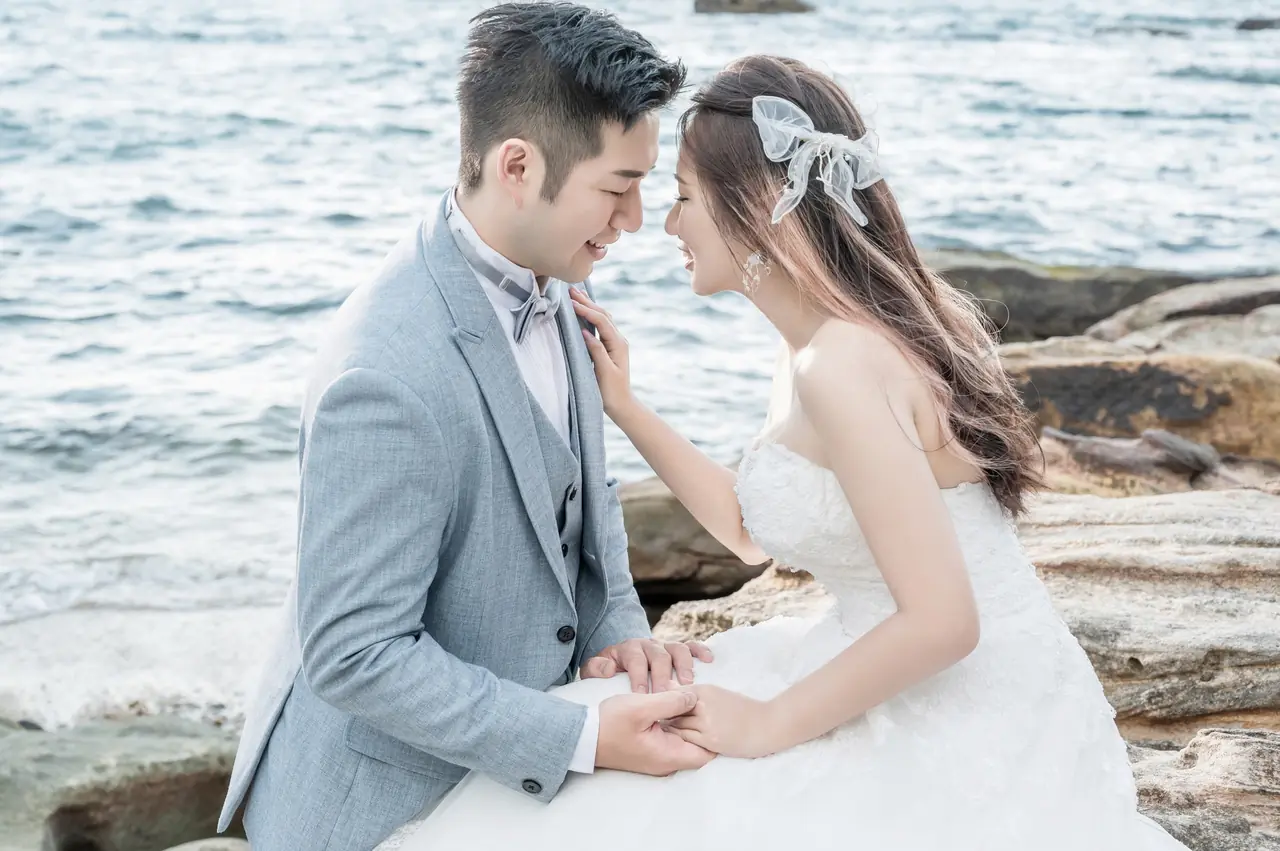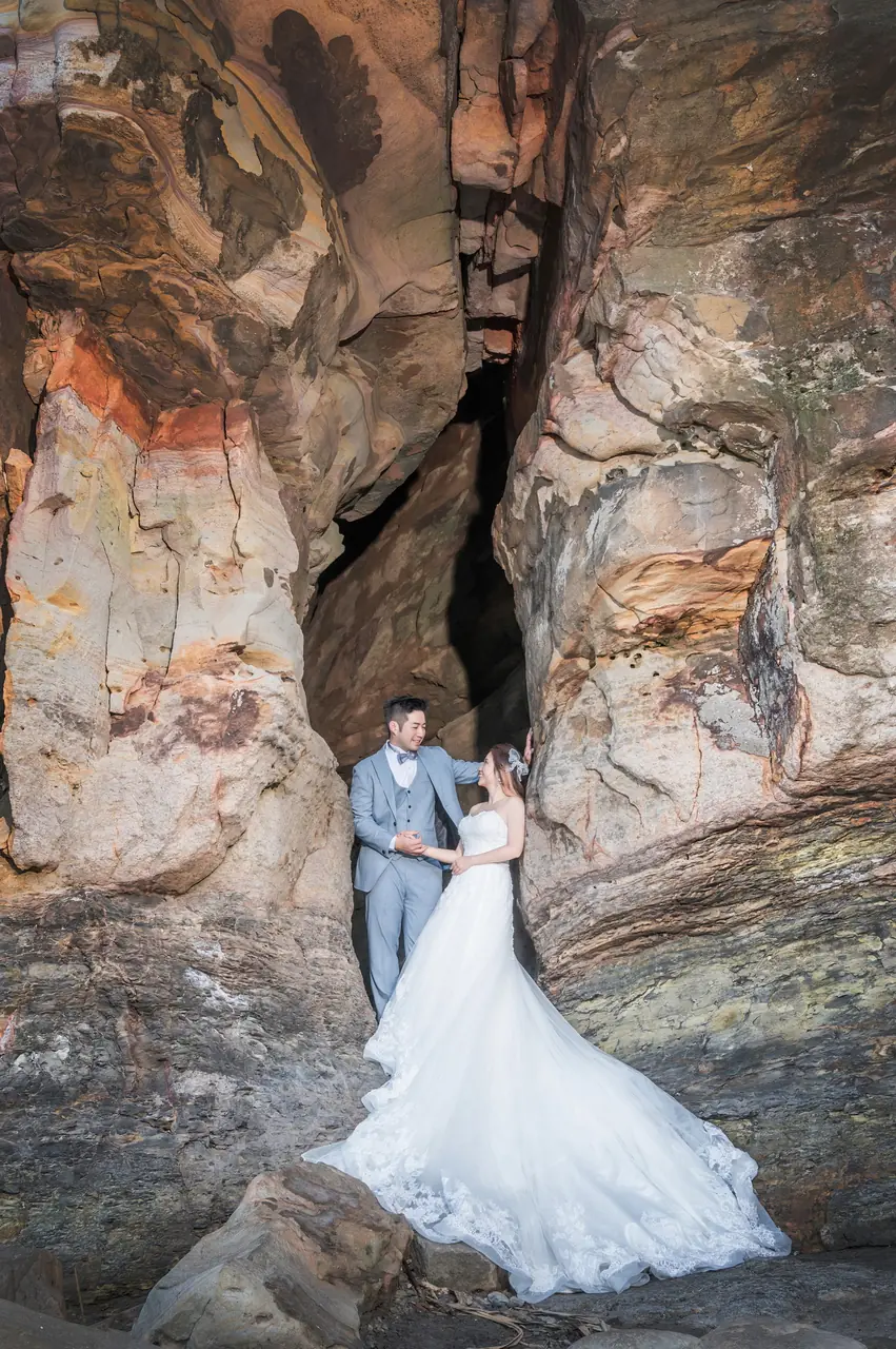 水尾漁港,是許多新人心中的婚紗秘境。沿著防波堤的小木棧道拾級而上,牽手漫步,穿過宛若一線天的岩縫,碧海與奇岩鋪展眼前;路面不滑卻有高低落差,偶有浪花拍濕鞋尖,建議著好走的球鞋,國小以上孩子與行動力佳的長輩多能同行。延線可接獅頭山公園步道,途中平台設有乾淨公廁,還可一路抵達金山遊客中心。天晴時海水透澈、天空湛藍,遠方成雙的海上奇岩與港邊光影相依,是白紗與藍海最溫柔的背景。拍攝建議選清晨或黃昏的柔光,善用岩壁縫隙、潮汐線與步道轉折構圖;平日與退潮時段更從容,也請留意浪況與濕滑處。