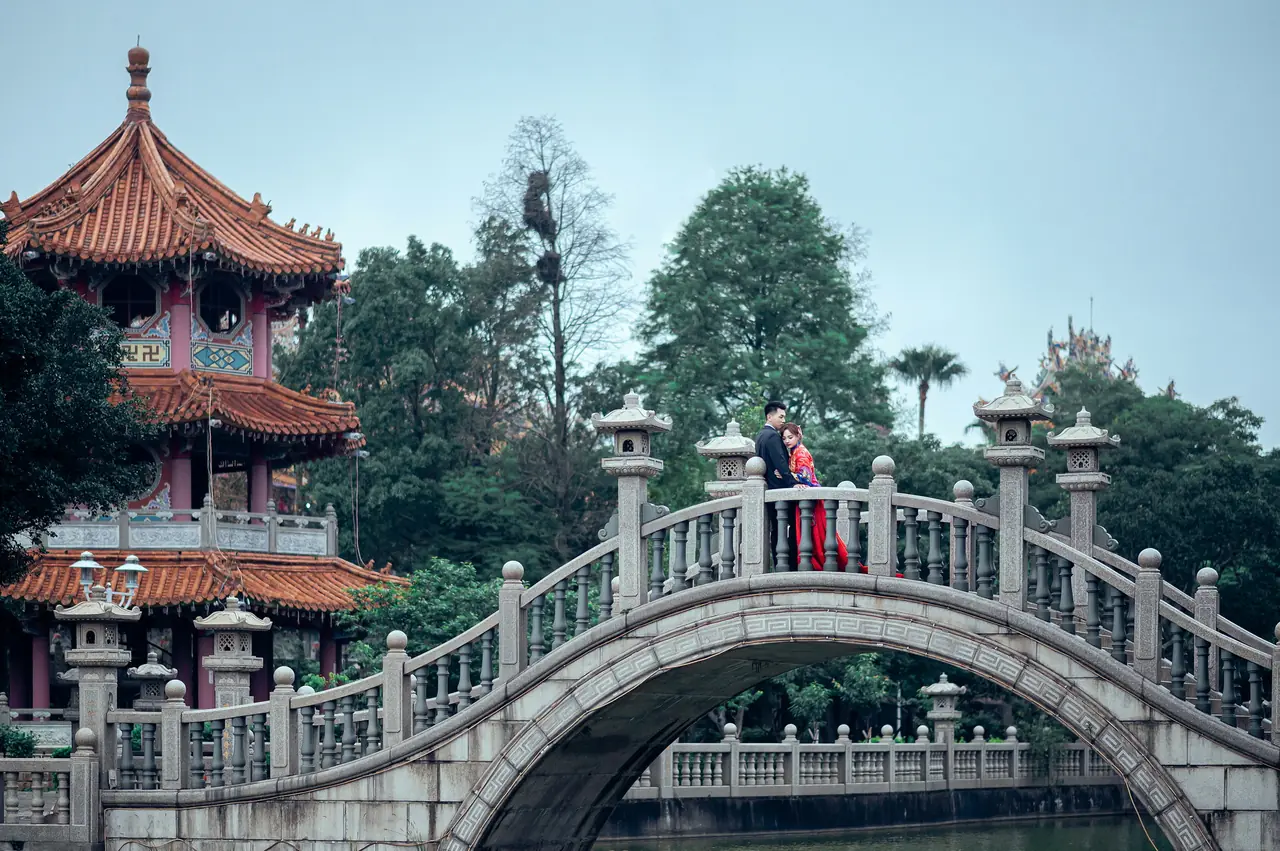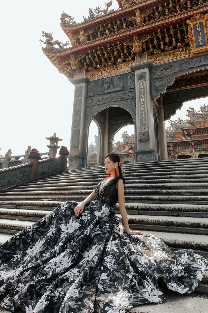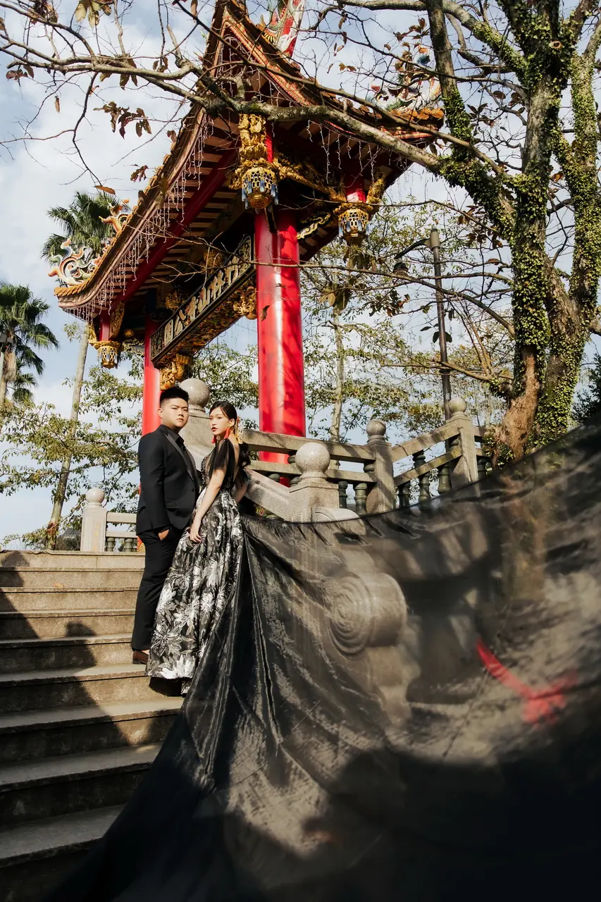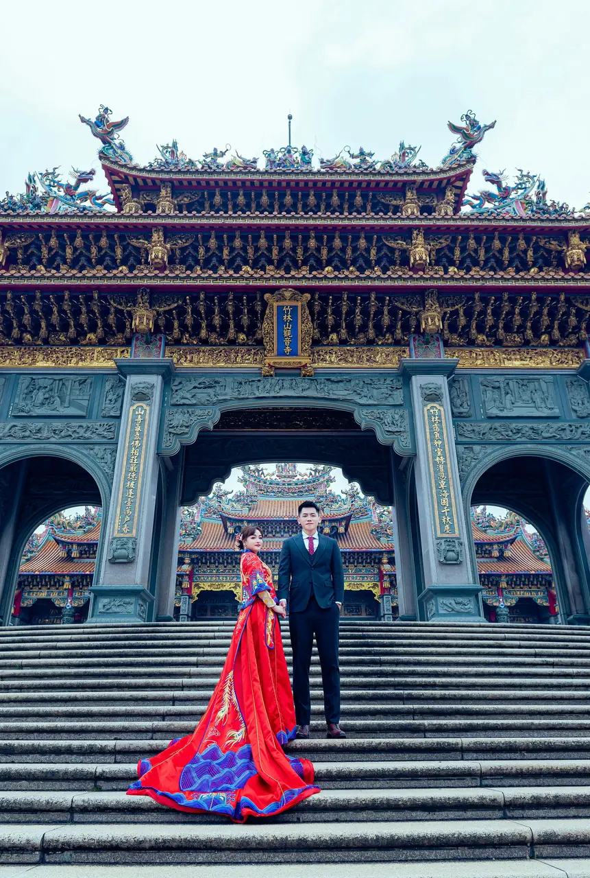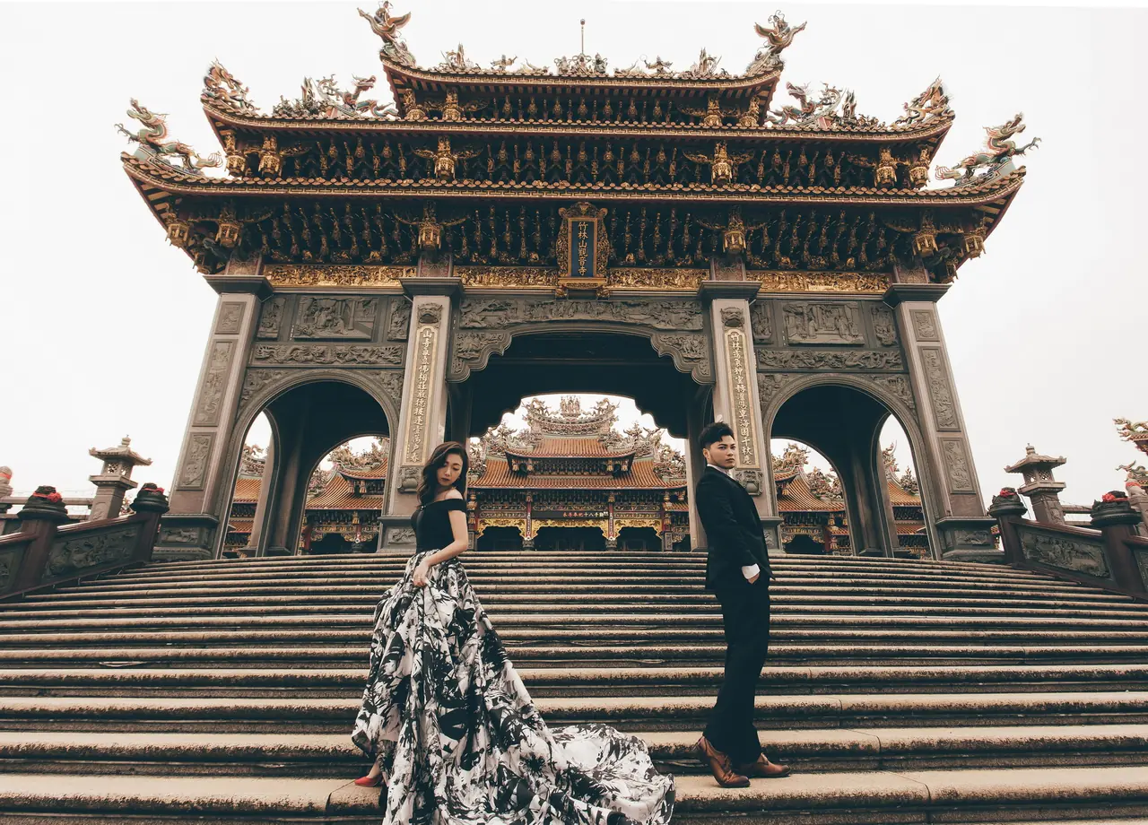 竹林山觀音寺,以重檐歇山的屋脊與雕樑畫棟勾勒中式雅韻;廟前近兩萬坪庭園延展,春日櫻色輕落,池畔有悠游小烏龜,成就溫柔畫框。新人相依漫步於長廊,光影從檐下流動,紅柱與千年樟木雕飾映出莊重與柔情。建議清晨或平日拍攝,避開香客與節慶人潮;週日與節慶偶有平安餐,氛圍熱鬧。可安排約兩小時取景,戶外園景、階梯、山門到廣場水面倒影皆是亮點。開車有免費與付費停車場;搭公車於頭湖入口下車步行約10分鐘。敬禮神域,鏡頭不阻動線,讓承諾在古韻中被溫柔包裹。