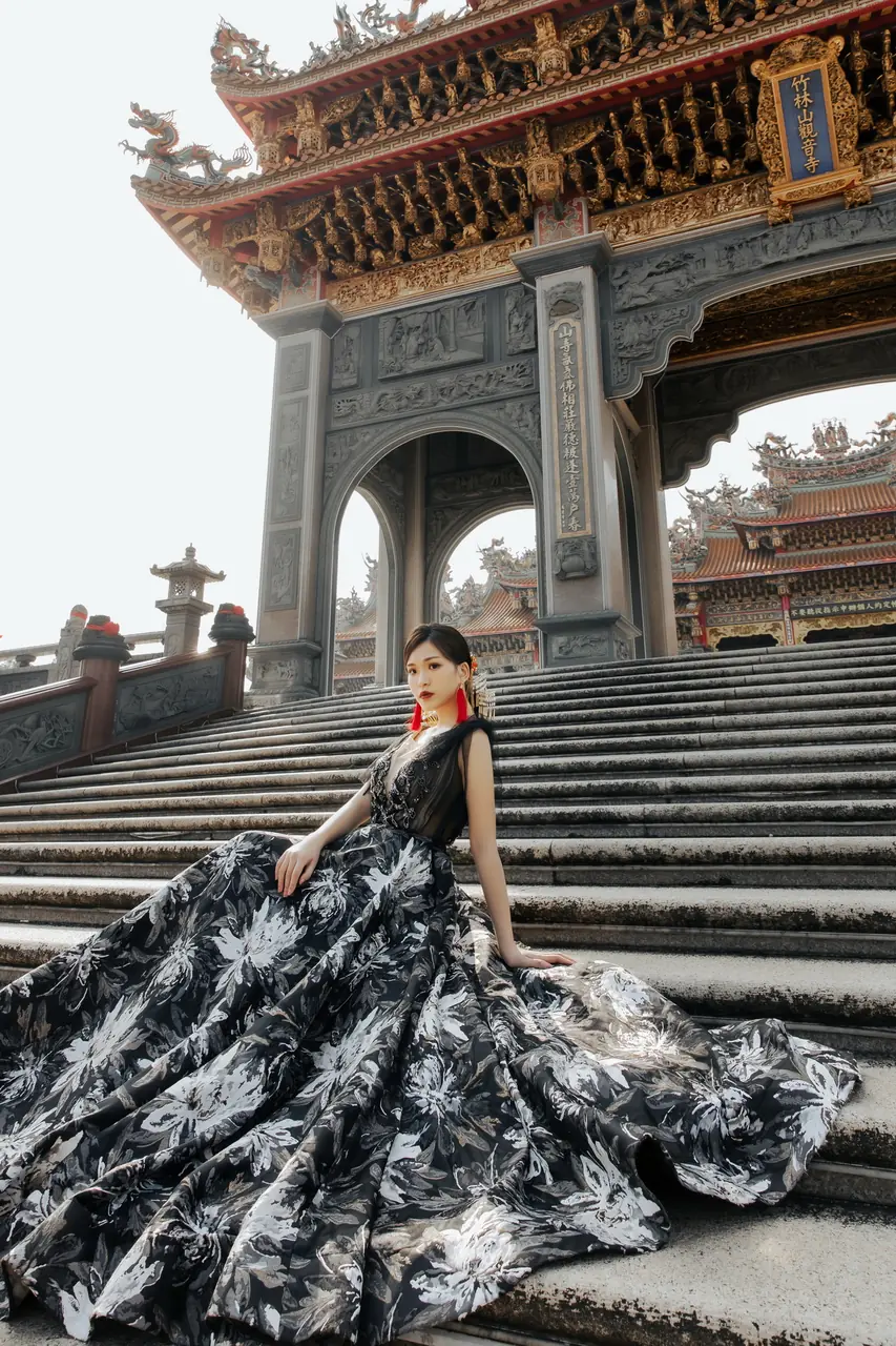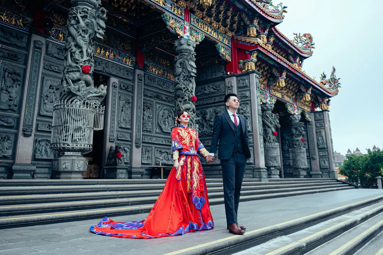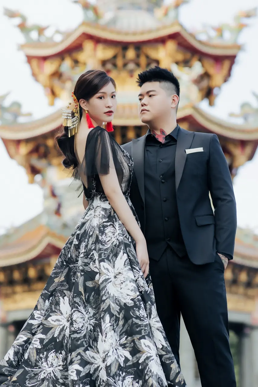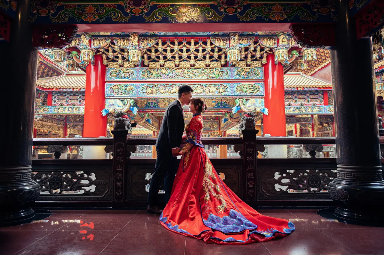 竹林山觀音寺,以重檐歇山的屋脊與雕樑畫棟勾勒中式雅韻;廟前近兩萬坪庭園延展,春日櫻色輕落,池畔有悠游小烏龜,成就溫柔畫框。新人相依漫步於長廊,光影從檐下流動,紅柱與千年樟木雕飾映出莊重與柔情。建議清晨或平日拍攝,避開香客與節慶人潮;週日與節慶偶有平安餐,氛圍熱鬧。可安排約兩小時取景,戶外園景、階梯、山門到廣場水面倒影皆是亮點。開車有免費與付費停車場;搭公車於頭湖入口下車步行約10分鐘。敬禮神域,鏡頭不阻動線,讓承諾在古韻中被溫柔包裹。