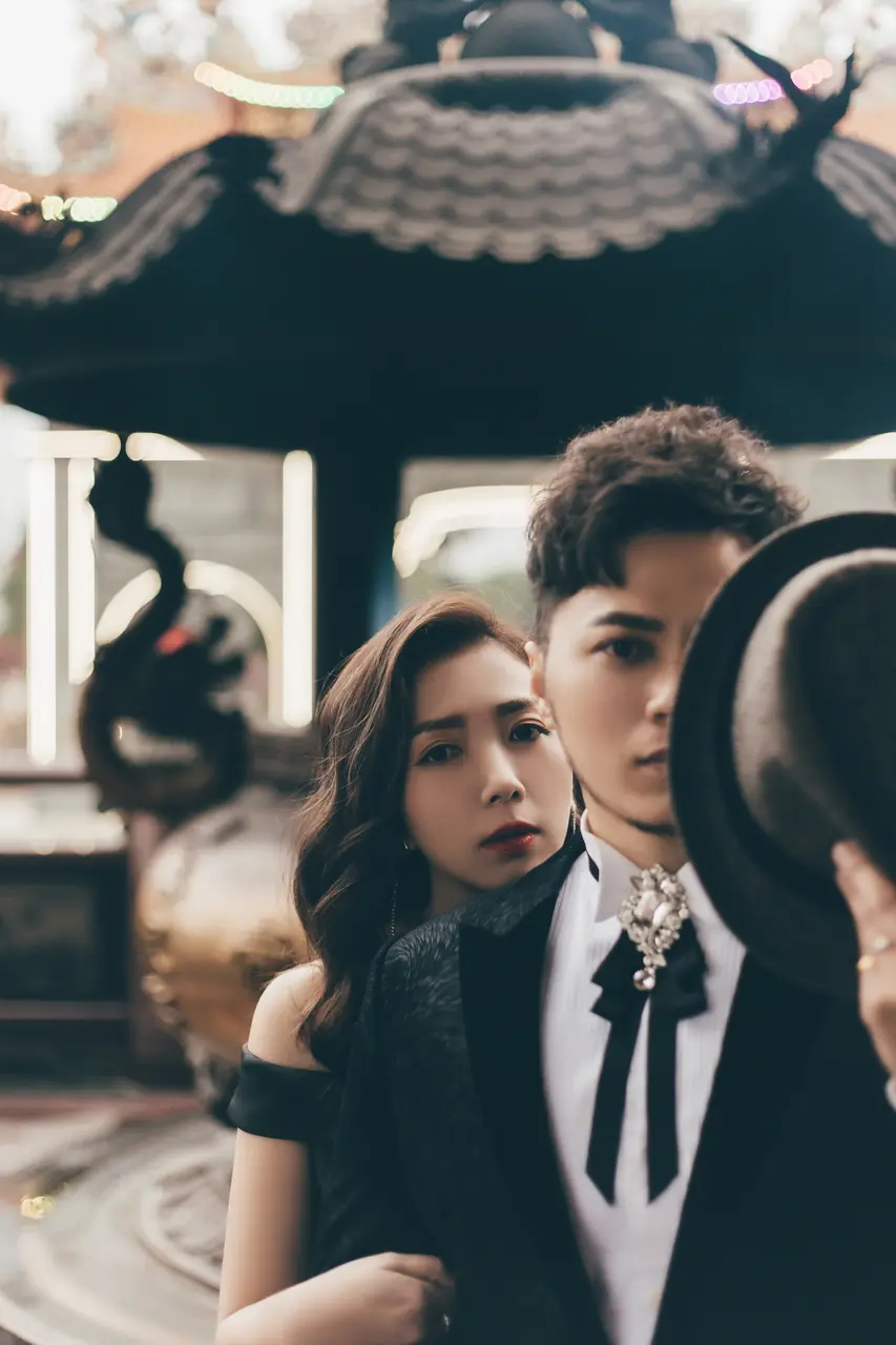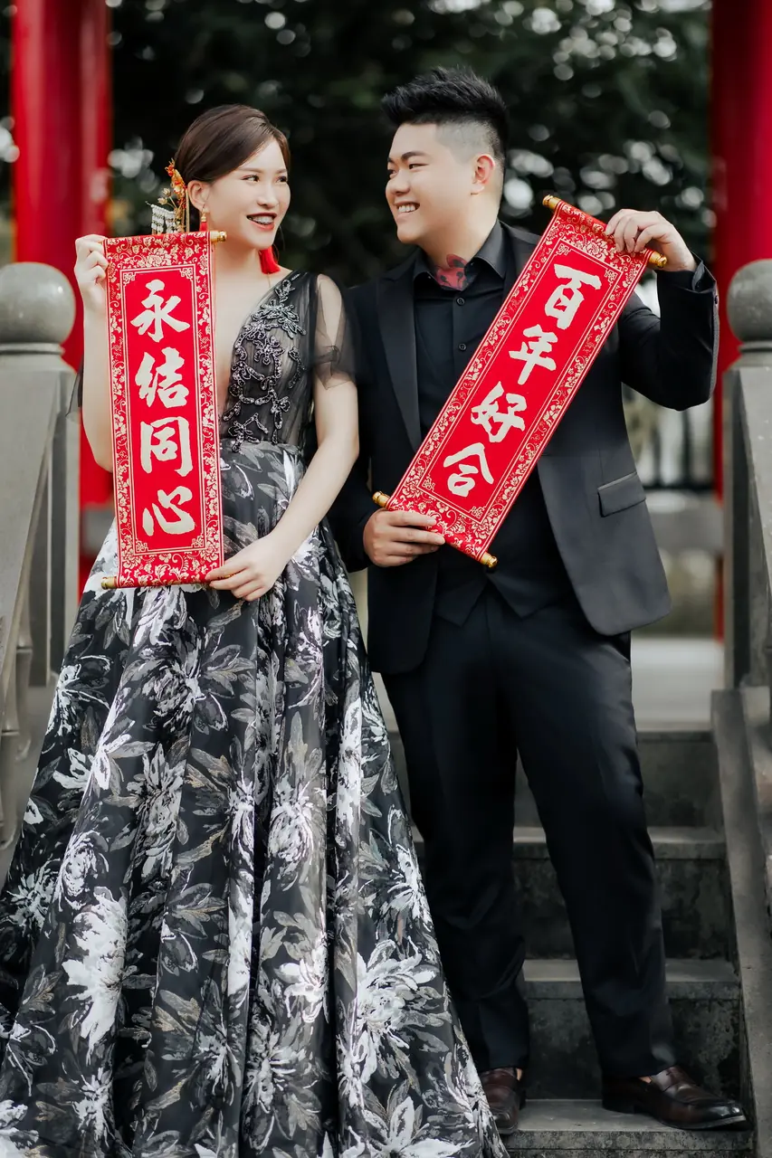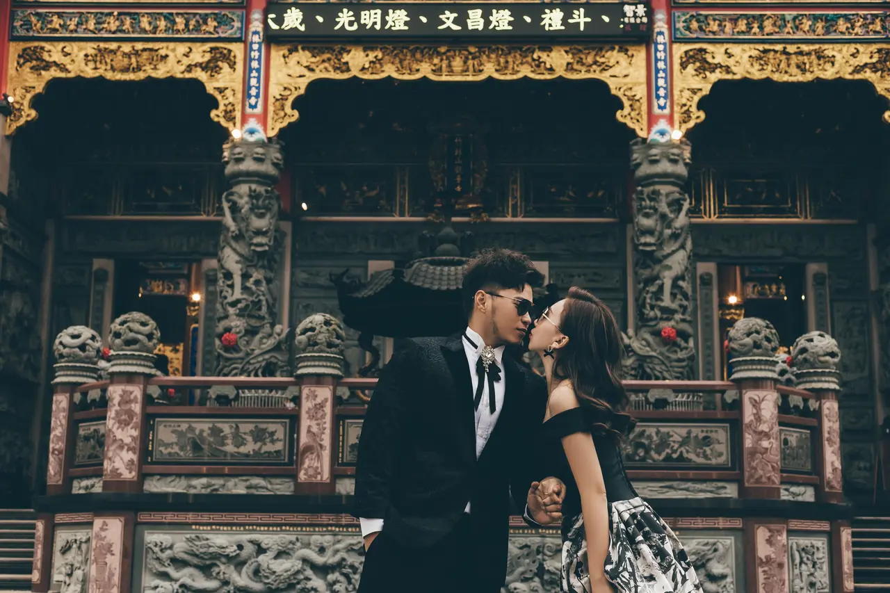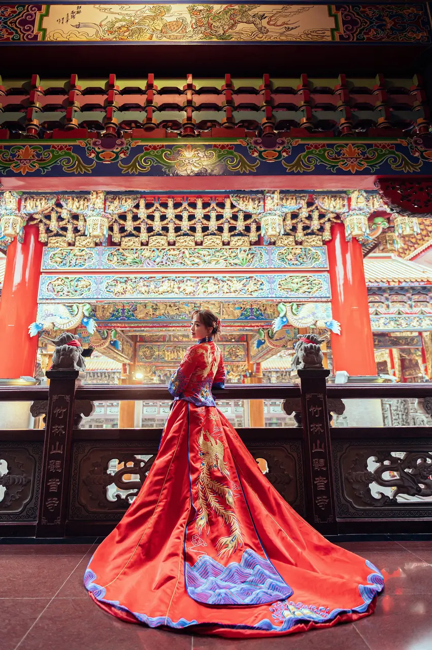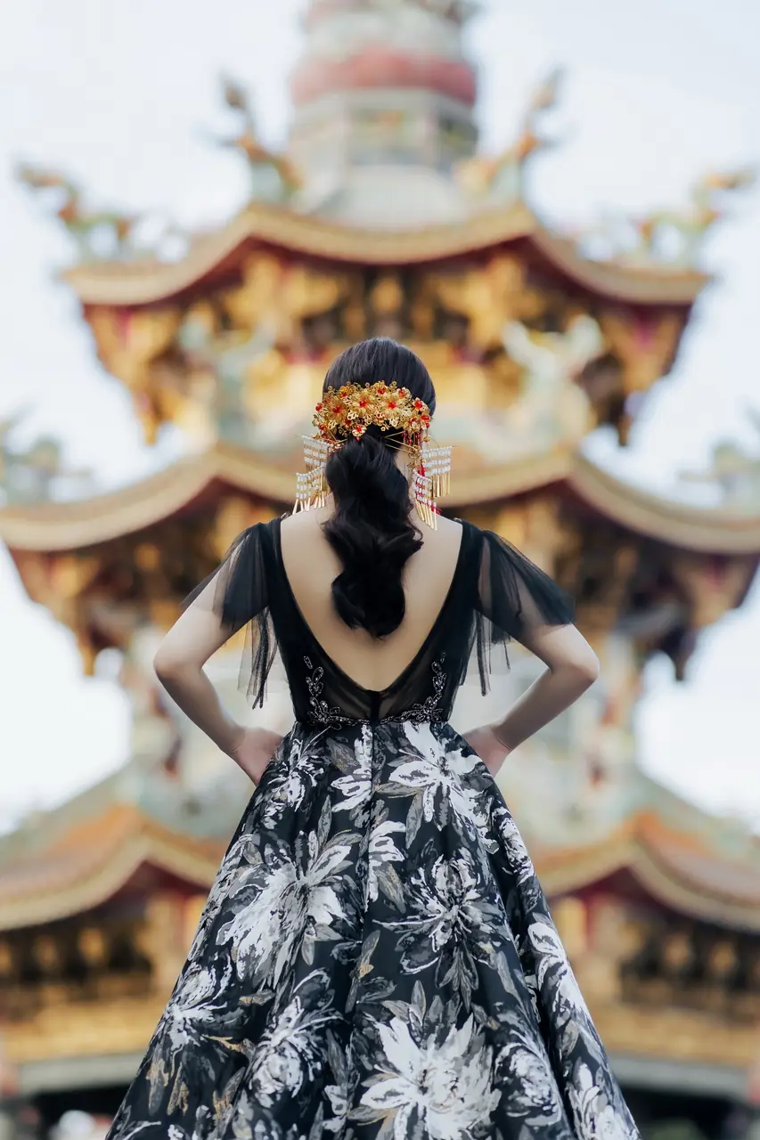 竹林山觀音寺,以重檐歇山的屋脊與雕樑畫棟勾勒中式雅韻;廟前近兩萬坪庭園延展,春日櫻色輕落,池畔有悠游小烏龜,成就溫柔畫框。新人相依漫步於長廊,光影從檐下流動,紅柱與千年樟木雕飾映出莊重與柔情。建議清晨或平日拍攝,避開香客與節慶人潮;週日與節慶偶有平安餐,氛圍熱鬧。可安排約兩小時取景,戶外園景、階梯、山門到廣場水面倒影皆是亮點。開車有免費與付費停車場;搭公車於頭湖入口下車步行約10分鐘。敬禮神域,鏡頭不阻動線,讓承諾在古韻中被溫柔包裹。