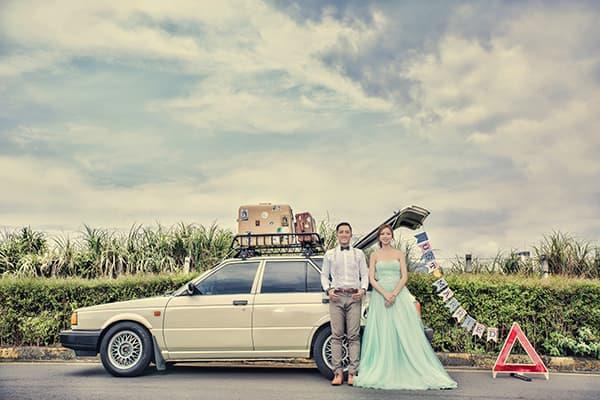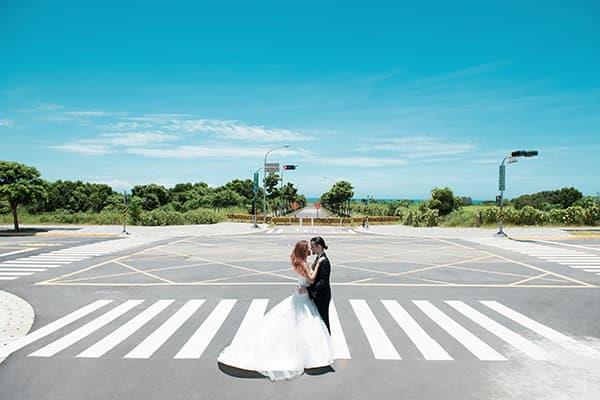 在淡水新市鎮的寬闊街道上,海風吹拂著白紗的邊緣,藍天、斑馬線與地平線交織出一幅極簡又浪漫的畫面。這裡沒有刻意設計的場景,只有無邊的天空與自由的線條,讓愛情的故事以最真實的方式展開。陽光灑落在柏油路面上,新人相擁於十字路口,彷彿世界都靜止,只剩下彼此的眼神在流轉。淡水新市鎮的路邊,不只是城市的一隅,更像是一座被風與光寫下的攝影詩篇,在這裡,每一步都散發著愛情最純粹的氣息。