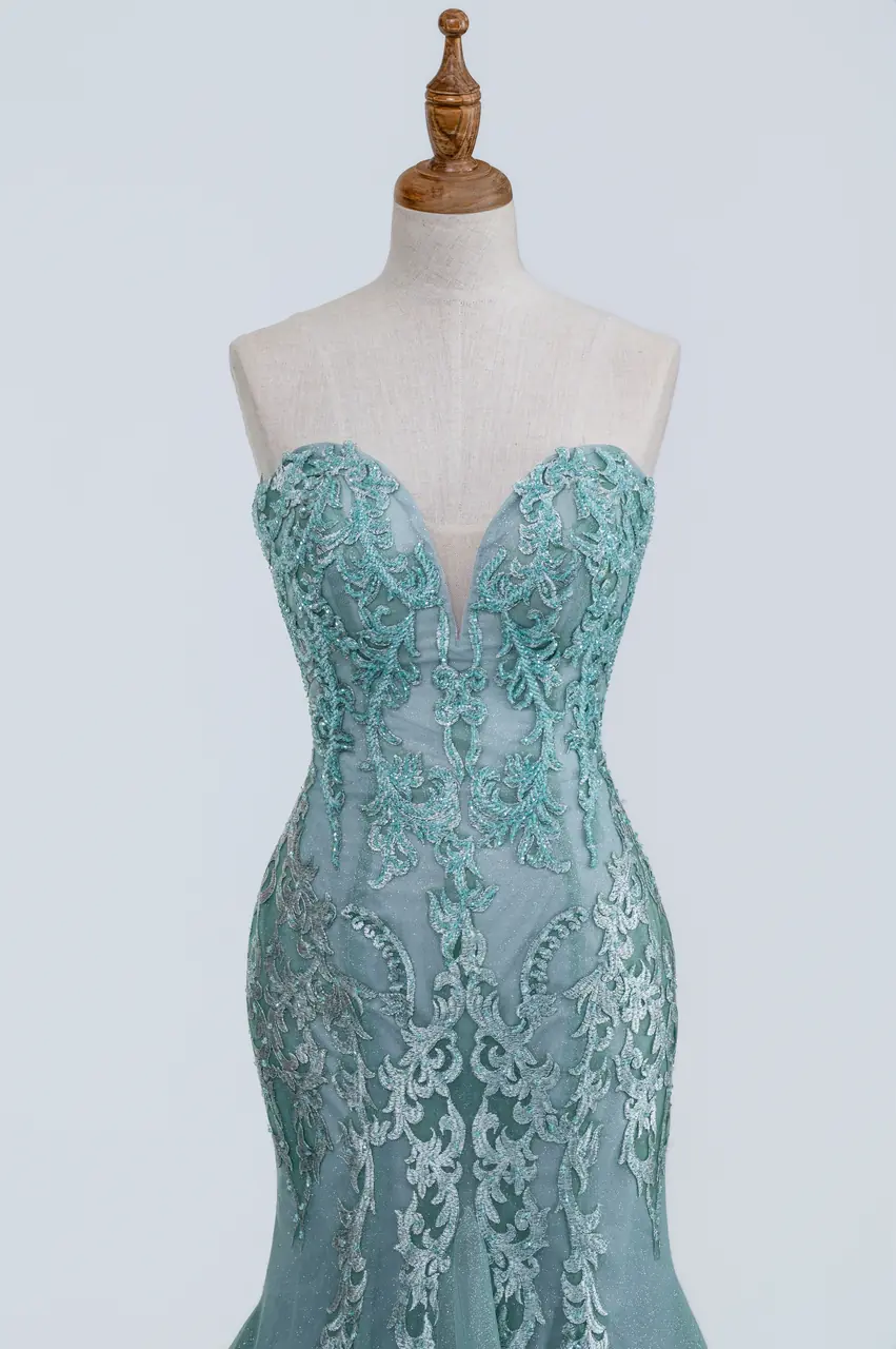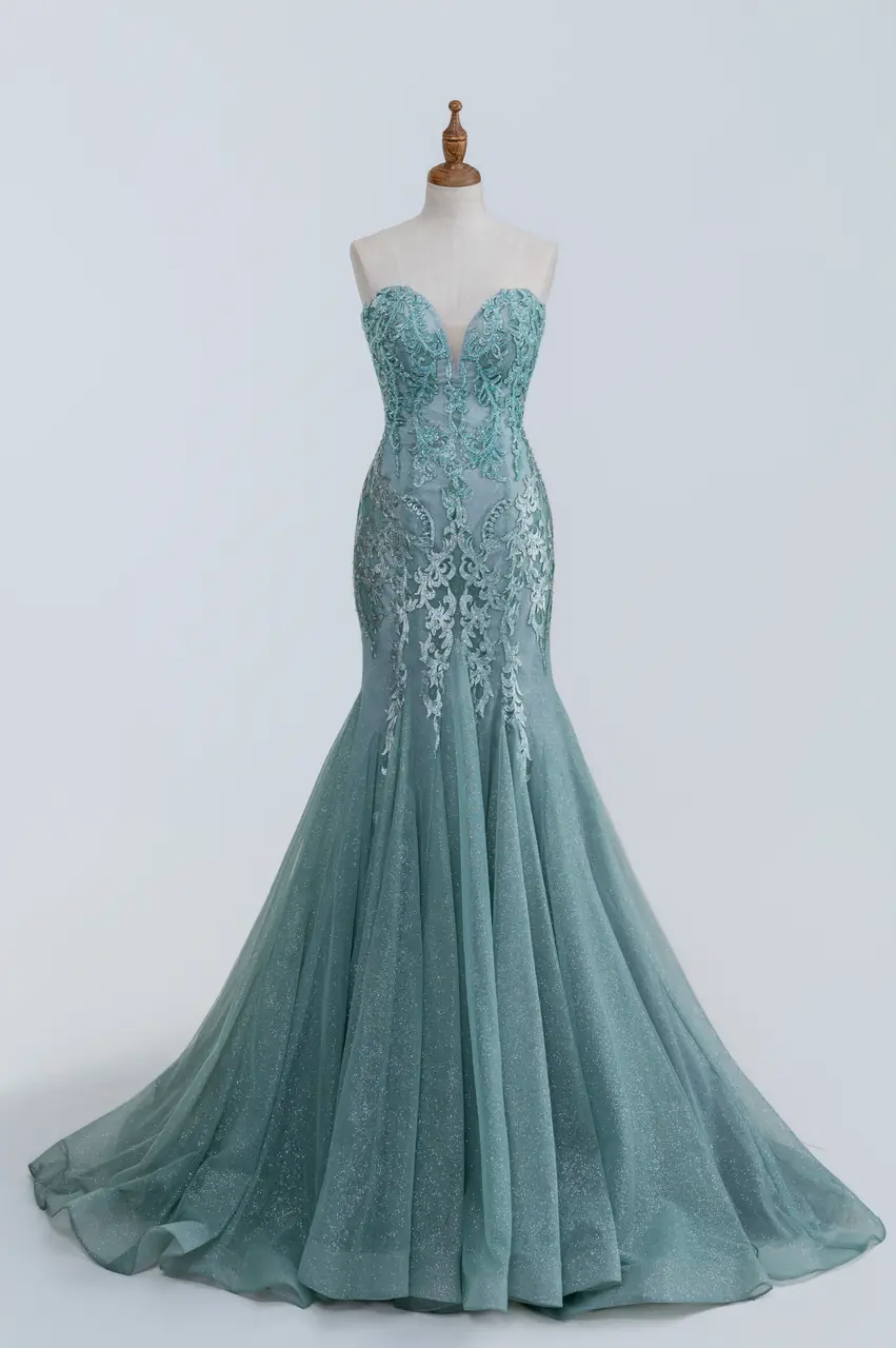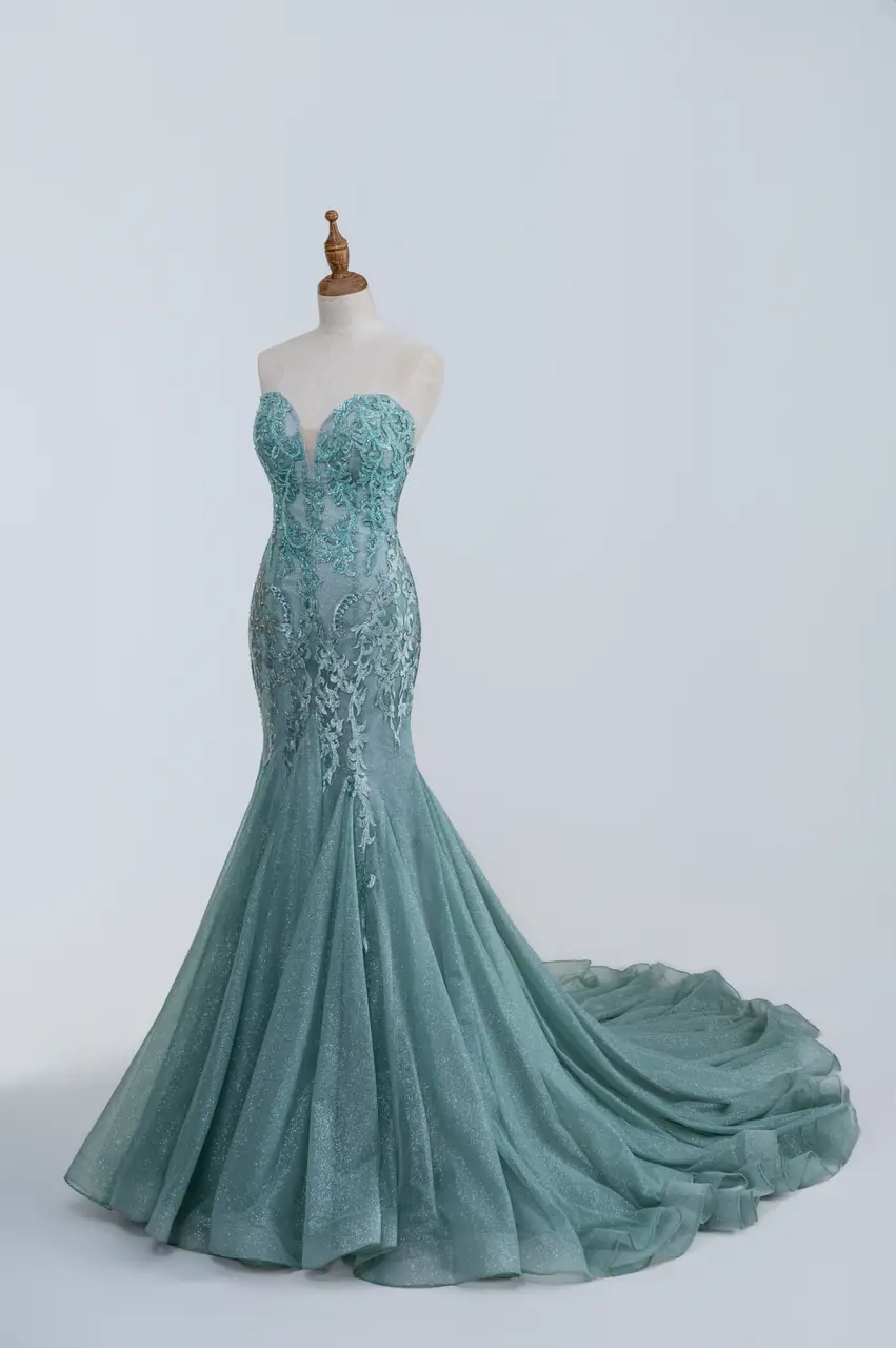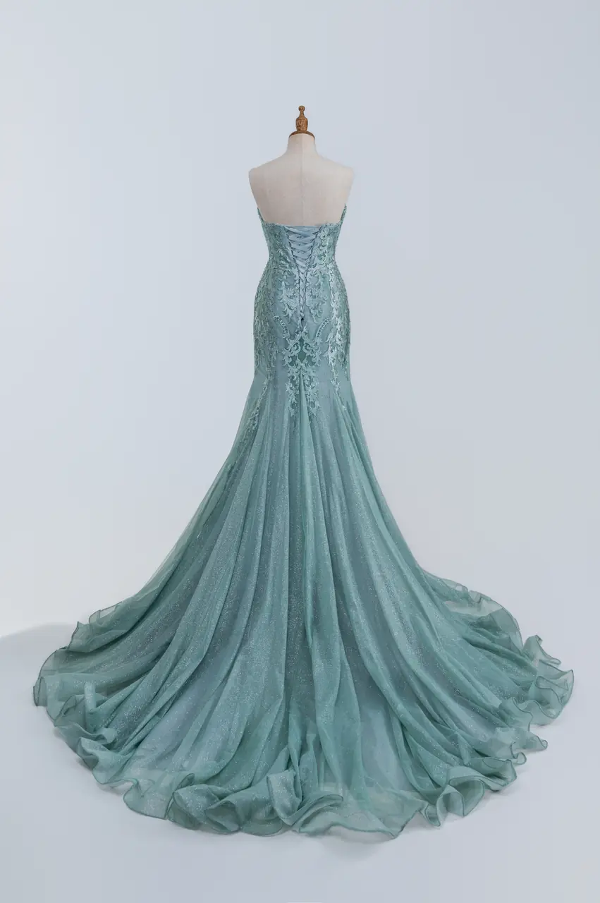 靜謐如神話森林深處的綠意,《苔蘚之書晚宴禮服》以濃郁的薄霧綠色,擷取苔蘚與潺潺暗光之靈,鋪陳一段凝結記憶的情緒長詩。桃心領與魚尾剪裁勾勒彷若被樹影包裹的身影,透紗與蕾絲交錯出有機蔓延的脈絡,就像過往的情感,緩慢卻深刻地攀附記憶之牆。這不僅是一件禮服,更是一座林中祕境,在每一個轉身與躍動之間,召喚著那個當初許下誓言的清晨。