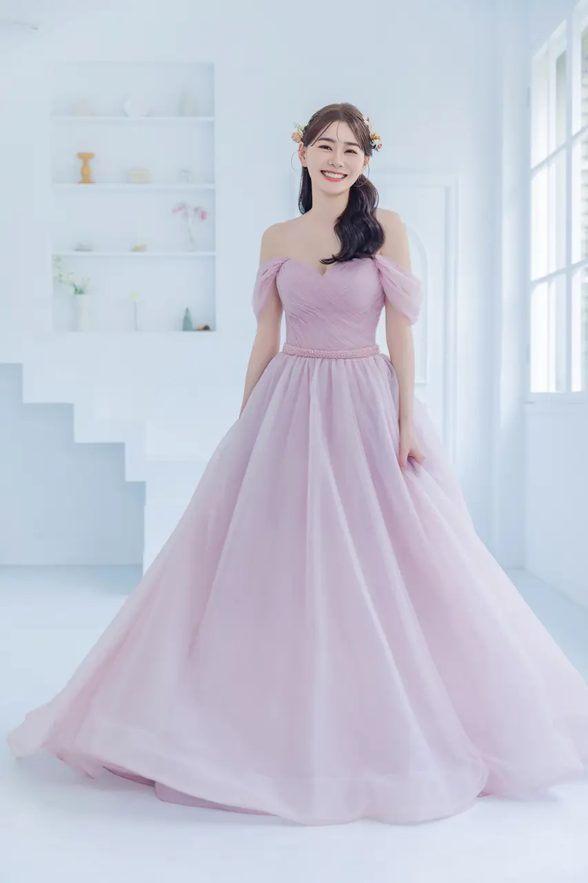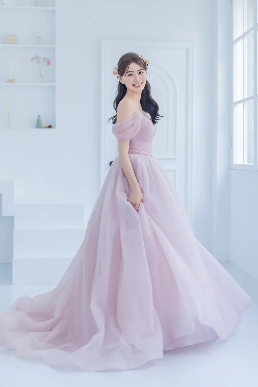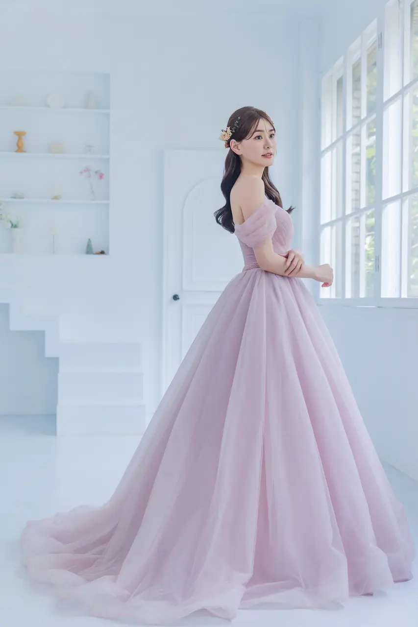 玫瑰霧港晚宴禮服,是一場關於等待的詩意獨白。柔霧粉紗似凝結的思念,卡肩設計如波光靜泊,包裹著初見那天的怦然心跳。澎裙輪廓在安靜的空間中擴散,如一簇畢生之願輕輕落地,沒有聲響卻蕩起悠長回音。這是一位新娘內在情感的具象化,一座為愛停泊的小港口——不張揚、卻深刻。她輕聲應允,也在心中溫柔許諾:此後,我將不再漂流。