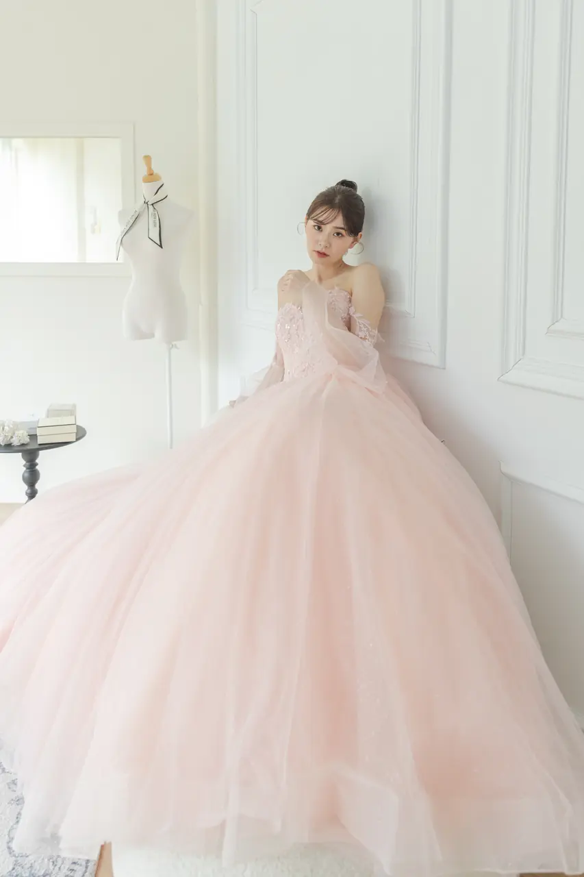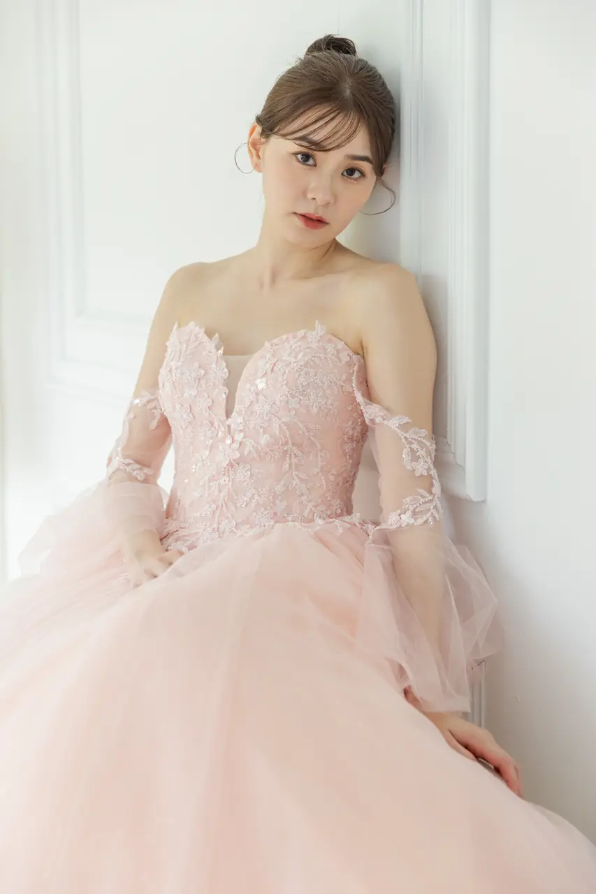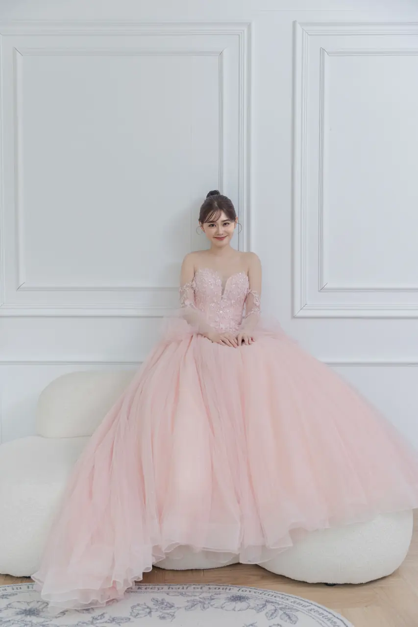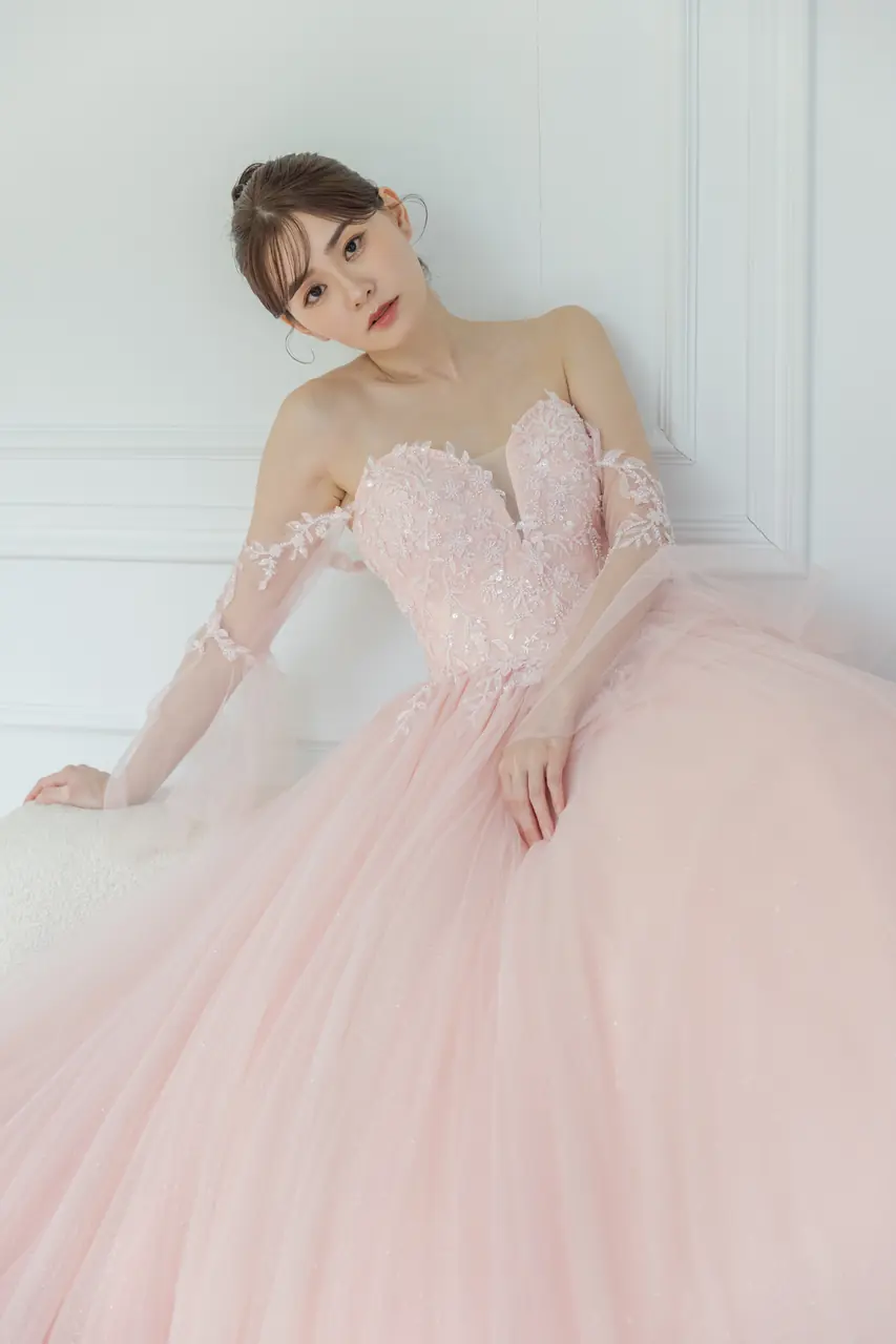 《玫瑰脈息晚宴禮服》是一段關於期待與溫柔的緩慢故事,被粉霧輕罩的羽感紗裙,如晨曦未醒的夢。桃心領以刺繡繁花編織每個快樂的顫動,無袖剪裁釋放肩頸柔光,將青春的微光銘刻在一室白牆之間。 宛如站在愛裡,卻尚未說出那句話的瞬間,一切柔和、一切可期。這款禮服為傾聽者而生,適合那些以眼神傾述情感、喜歡將靜默變成詩的人。當她轉身,便是滿場的春天。
