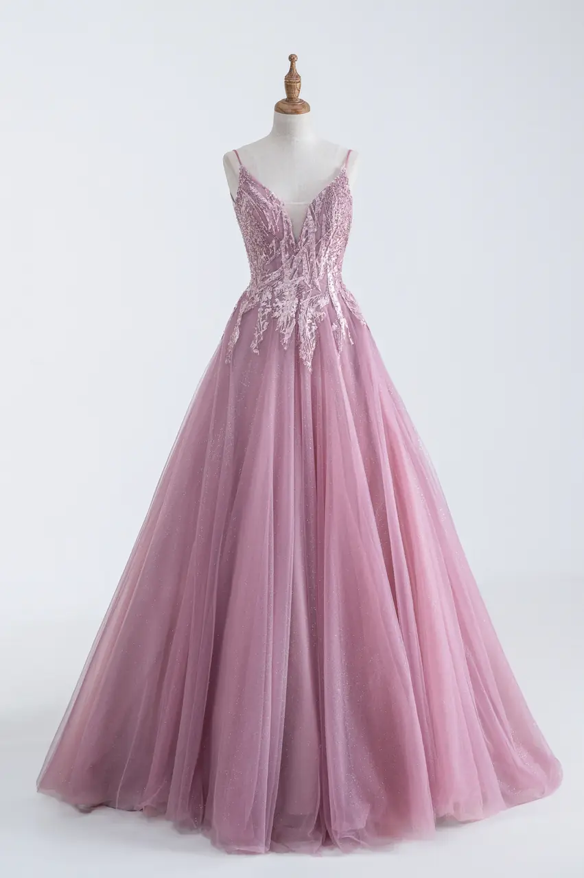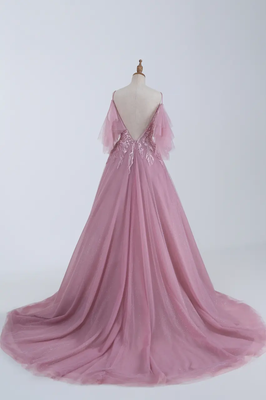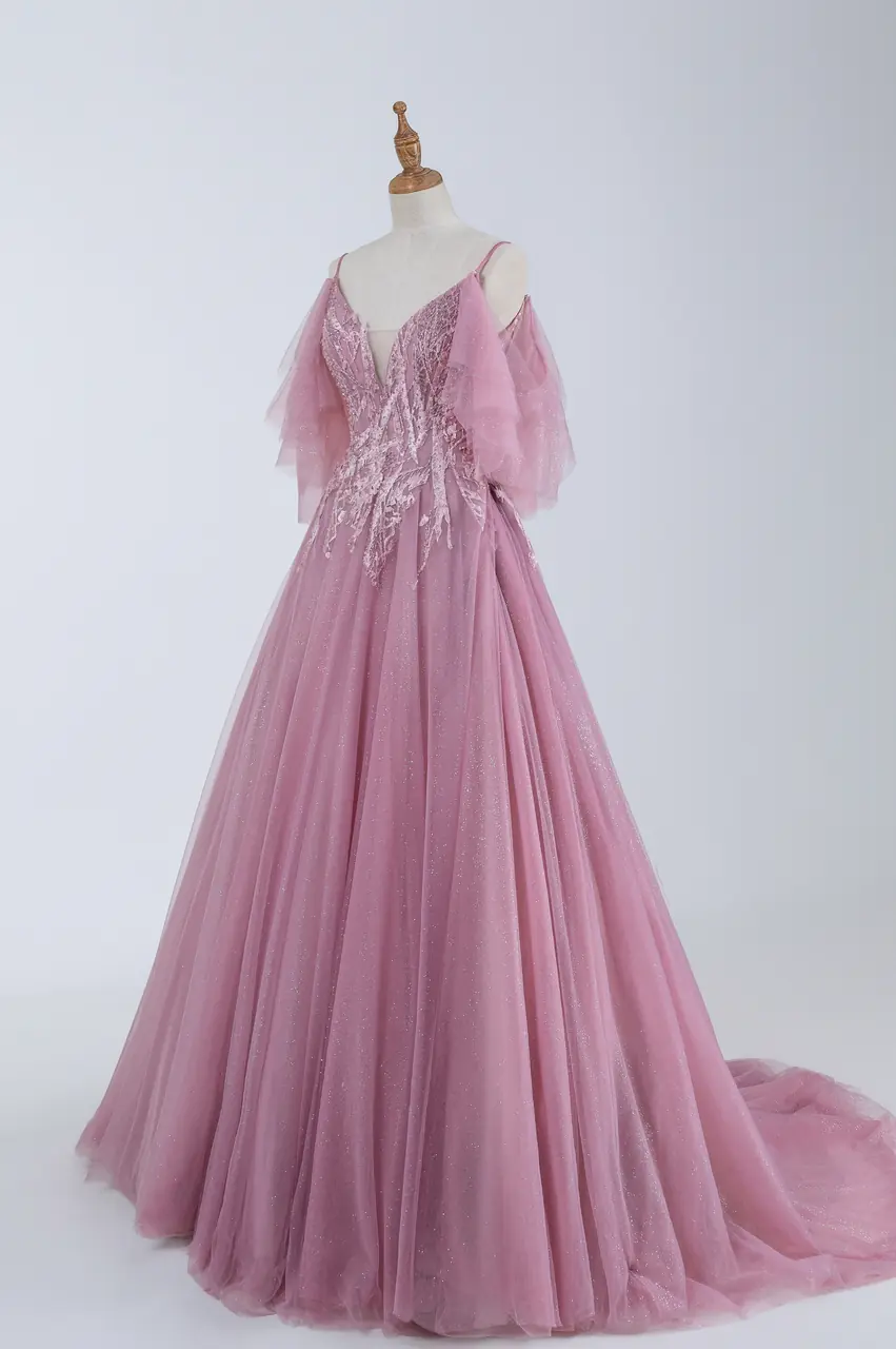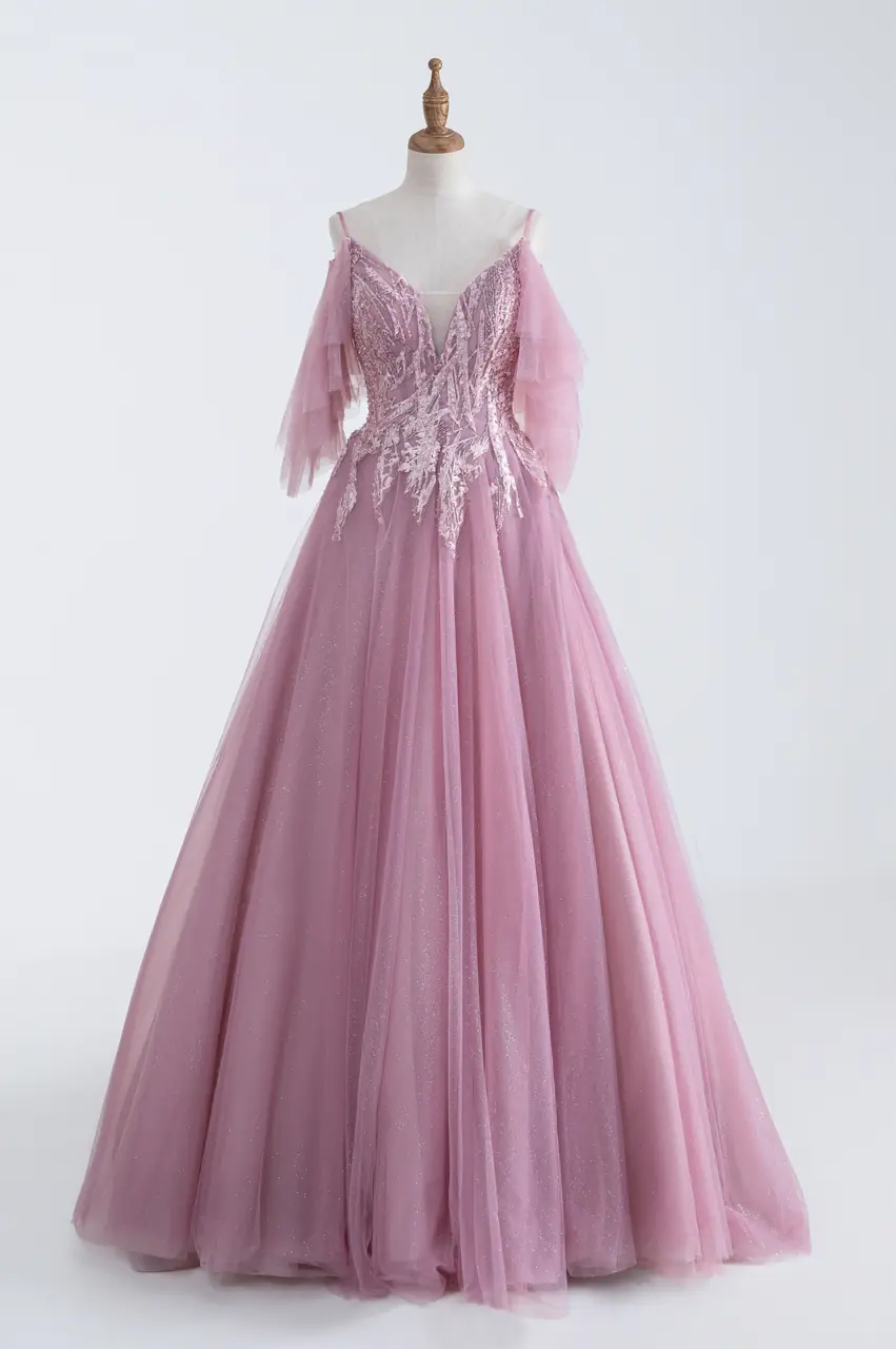 這不是一件禮服,是一場遺落在劇場幕後的心跳。粉霧色的紗質澎裙如煙塵般沈靜,散發著淺淺的光粒,仿若黃昏時分殘存的舞台燈,輕輕貼住她輪廓的每一筆回聲。細肩帶與深V領構成了脆弱卻果敢的語言,而胸前刺繡如爬藤,記錄著愛情在身體上留下的每一次生長與試煉。『玫瑰殘骸』不描繪美好,而是紀念那些在終局之下依然願意盛放的靈魂。這是屬於試演場、留白與終幕座位上的女人——倔強而浪漫,破碎得優雅。