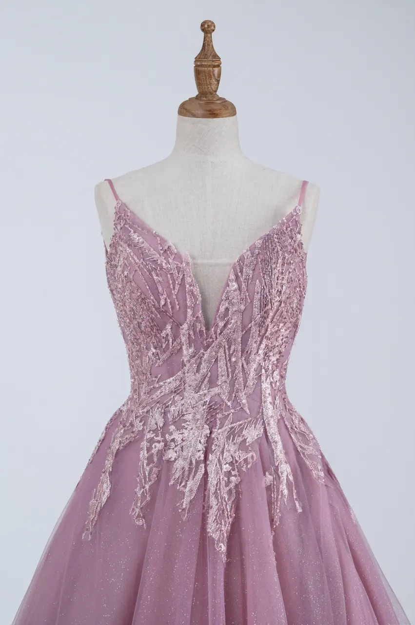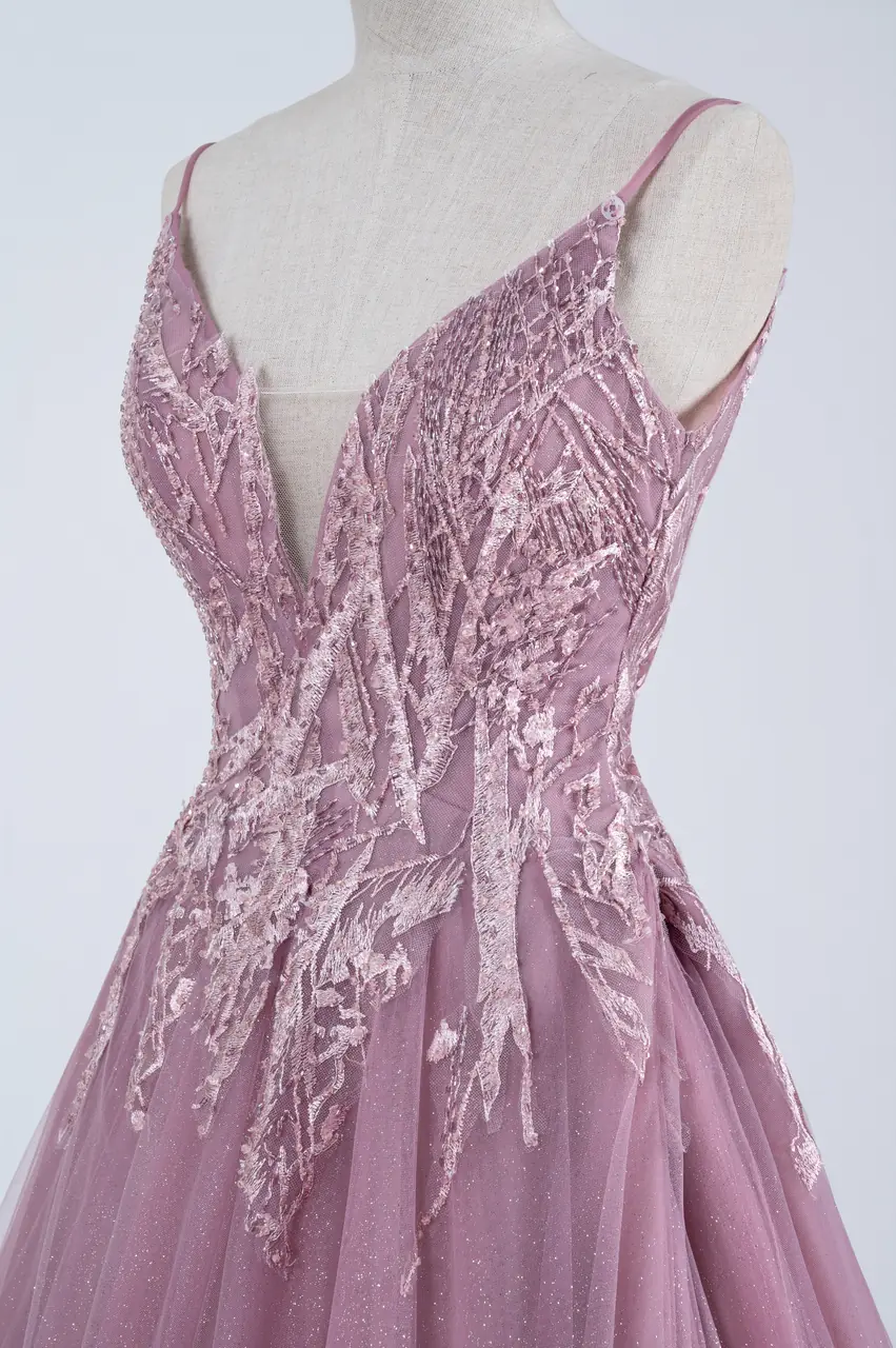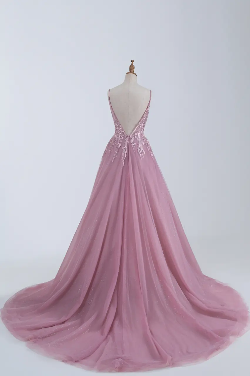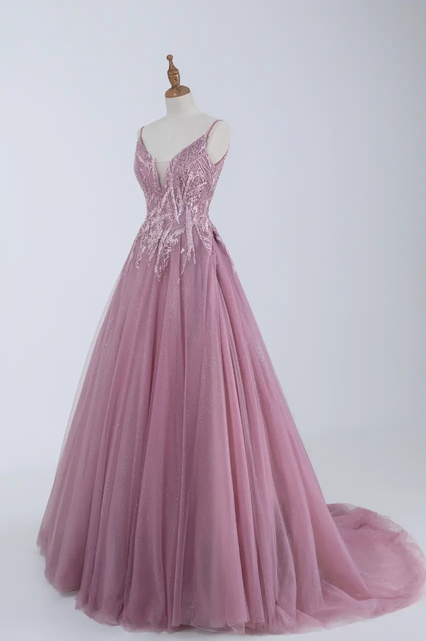 這不是一件禮服,是一場遺落在劇場幕後的心跳。粉霧色的紗質澎裙如煙塵般沈靜,散發著淺淺的光粒,仿若黃昏時分殘存的舞台燈,輕輕貼住她輪廓的每一筆回聲。細肩帶與深V領構成了脆弱卻果敢的語言,而胸前刺繡如爬藤,記錄著愛情在身體上留下的每一次生長與試煉。『玫瑰殘骸』不描繪美好,而是紀念那些在終局之下依然願意盛放的靈魂。這是屬於試演場、留白與終幕座位上的女人——倔強而浪漫,破碎得優雅。