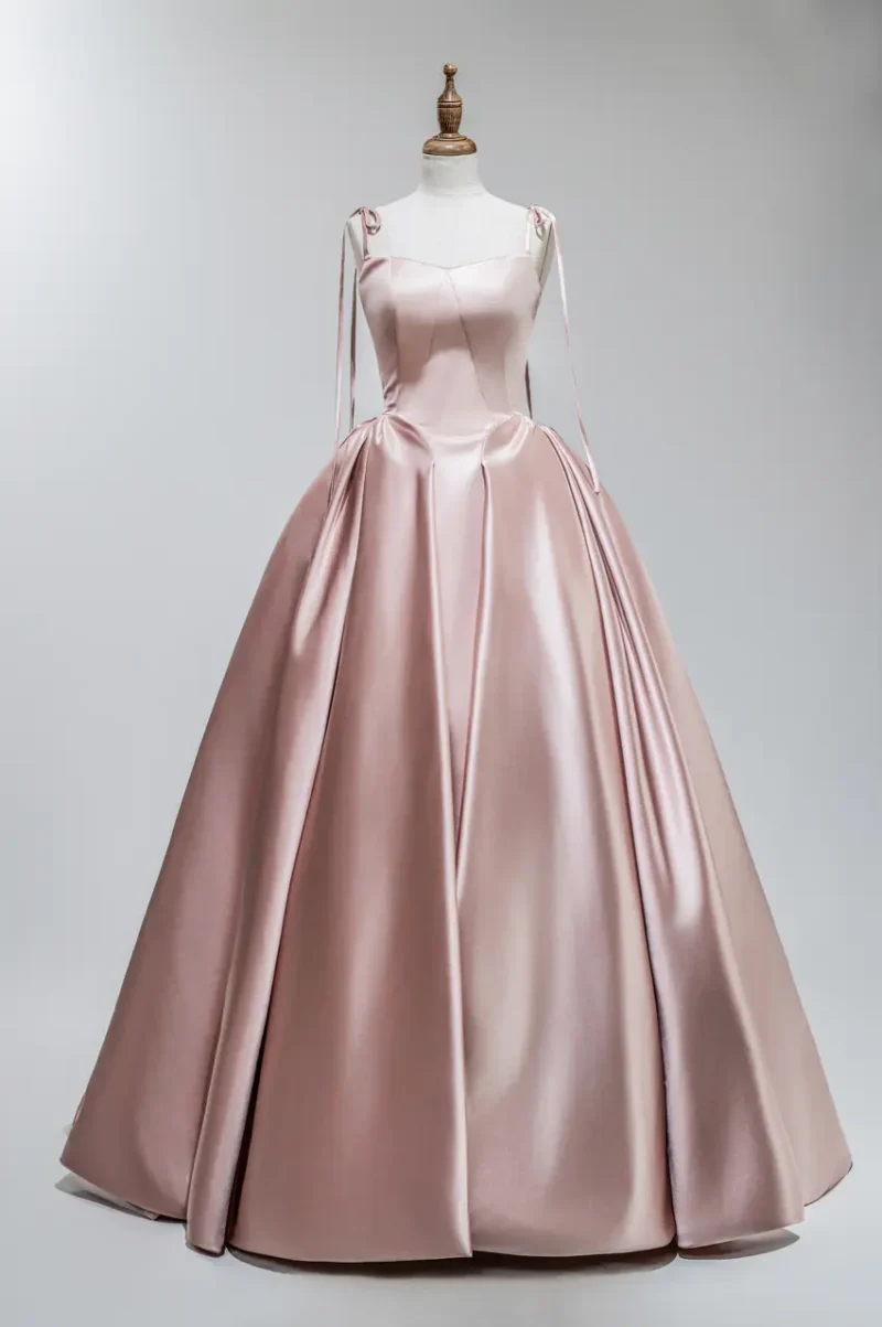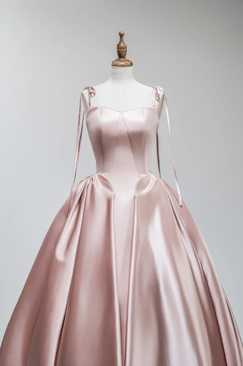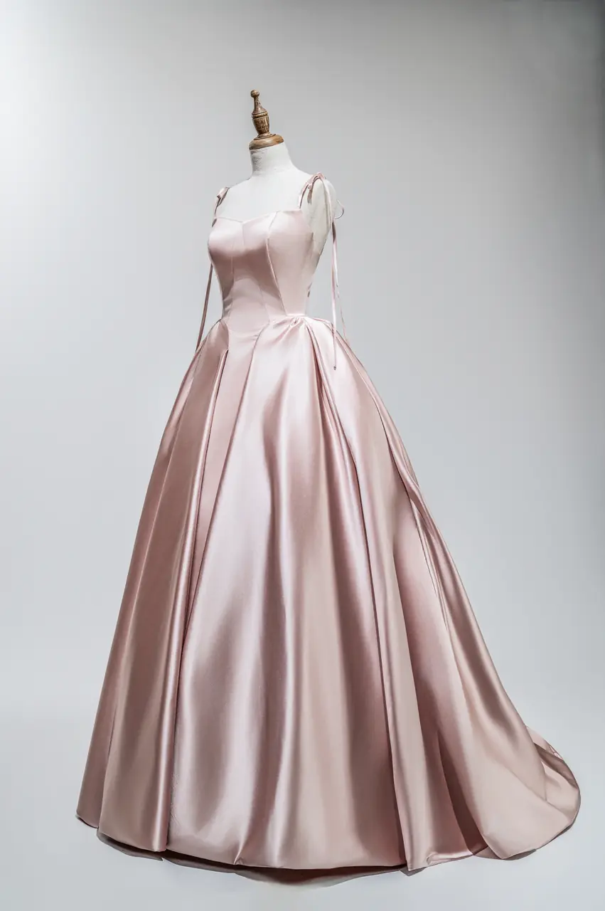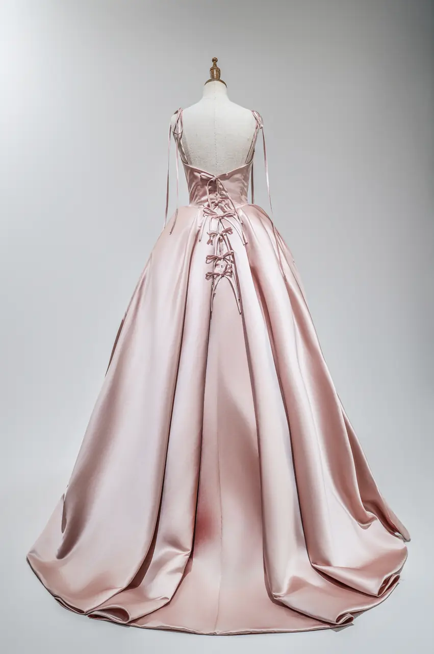 有一種光,是落日最後一刻的餘溫,撒落在古堡石牆與銀器盛宴之間,帶著毫不費力的高貴與柔和。這款「石英暮光晚宴禮服」,以絲緞粉色演繹出時間凝結的片刻,像是一段細語情感在心中潛行。澎裙下的每一道摺痕都像是靜止的波光,低聲吟唱著一場內斂且華麗的告白。當她轉身時,彷彿從黃昏裡走來,不需語言,便可讓整個世界屏息。