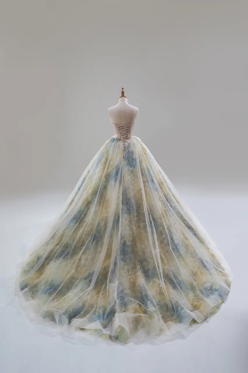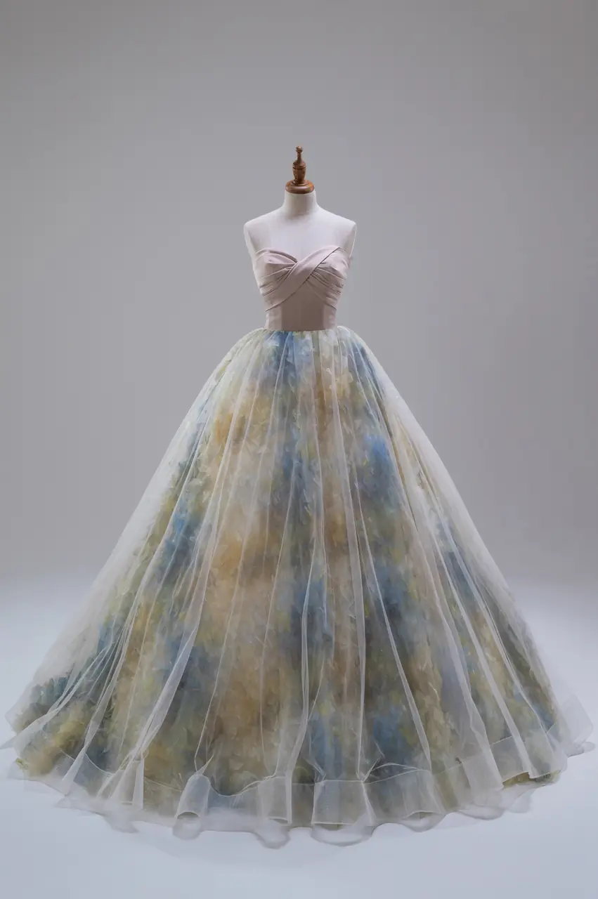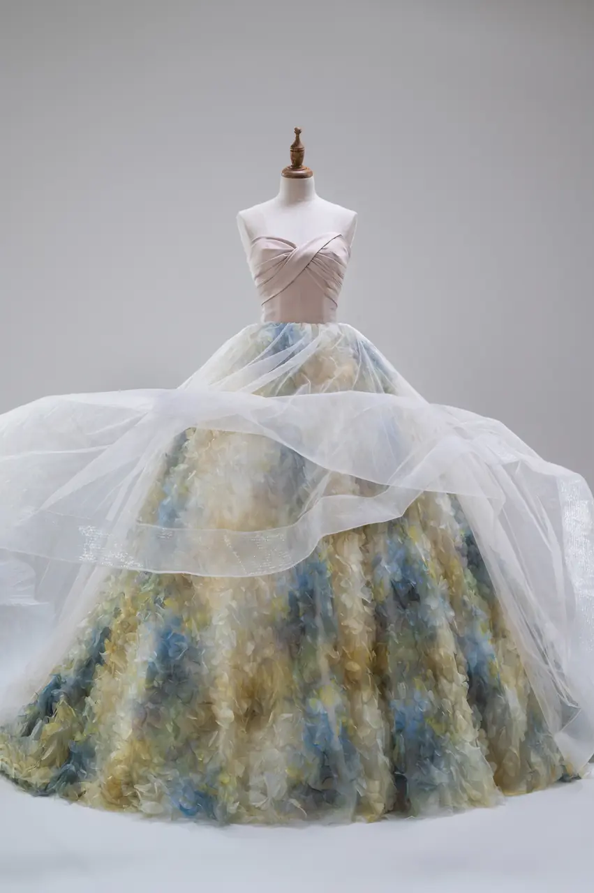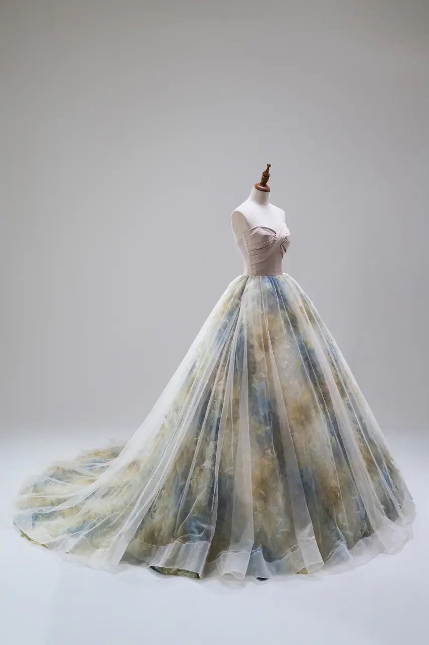《苔痕暮語晚宴禮服》是場景性的記憶容器,如穿越黃昏中濕潤苔痕的足音。胸口交疊的緞面線條,如封存夏末溫度的細緻心緒。裙擺在輕紗與層層印花之間流動,繪出朦朧又迷濛的綠影與藍感,彷彿午後花園裡藏著被雨水輕吻的記憶。這件禮服訴說的不是夜晚的喧鬧,而是一種轉身時靜靜萃取的餘韻。它適合站在落地窗前,背對眾人,任情緒微光灑落,成為每一道眼光中的幽柔詩篇。