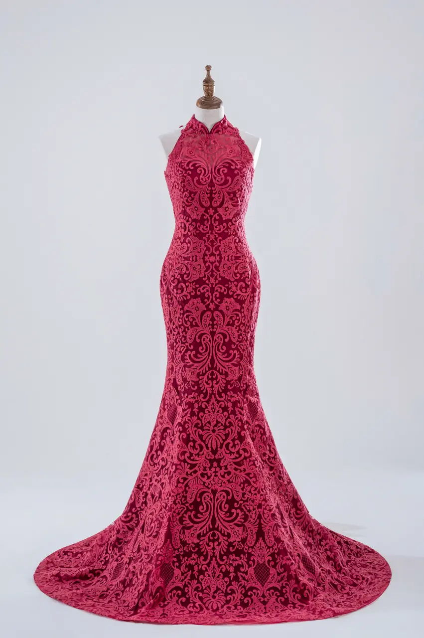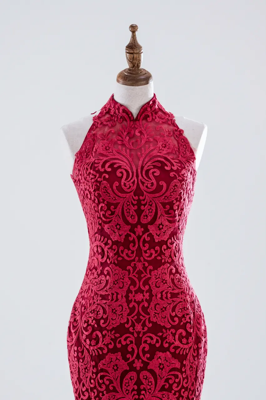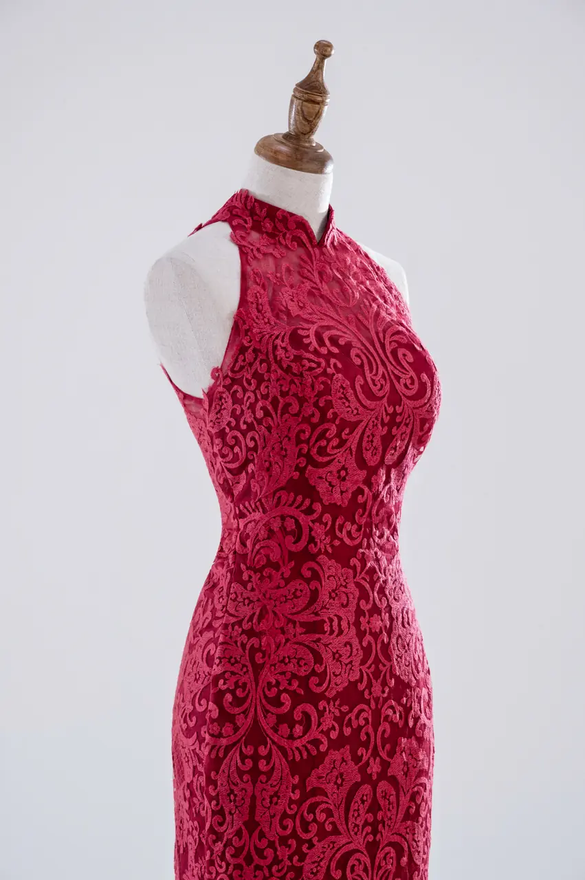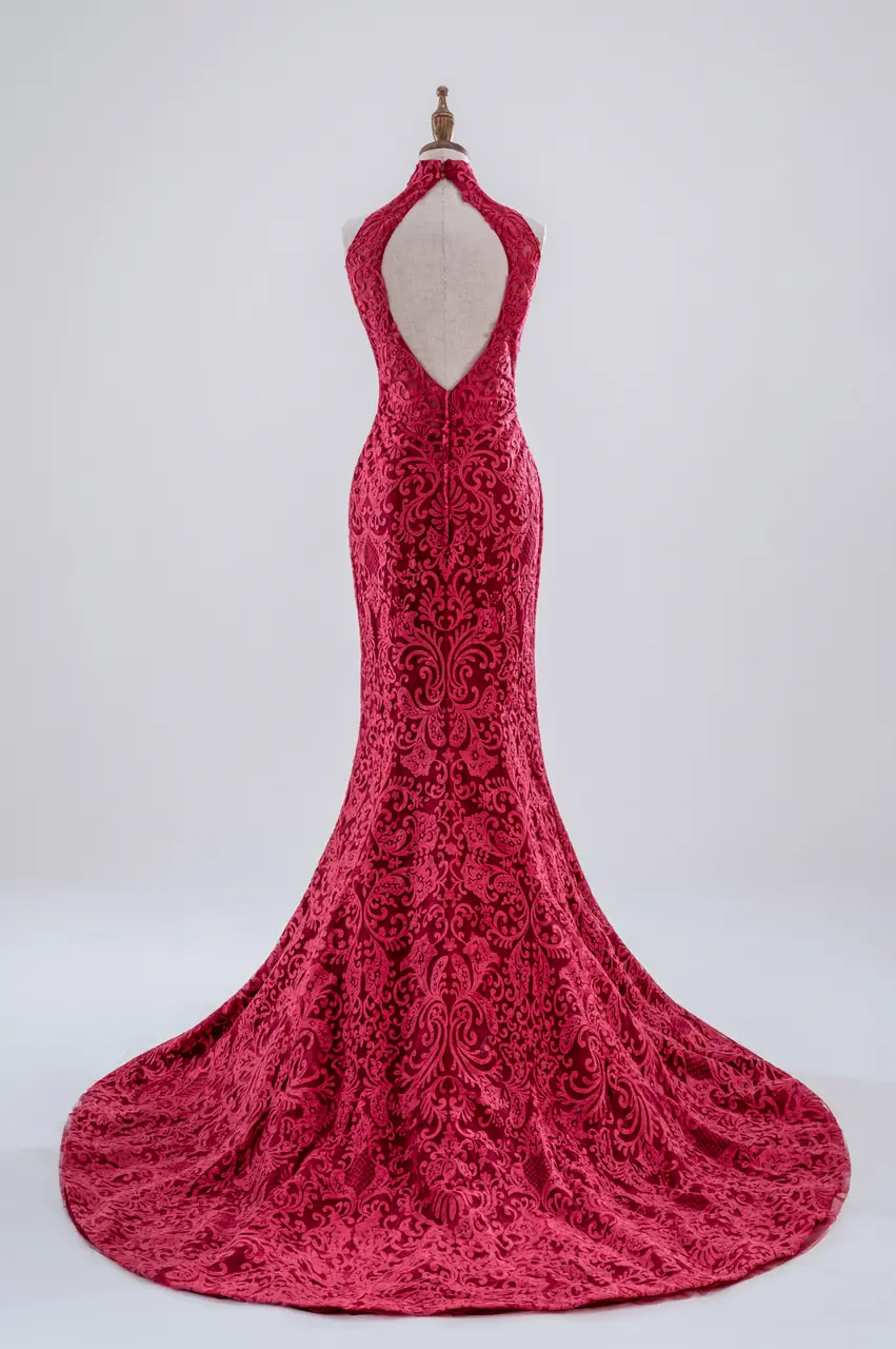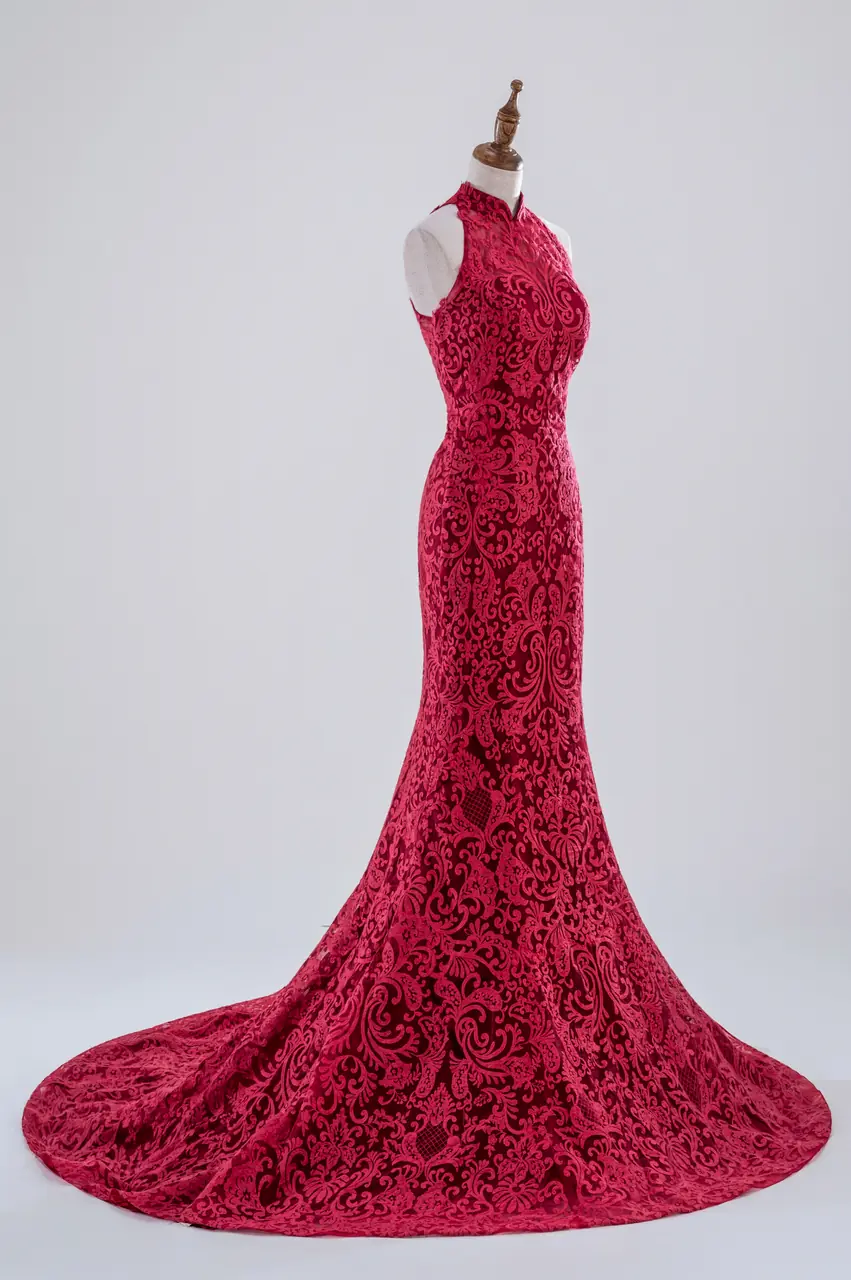 如東方舊夢中走出的女子,這件魚尾晚宴禮服以旗袍領勾勒出古典之魂,在深胭紅中躍動著絲絲火光。繁密蕾絲編織出的不是圖案,而是一封封無言的私語,講述埋藏心頭的熱烈與決絕。它像是一段不曾熄滅的情感記憶,在燭火搖曳的廳堂中回響。這不是為了取悅的奢華,而是一場靈魂自燃的寂靜歡愉,適合那些安靜卻無畏地愛過的人,在最深情的夜裡,讓烈焰與優雅並存。