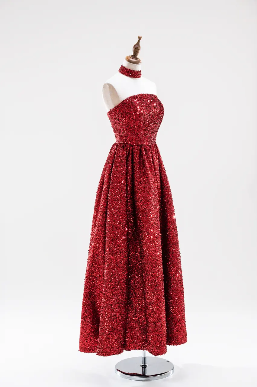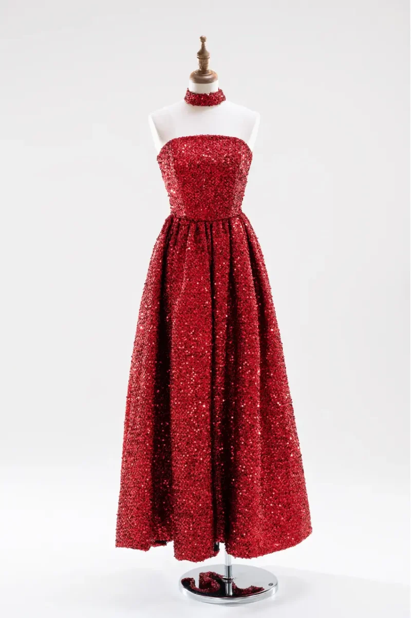 夜幕低垂,光影潑灑於旋轉的紅,像煙火在心跳最深處悄然炸開。這件晚宴禮服以鎏金般的紅亮片構築而成,細緻閃耀猶如熾熱情緒的結晶。平口剪裁毫無遮掩地呈現自信女性的胸膛,而九分裙長則在高貴與俏皮之間劃出平衡。這不是一場為了取悅誰的登場,而是一次為了自己而燃起的燦爛盛典。每一顆亮片,都是一段說不出口卻難以熄滅的渴望。
