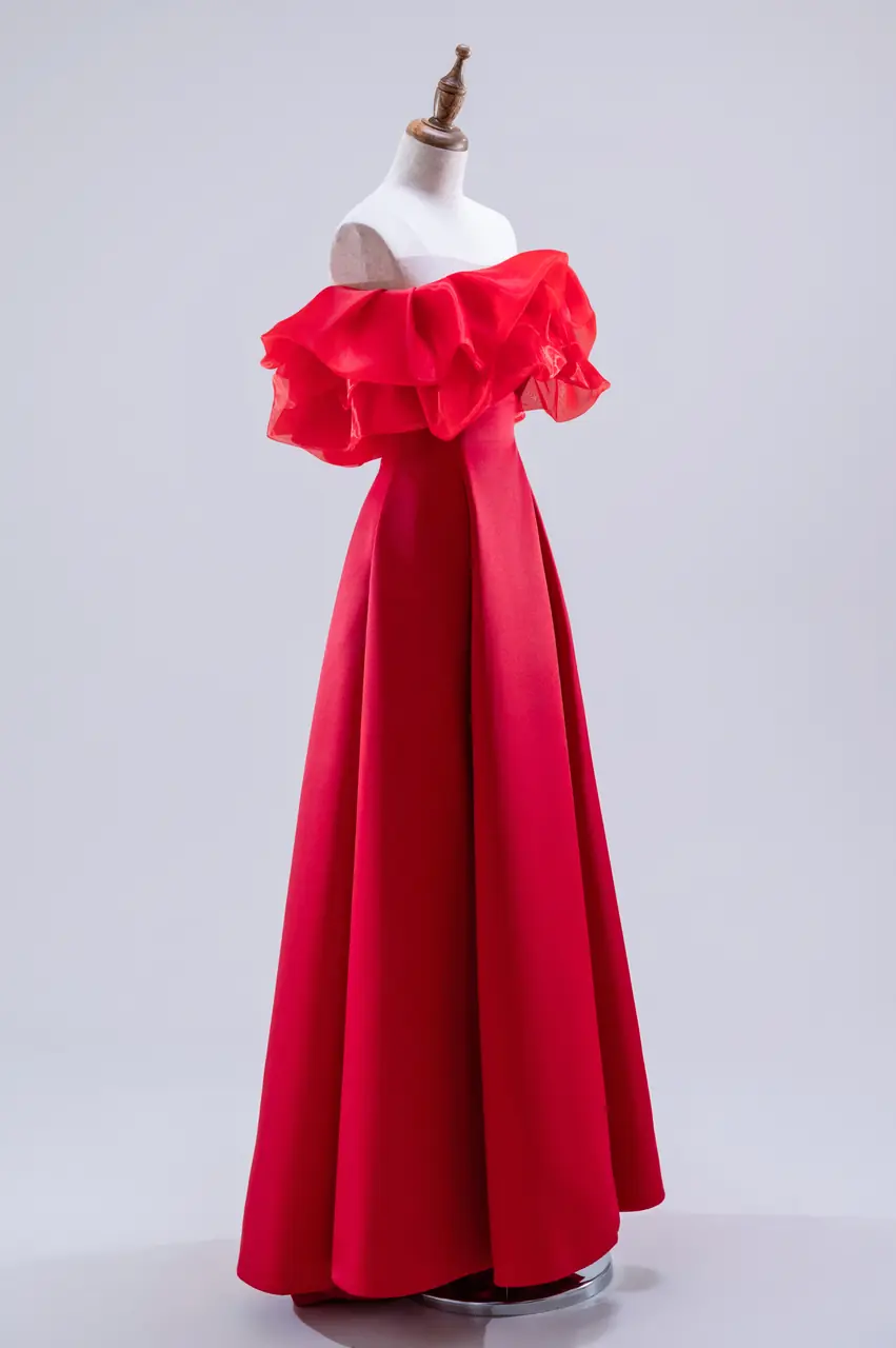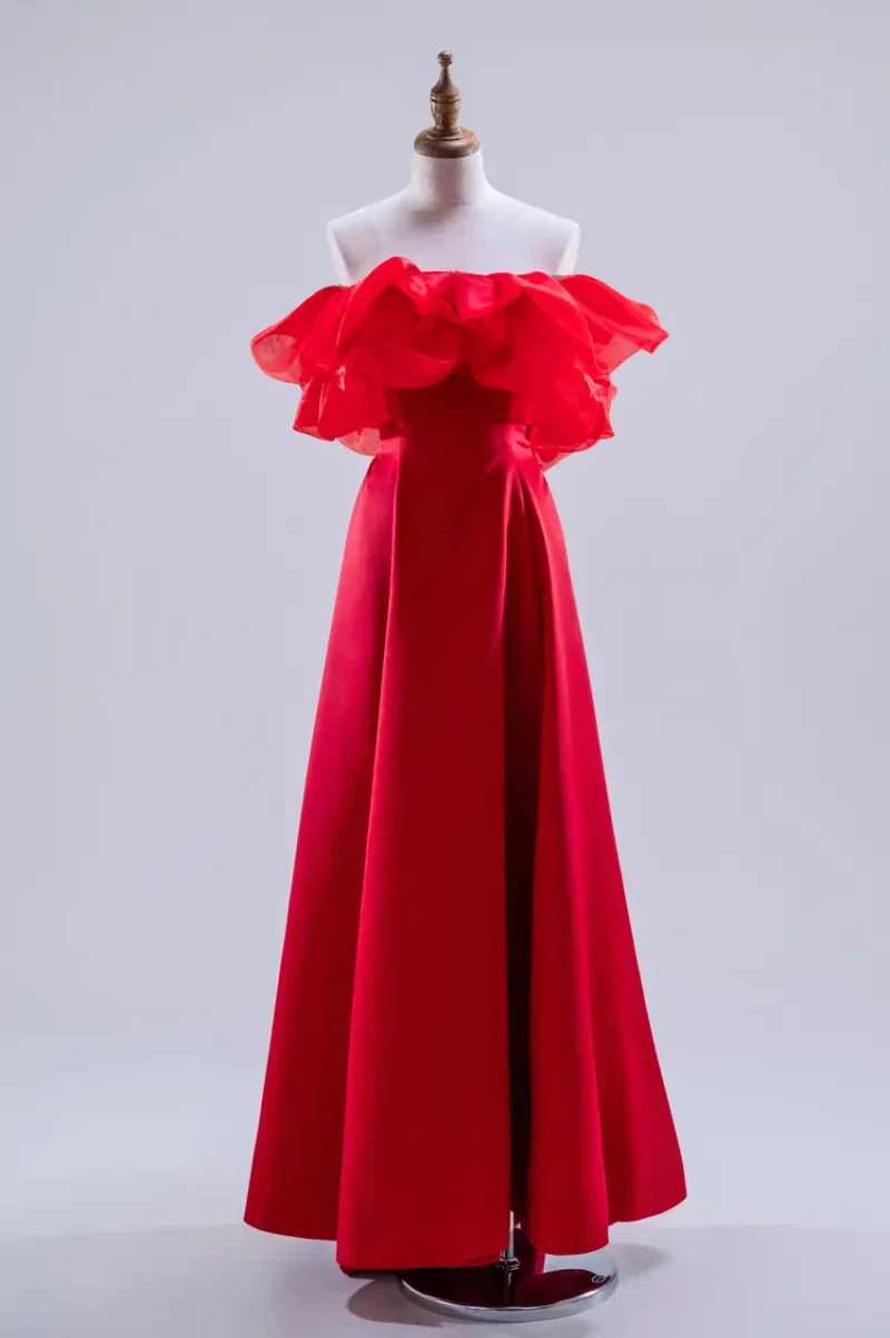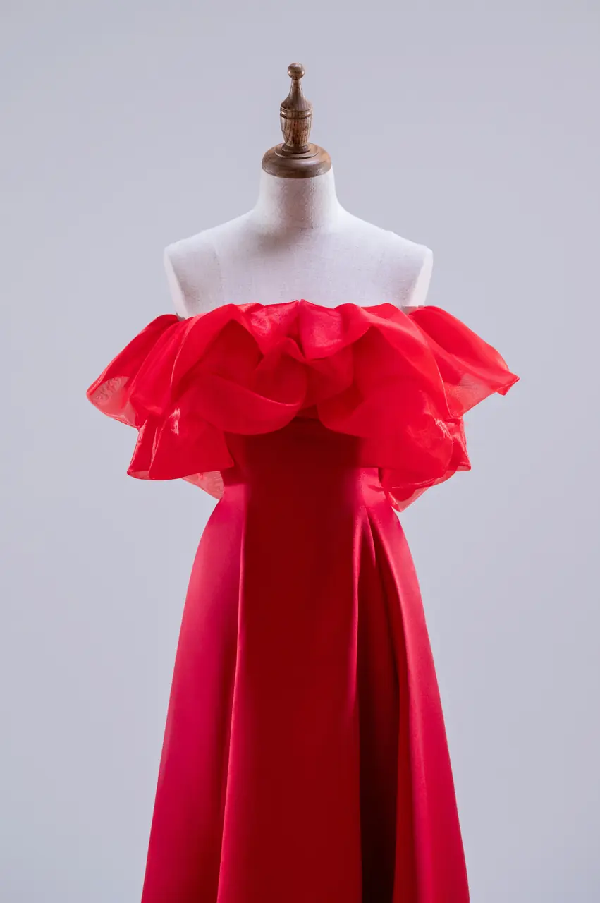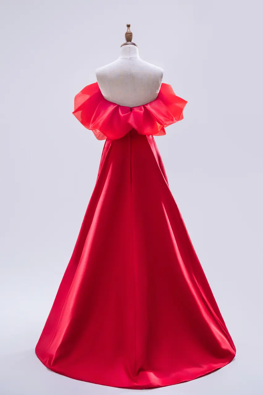 《火鳶晚宴禮服》是一場關於衝動與自信的演出,如同夜空中掠過的紅翼,不為誰停留,卻令人屏息。緞面如赤焰般垂墜,自肩際綻放出層層羽翼般的卡肩設計,有著火焰升騰的律動,也有細語呢喃的溫柔。這是一場無需言語的叛逆與熱情,獻給走進宴會不為討好、只為存在的你。當她轉身時,風與光低頭,空氣像被點燃,在她身後繡出灼熱餘燼。