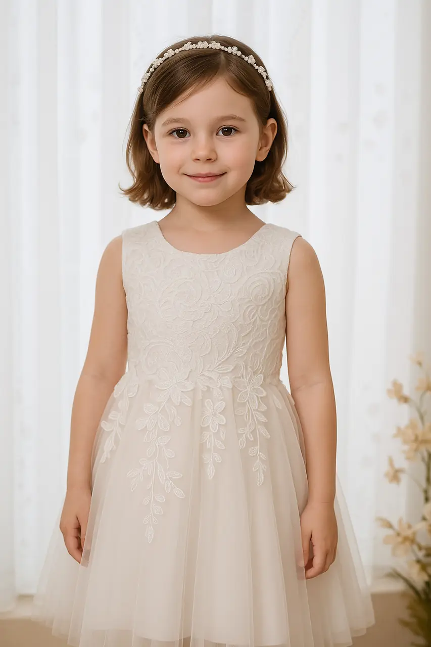 這不是一件禮服,而是一段記憶的開端──『白籽花影禮服』,輕盈蕾絲於圓領間綻放,白紗如晨霧撫過童年的笑眼,一針一線皆延續著潔淨與溫柔的情感。它適合出現在婚禮的最初場景,當她踩著晃晃步伐走進儀式之中,背景是微光、花瓣和父母眼中的微笑。純白如童心,用來盛裝最純粹的祝福,每一位父母都在她的步伐裡,看見時間的珍惜與延續。