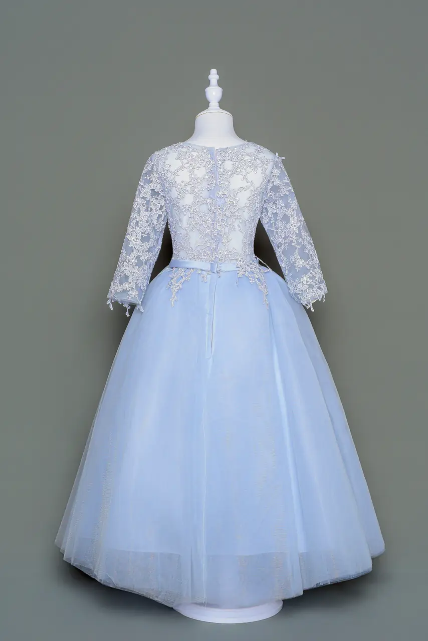 「藍瓷花語禮服」是一首溫柔的序曲,為婚禮這場生命儀式添上一抹童年的純真筆觸。上身以細膩蕾絲編織,猶如老匠手工打磨的瓷器紋飾,低調卻不失優雅光澤。下身輕盈紗裙如晨曦中的湖面,點綴著繁花刺繡,宛若初春盛放的藍花楹,在婚禮間靜靜綻放。這不僅是一件花童禮服,更是一段關於家庭記憶與祝福交錯的小童話,為步入愛的典禮增添無可取代的詩意輕語。