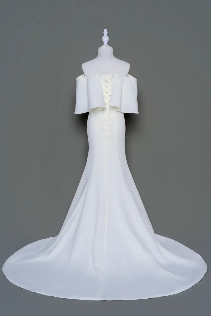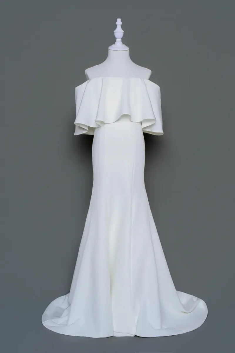 這不是一件單純的花童禮服,而是一首寫給靜謐時光的頌歌。柔緞如白浪輕覆肩頭,平靜的卡肩線條像大人世界裡的低語,在孩子的身影上寫下從容氣質。魚尾的輪廓緩緩落地,如同時間靜止的瞬間 —— 一場溫柔盛典的起點。這件禮服為了那些與光同行的小步伐而生,純白無瑕,卻用輕聲細語說出所有情感。