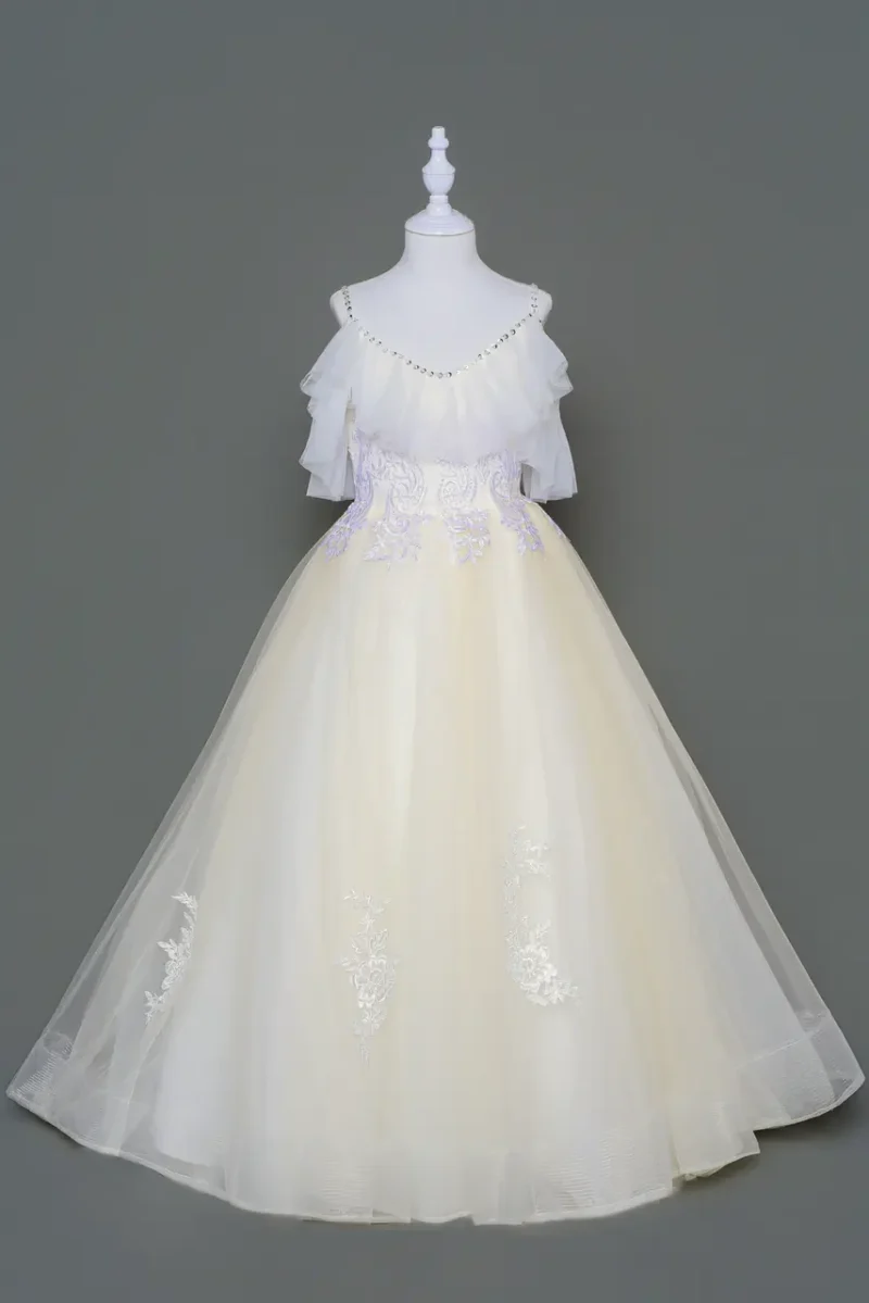「杏影庭語禮服」是為那場午後婚禮所織的童年記憶,一道米色如同日曬石階上浮動的光影,透過細緻蕾絲刺繡植入手作的詩意。澎裙輕盈展開,彷彿她走過的每一步,都是一段光與風的呢喃。細肩設計猶如悄悄綻放的花苞,疊紗翻折間展現微妙的層次情緒,保有童真的溫柔,也不失典禮中的儀式敬意。這不僅是一件花童禮服,更是一場記憶的層層堆疊,為婚禮光影中最純淨的一幕留白。