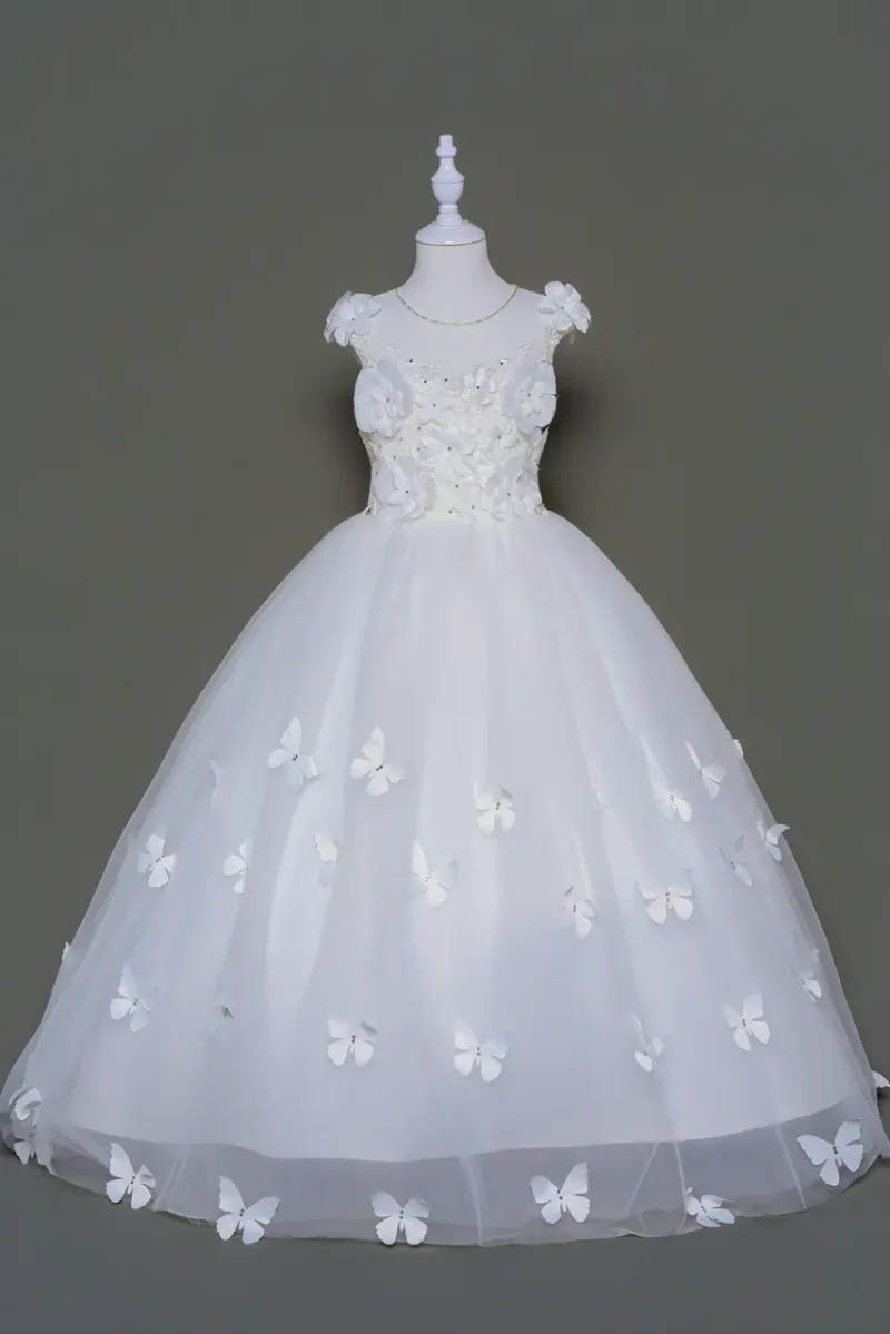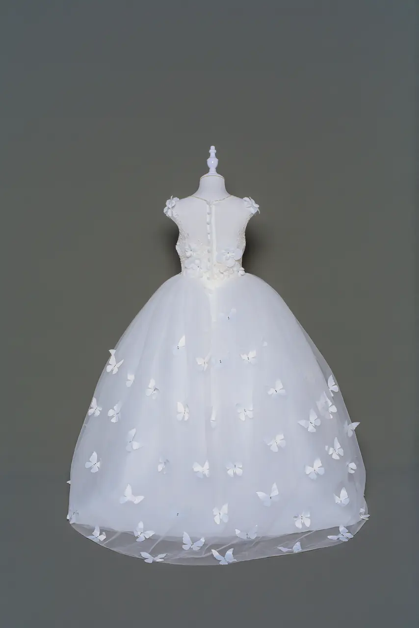 《翅音花園禮服》是獻給婚禮上最純淨的一抹晨光。精緻的圓領背心剪裁,搭配立體雕花與朵朵翩羽蝴蝶,如誤入夢境般俏然展翅。裙擺輕盈隨步伐微漾,小花童在典禮間穿梭,宛如守護幸福的精靈。這不只是一件禮服,而是一段以純潔情感綻放的微光篇章,讓見證愛的那一刻,也有一顆小小靈魂,在靜靜閃耀。
