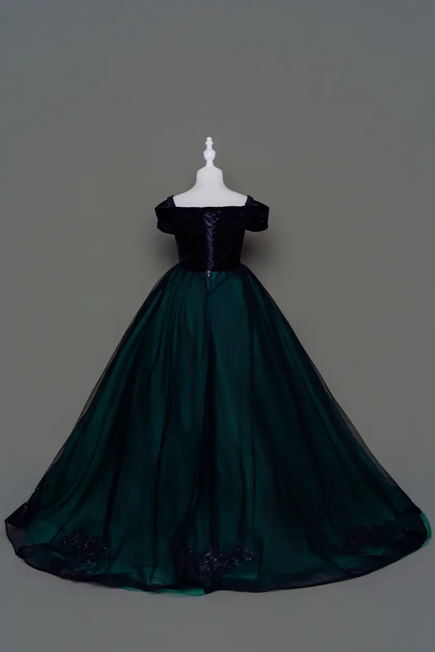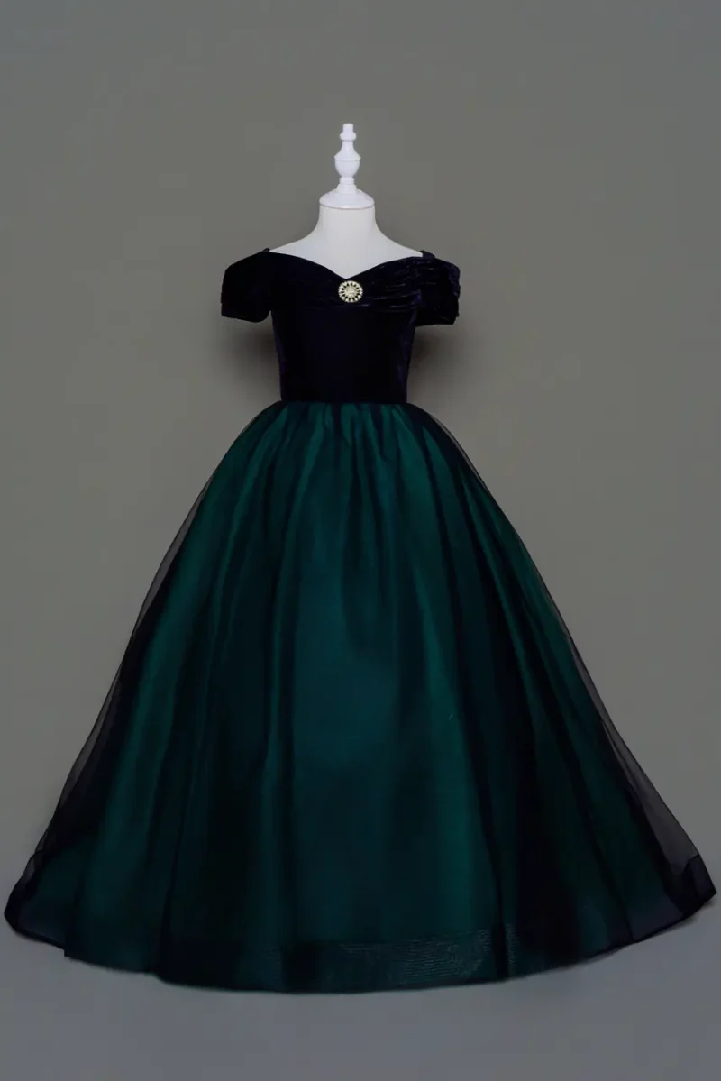 這是一件為夜色花園而生的花童禮服——深松綠的裙身如晨霧中微濕的青苔,搭配黑絨的卡肩上身,點綴一枚仿古胸飾,彷彿來自一座古堡的孩子,在婚禮序曲中駐足回望。『松影庭語禮服』不僅延續OnlyU對質感的執著,更是寫給每位父母的詩,關於孩子第一次踏入「共享回憶場域」的時刻,沉著、端麗,簡靜卻深刻,是歲月裡不求喧囂卻無法錯過的輕聲低語。