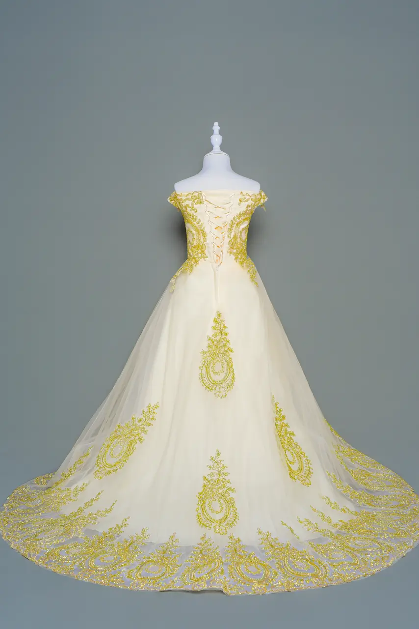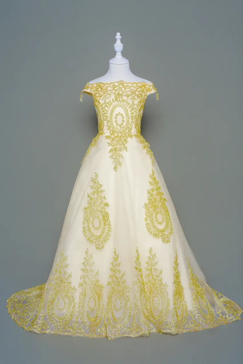 《琥珀之冠禮服》是一段關於初次登場的記憶,一個還在夢中拾起皇冠的小女孩,以細緻金線勾勒的蕾絲長裙,自信踏入儀式的中心。長拖尾如金色波光在大理石地面悠然鋪展,卡肩設計呈現微妙的古典氣韻,平口之下是未語先笑的純真。這不僅是孩子的第一襲盛裝,也是一位母親眼中稚嫩與尊榮交匯的瞬間,如同金箔嵌印的華章,為整場婚禮覆上一層童話質地。