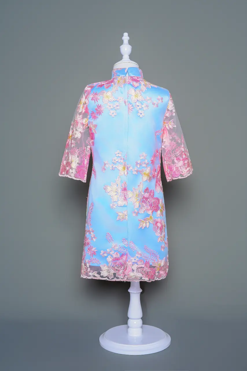 這不是一件禮服,而是一場春天甦醒時的微光記憶。『蘇醒之櫻 花童禮服』以旗袍的輪廓凝練傳統儀式感,魚尾剪裁隱藏著童年靈動的曲線。選用粉藍緞面象徵晨露初光,纏繞其中的粉系刺繡花,如櫻花一瓣瓣覆上,輕盈而不喧嘩。五分袖口透著柔紗,如花影般溫婉,將童年的氣息與東方節奏融會。適合在婚禮儀式上,成為那一筆最恰如其分的詩句,小小花童,行走於心光之中。