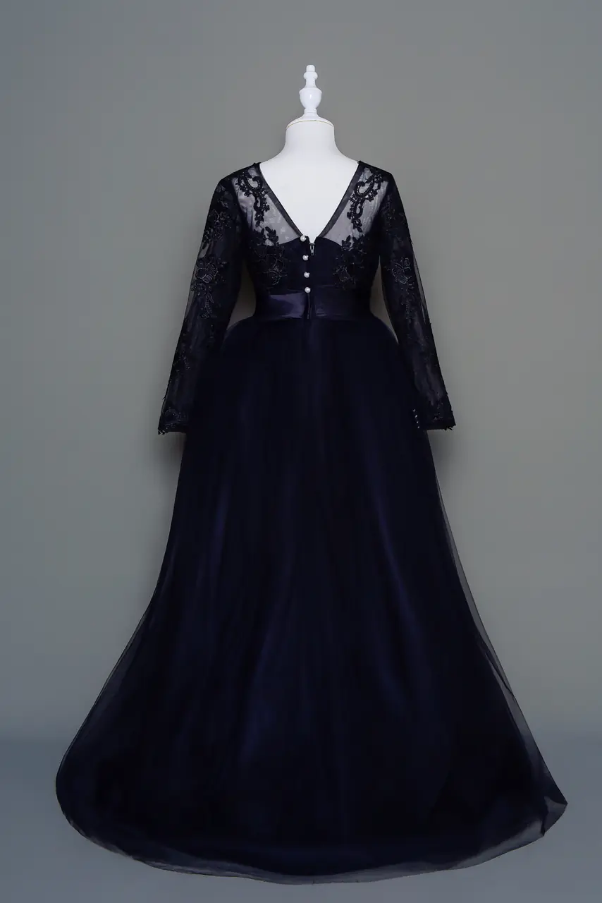 每場婚禮,都有一位小小的身影,從夜色中輕步走來。這件「暮羽緞語花童禮服」以鏤空黑蕾與輕盈紗裙交織,勾勒出宛如夜幕下隱形的羽翼,配上前短後長的剪裁,呈一種不言而喻的靜謐優雅。貝殼珍珠感腰飾,像鎖住一瞬流星的輝光,是給予花童角色的一份莊重,也是一種祝福——在喜悅間留下記憶中最深的剪影。這不僅是禮服,更是一段從純真走進儀式感的詩句。