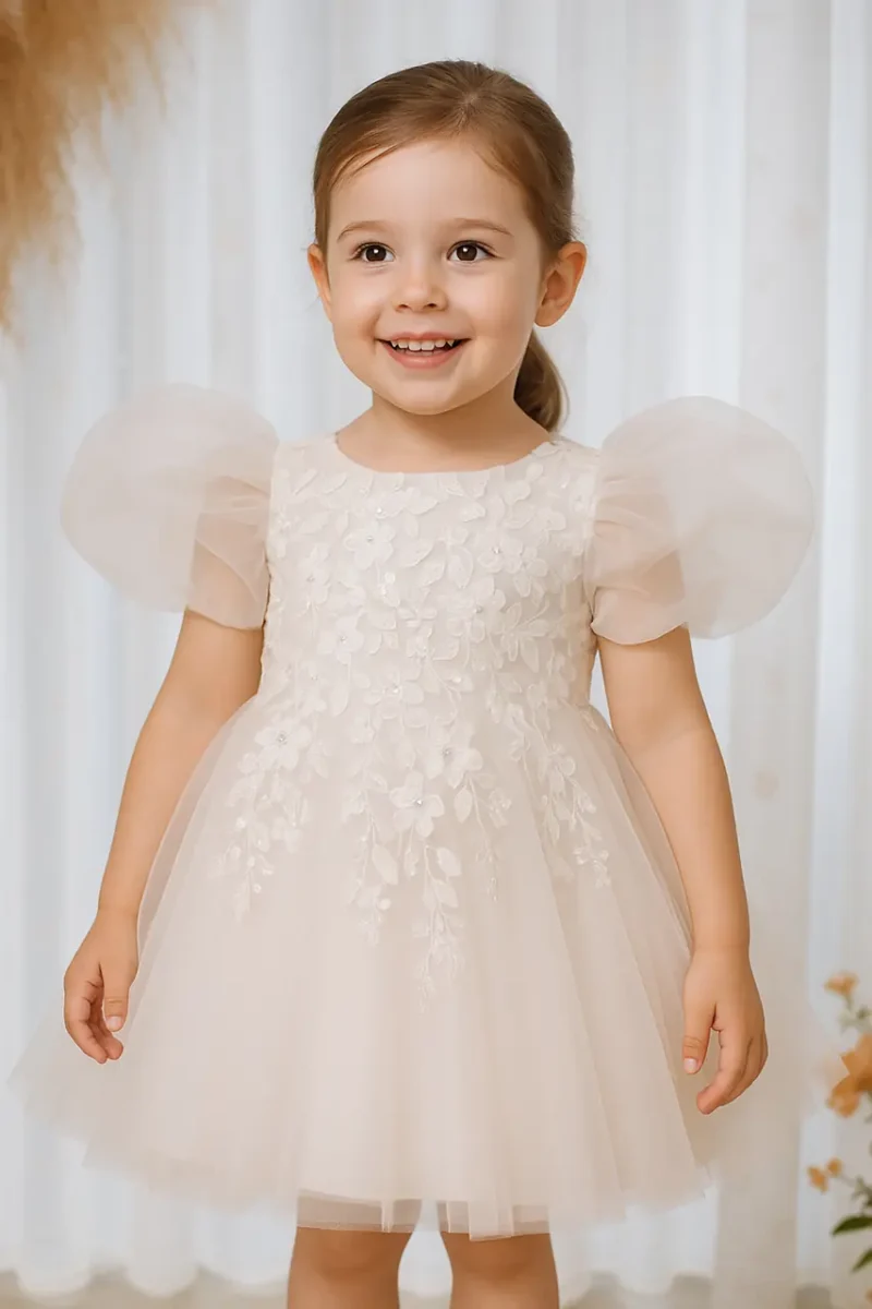 在一場如春日微風般的婚禮中,某個瞬間悄悄綻放了她的純真——『櫻雲花影禮服』為花童而生,猶如被晨曦親吻的花朵,輕盈蓬紗為裙襬鋪展出童年的輕語。圓領與泡袖的柔和結構,搭配上手工刺繡的花紋,讓每一片布料都彷彿承載著一場夢的重量。這不僅是一件服裝,而是父母對孩子最溫柔的祝福,也是一場盛典裡一縷溫婉的記憶。