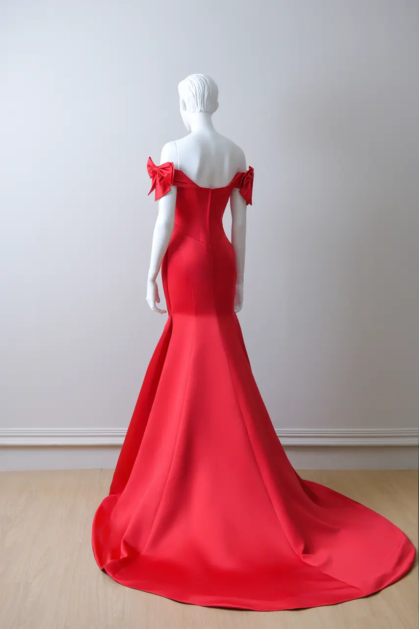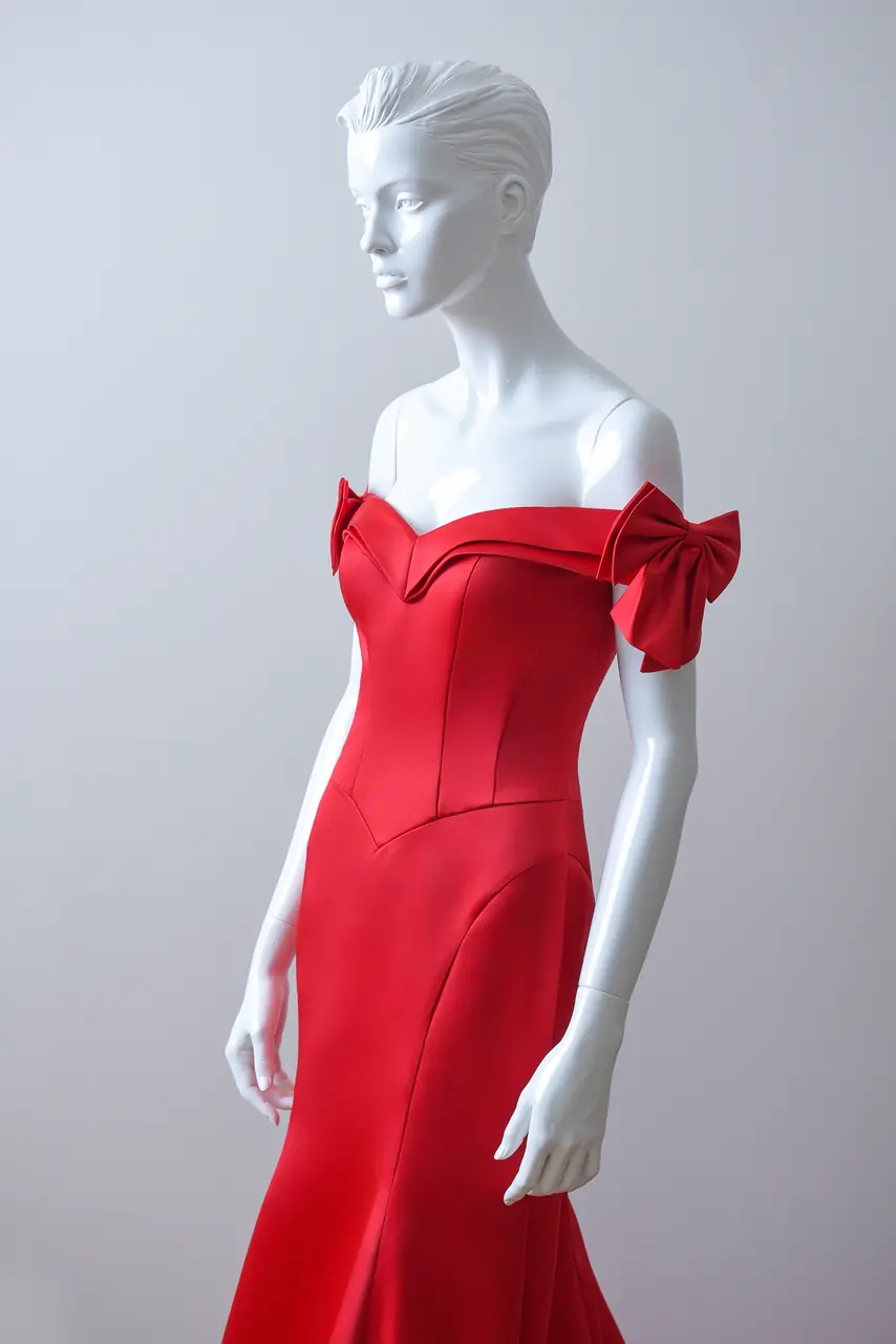 這是一件屬於深夜之心的晚宴禮服。緞面緊貼曲線,魚尾剪裁仿若一團流動的火焰,自腳踝燃向過去與未來的交界處。絳紅色不僅是一種選擇,更是一種信念,一種無須解釋的堅定。桃心領與卡肩設計,恍若時光裡未說完的誓言,而袖上的小結,如她眉間的沉默與柔情。這不是一件衣裳,而是一封無法燃燒的信,在眾目睽睽中悄然送抵內心最深處。