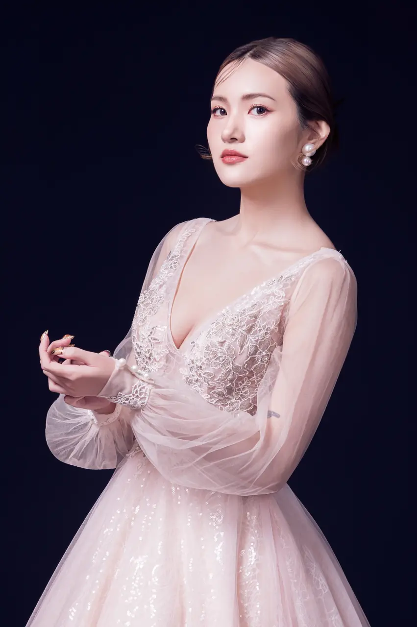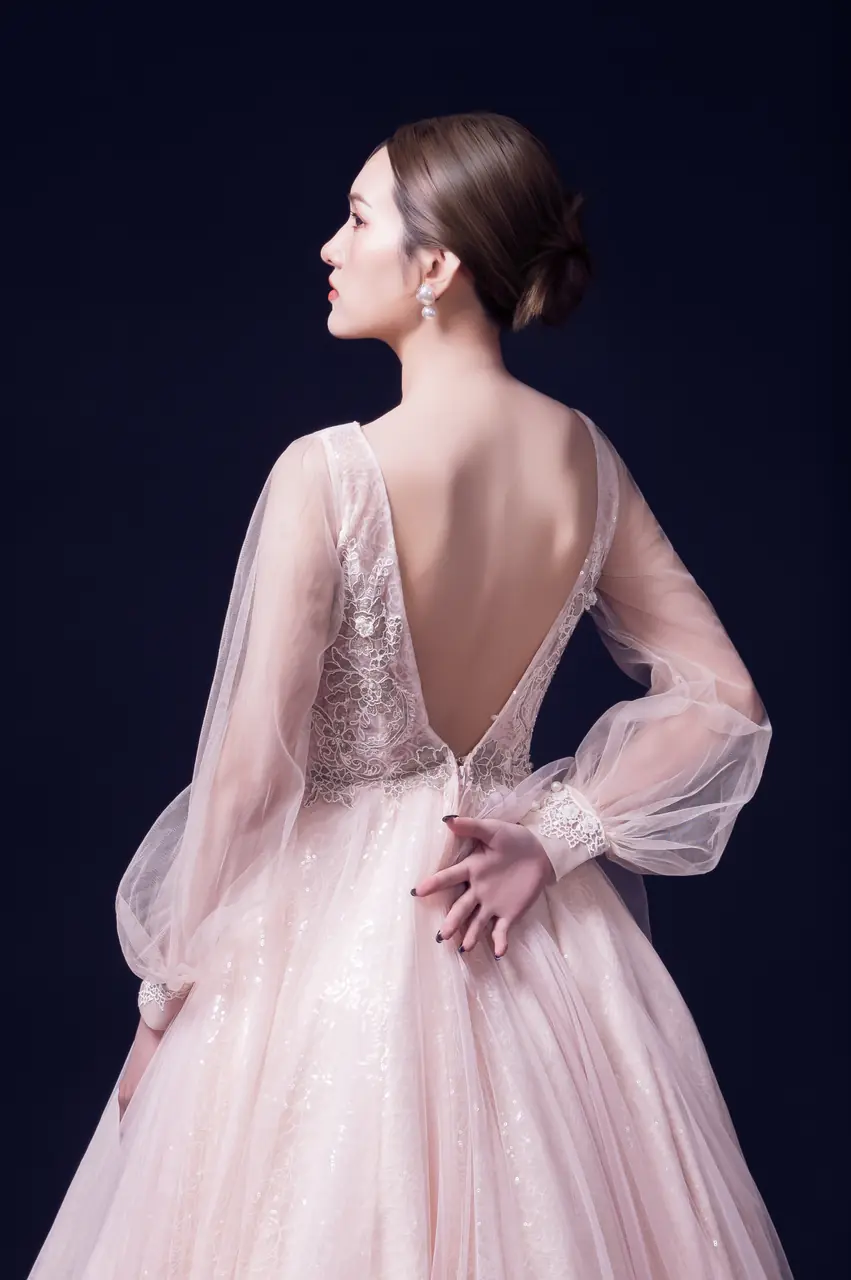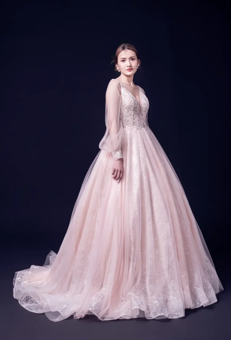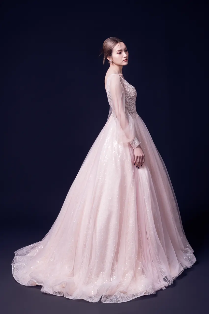 《落霞紗語晚宴禮服》彷彿傍晚最後一縷溫柔光暈,被輕柔的粉紗擷取收藏。A-line的剪裁像是思念傾瀉而出的輪廓,長袖透紗在指尖搖曳出時間的溫柔。V領設計讓心事若隱若現,閃爍在紗面間的微光像是未說出口的悸動。不需要言語,她便讓整個夜晚為愛停頓,如詩如畫,藏著最溫柔卻最堅定的願望。