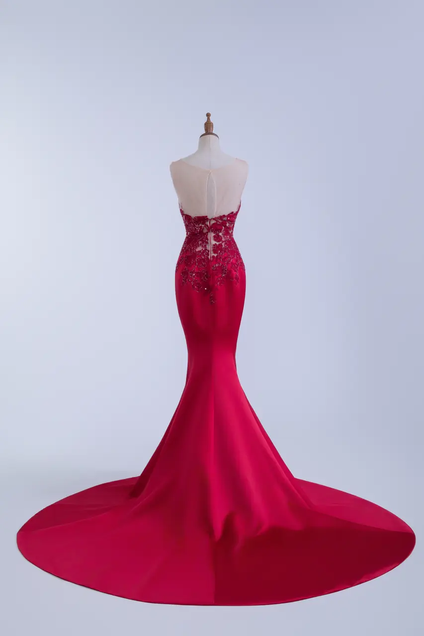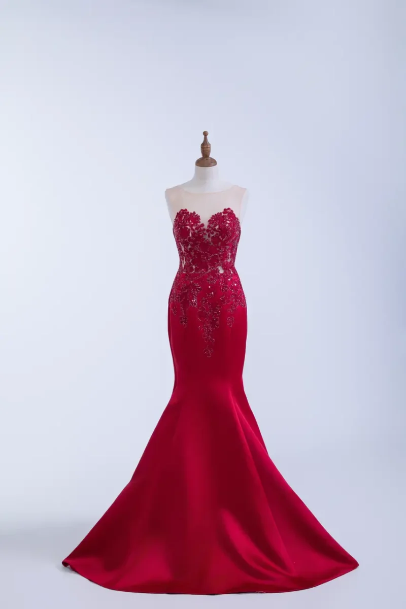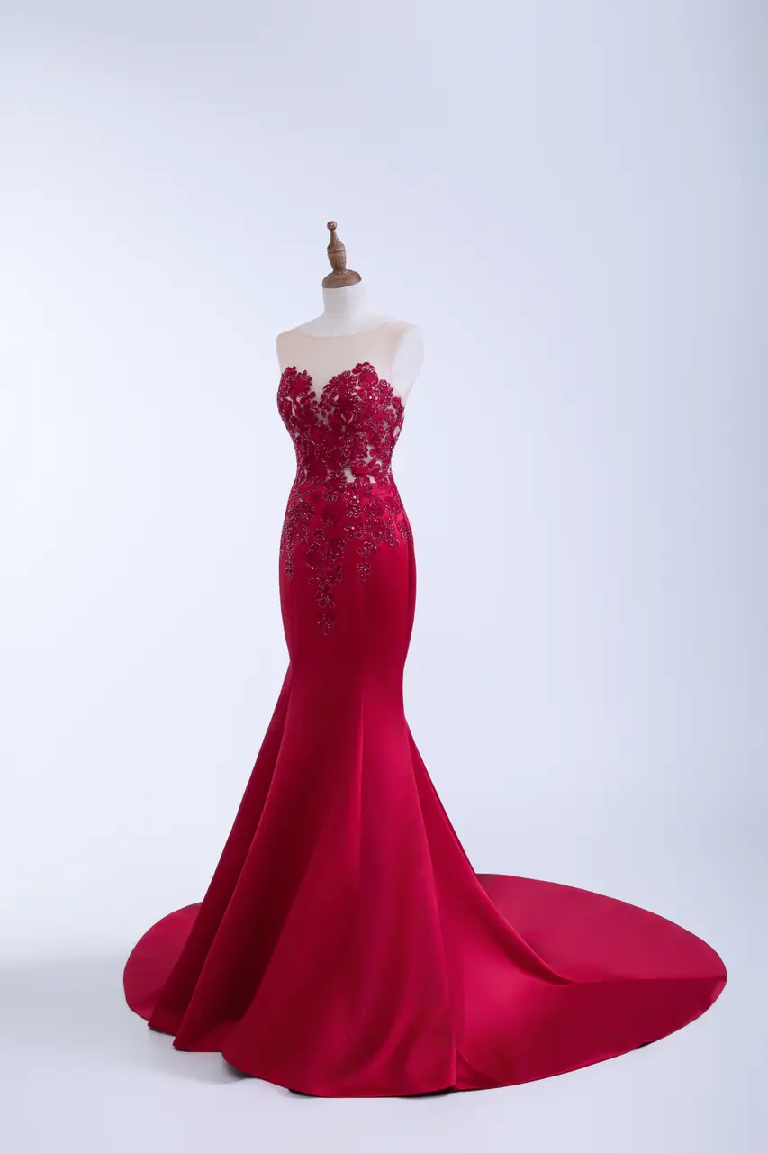 這是一場於深夜宴會中仍餘溫未歇的情感記憶,身披《燼紅遺晝晚宴禮服》,如塵封信箋中的一抹烈紅,在無聲之處奔放。上身以炙紅繁花刺繡勾勒,透明膚網像藏匿過去的柔光,宛如情感與理智交錯瞬息。緊身魚尾剪裁貼合身形,行走間聲勢如詩,尾擺滑落如語,是她用沉默訴說的決絕與溫柔。這不僅是一件晚禮服,而是一場情感餘晝裡,無法回望卻餘燼未盡的留戀。
