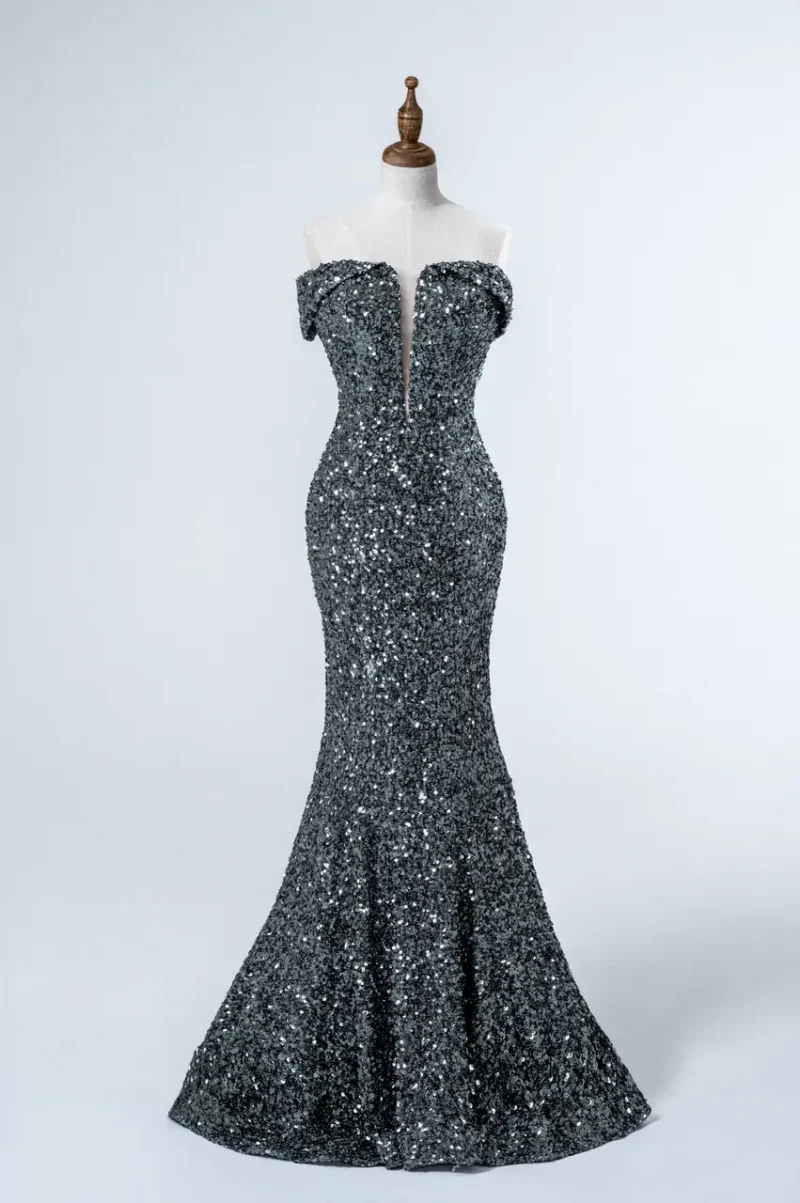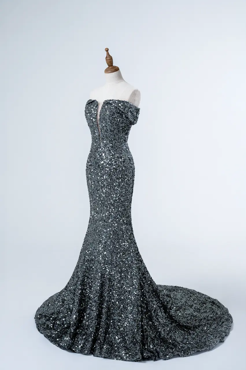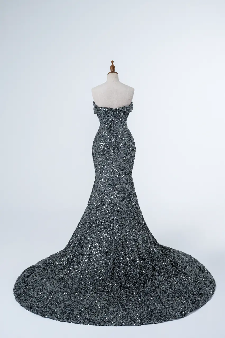 《暮晶影宴晚禮服》汲取銀夜之靈感,彷彿一場在深夜宮殿中悄然展開的盛會。魚尾剪裁猶如收束的流光,貼身輪廓映出沉穩與自信;桃心領設計拉近心跳與呼吸,每一道閃爍皆似秘密低喃。布面覆以層疊星屑,與卡肩線條共譜出一種無聲的張力。在無光之處,她就是光;在人群中央,她是靜謐與張揚的交界,一場情緒深處的盛典,專屬於無懼目光的靈魂。