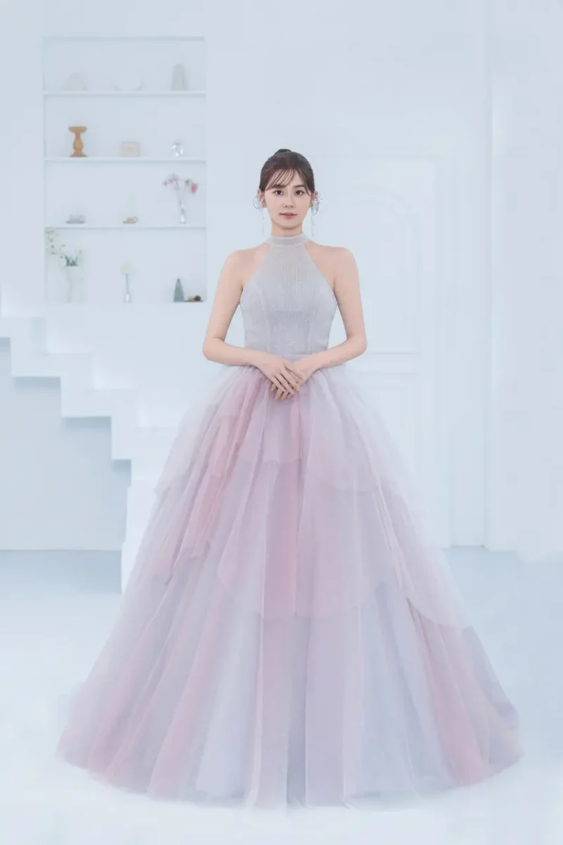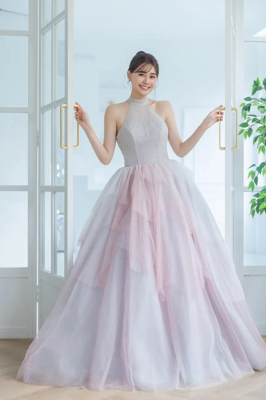 《薄暮語線》晚宴禮服,是一場柔光中的私語,也是記憶裡未竟的告白。微光墜於肩頭,削肩的剪裁將優雅凝鍊為沉靜的力量;如雲漸層的粉紗輕覆而下,每一步皆似推開夜幕,步入溫柔的片刻。這是一件為靜謐而緩慢的心境設計之作,獻給等待、想念、與剛剛好要說出口的那場相遇。當她站在燈光下,不是為了成為焦點,而是讓情感擁有被凝視的輪廓。