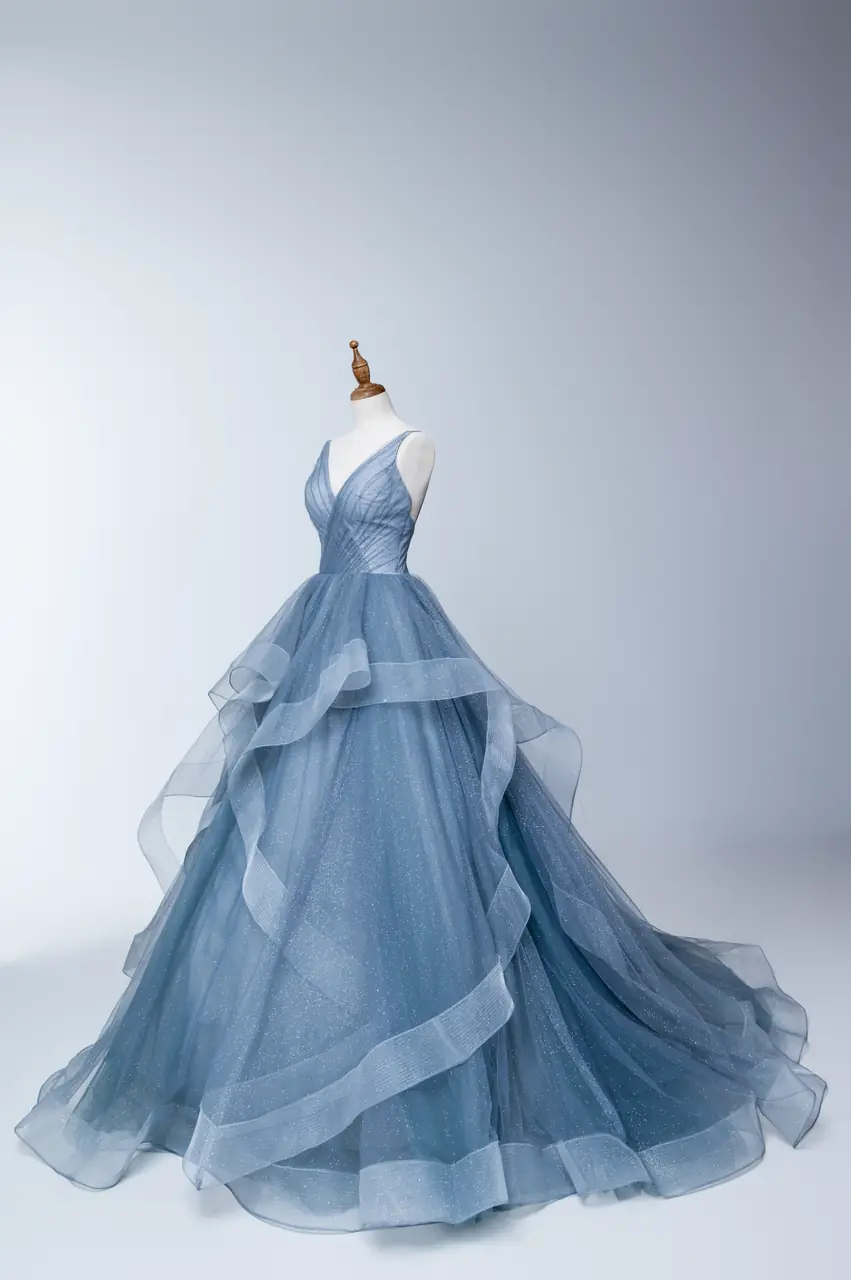 在月光下,她如月瀾般輕盈,裙擺在夜風中翩然起舞。這款禮服是夜晚的詩篇,V領設計引領視線向上,細肩帶輕若無物,仿佛夜空的星光輕輕染指。藍色的紗質層層鋪展,彷彿輕霧繚繞,隱約間傳遞著一次遙遠的夢境。穿上它,便是步入一道孤獨而美麗的旅途,彷彿置身於月夜邊境,等待著命運的低語。
