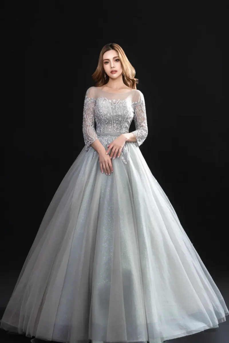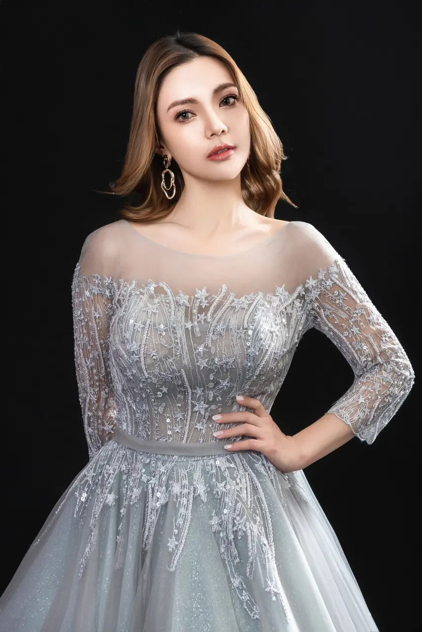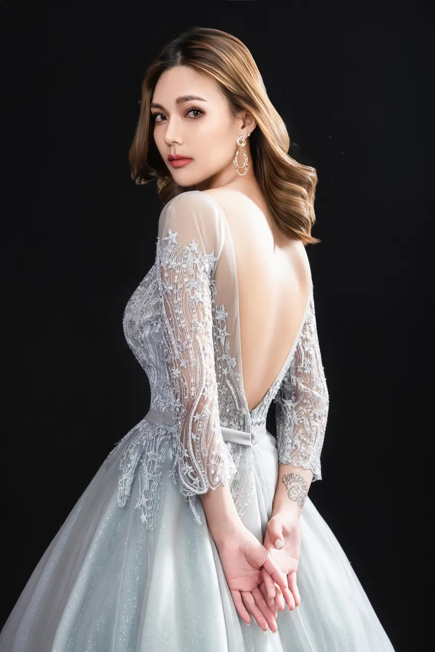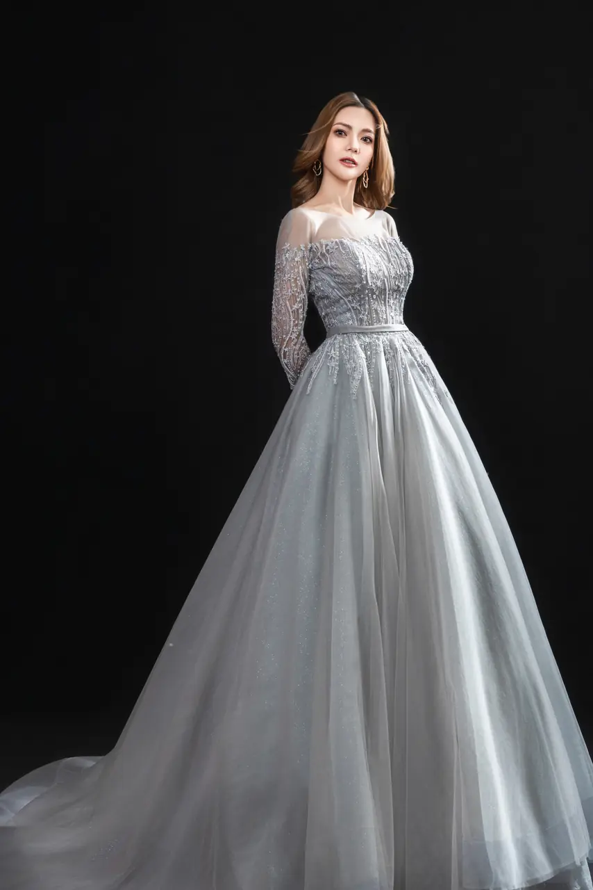 《煙河映雪》晚宴禮服如一首無聲的詩,穿越寒夜而來。灰色輕紗輕盈展開,彷彿霧瀰月色,將她包圍於靜默的銀白河岸。胸前與袖口織以細緻光影刺繡,如結霜枝影,極致節制卻無比華麗。是冬夜裡尚未說出的告白,是眺望遠方星河時眼角的閃爍,是一段關於等待與決心的柔軟情緒,在燈光流動時終於說出名字。她不求注目,但一轉身,所有眼光便靜止。