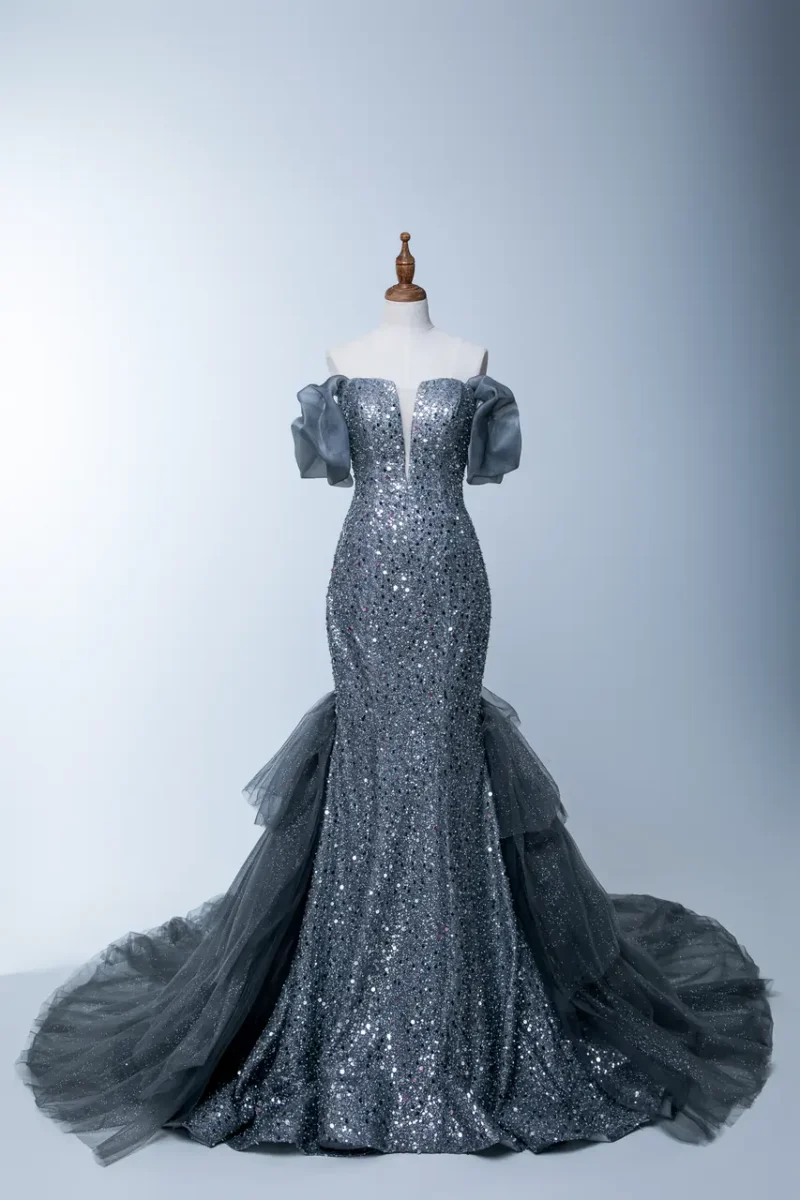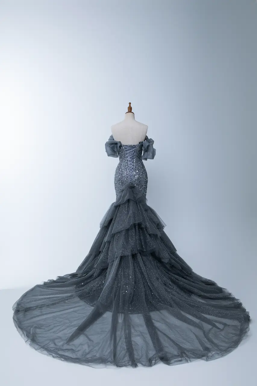 在那銀色光芒與柔和剪影交織的夜晚,她宛如星空中最明亮的點綴。這件禮服以異材質打造魚尾剪裁,桃心領與削肩設計勾勒出她獨特的優雅。她站在無垠的夜幕下,心中滿懷著無數的夢想與期盼,隨著裙襬的輕舞,她輕聲呢喃著自己的故事,仿佛整個宇宙都在她的掌聲中寂靜。一種無法言喻的靈動,讓她成為夜的秘密,記錄著最珍貴的瞬間。
