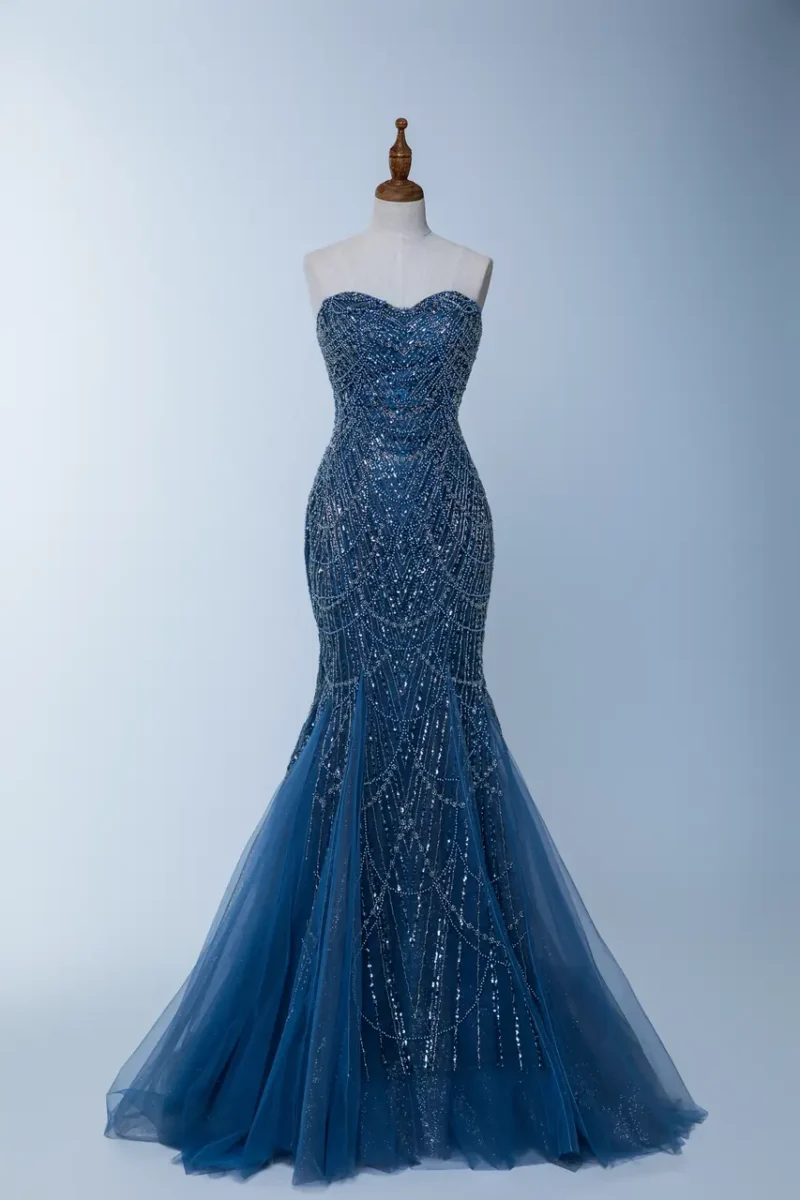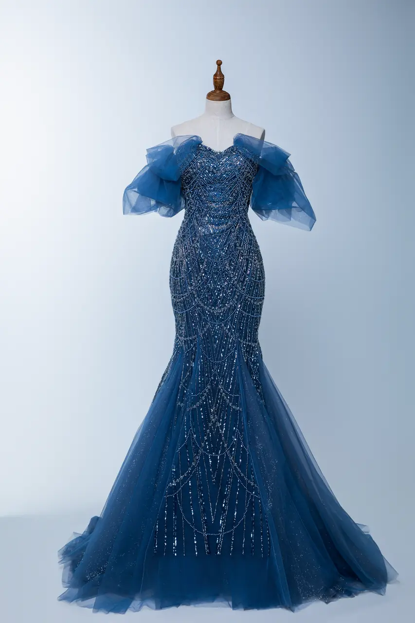 穿上星瀚綺,彷彿置身於無垠星空中,蔚藍的紗質緩緩流動,如夜空中輕柔的微風。桃心領口映襯她心中漫溢的愛意,削肩設計則如同羽翼般輕盈,讓她宛如星間仙子,在星光下翩翩起舞。這是一段無聲的愛情故事,她用無數繁星裝飾自己的情感,靜靜等待著那永恆的一刻。