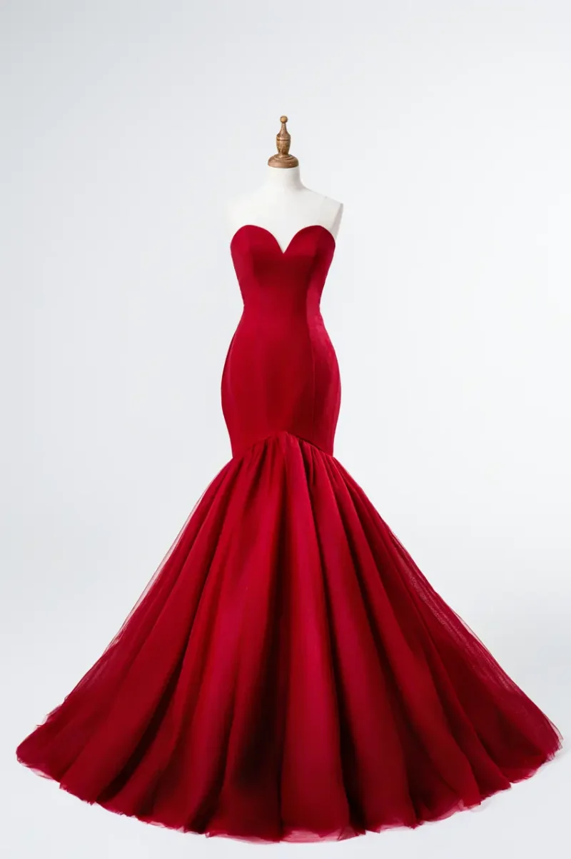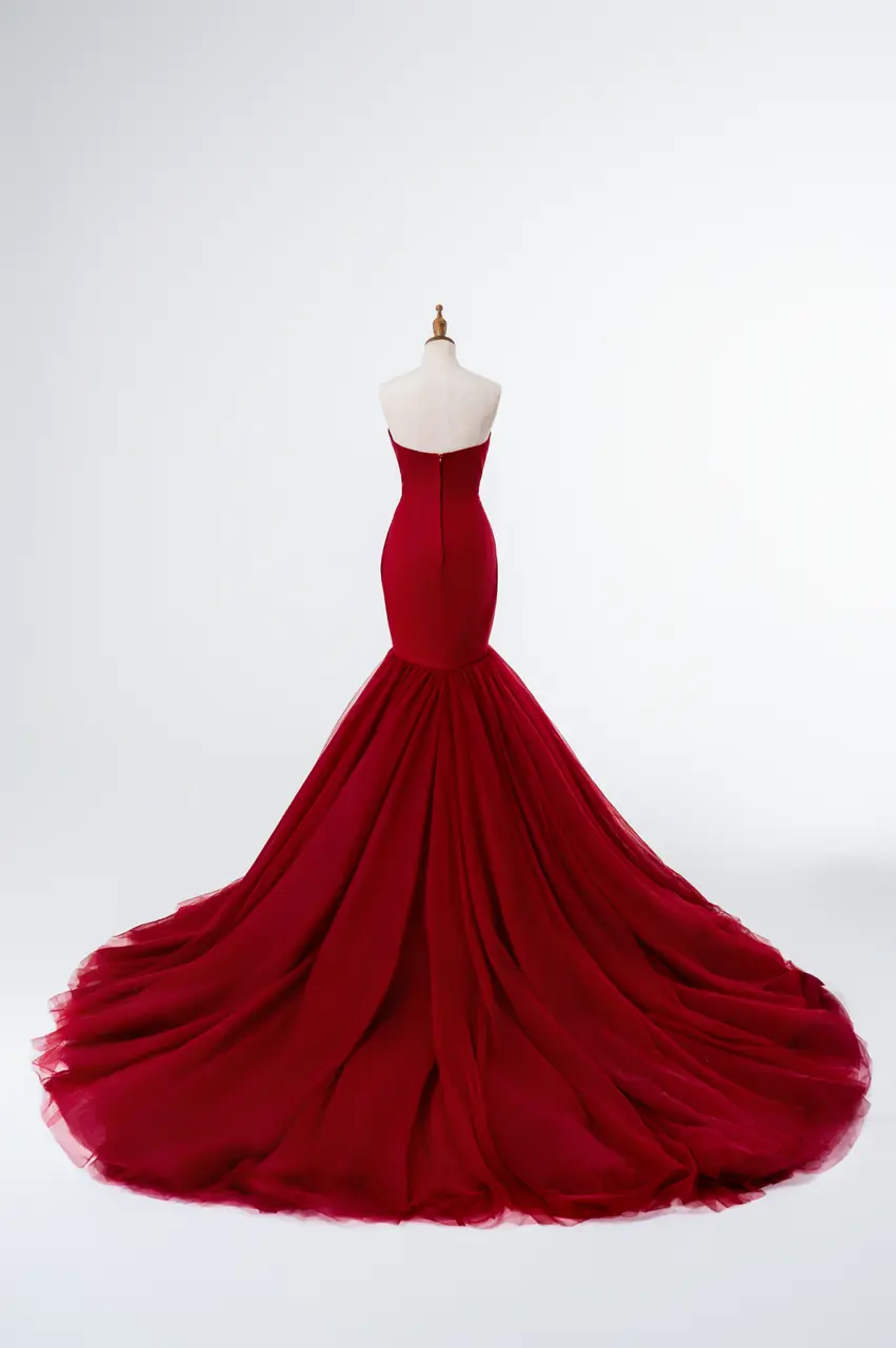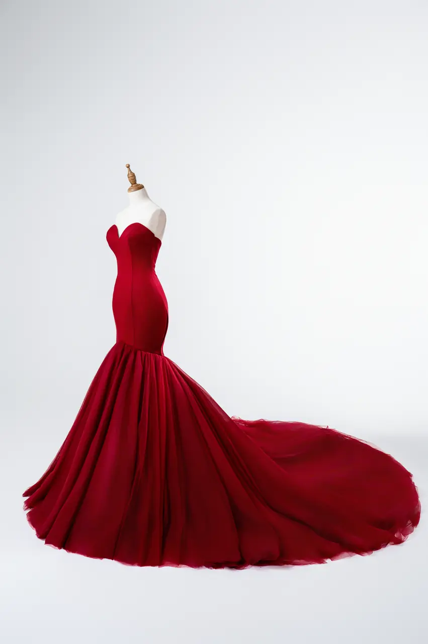 在星辰的簇擁下,她踏入只屬於她的夢幻國度。這件無袖的紅色魚尾禮服,宛如流動的火焰,輕輕舞動間,映出她每一絲細膩情感,善變而又充滿渴望。桃心領的設計為她增添柔美韻味,如同月桂樹下的一抹朝霞,柔和而迷人。她的故事在每一步留下餘音,一如她所願的,充滿愛與自由的未來。