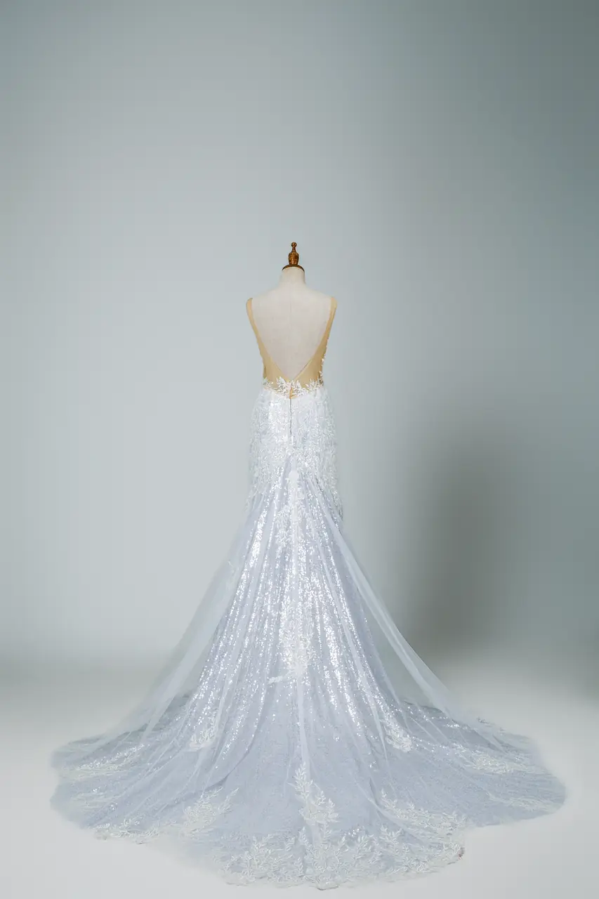 這是一件誕生於霧靄黎明的晚宴禮服,銀白蕾絲如靜謐林間薄霜,魚尾剪裁自腰際輕柔展開,彷彿步入深林時裙襬掃過結霜落葉。V型深領是一道斷光之線,投射出堅定與柔軟交織的情緒。每一縷閃耀反光,都像潛藏在冬日枝梢上的秘密,低語愛的誓言。適合在夜晚降臨前最靜謐的一刻穿上,讓身體成為一座被銀白覆蓋的記憶之森。