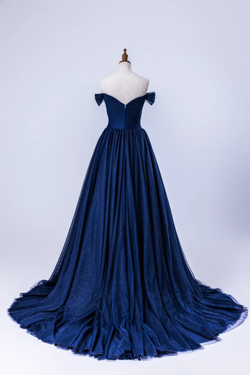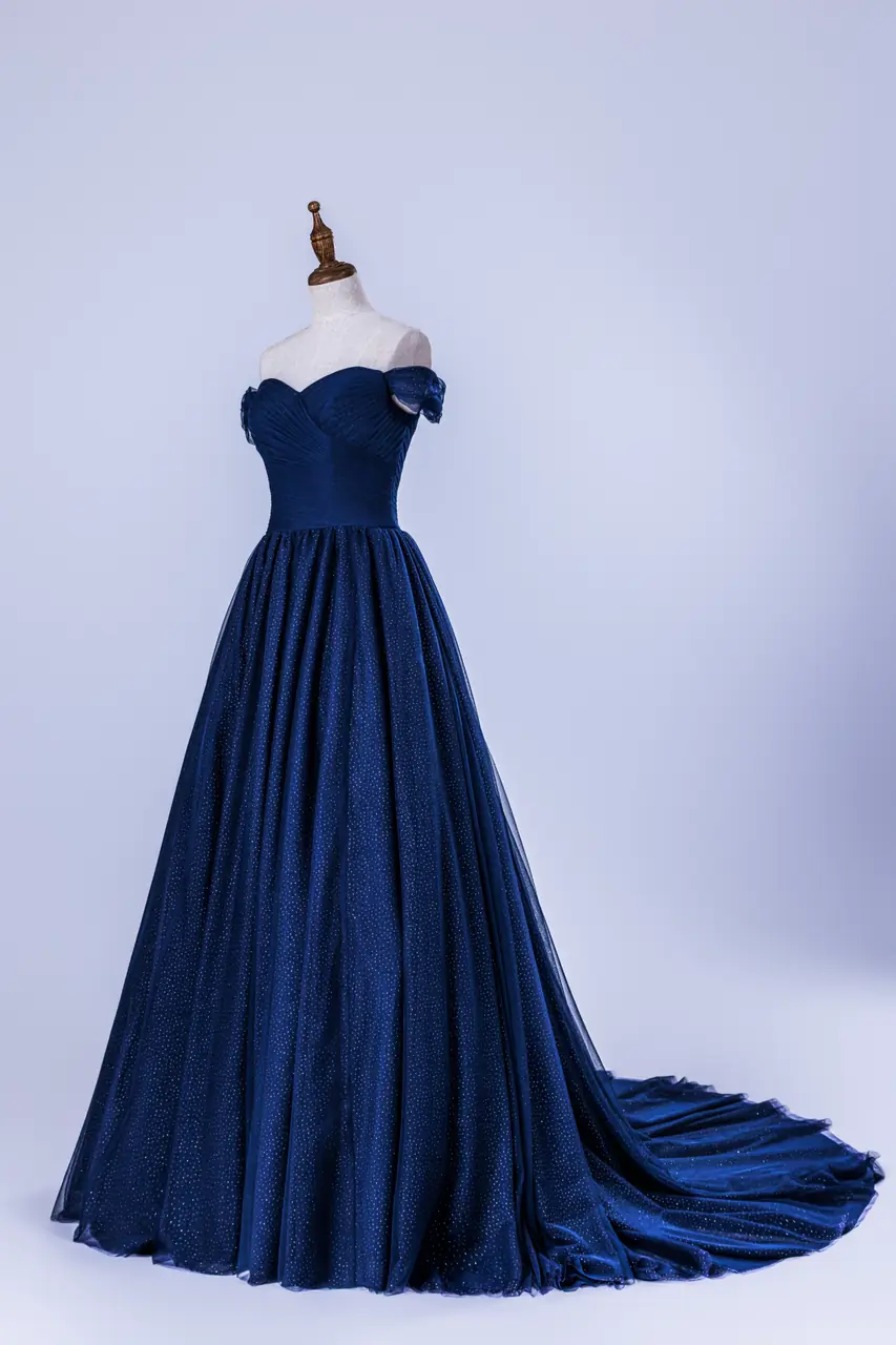 靛夜降臨,遠岸的光漸隱於天際,她靜靜佇立,如此貼近一段無聲的樂章。這件禮服以深藍為引,似潮水將記憶一層層包覆——柔紗滑過肌膚,澎裙張揚著心跳的漣漪。桃心領與卡肩設計讓情緒恣意流動,兼具力量與溫柔。當她步入燈影下,微光反射於紗線的閃點,彷彿整個宇宙都為她旋轉。這不是一件衣裳,是一夜難忘的靛色詩篇。