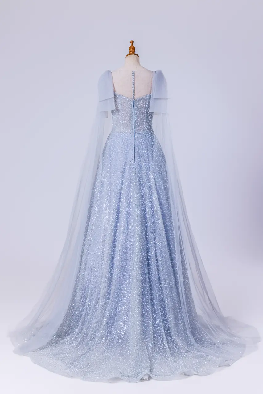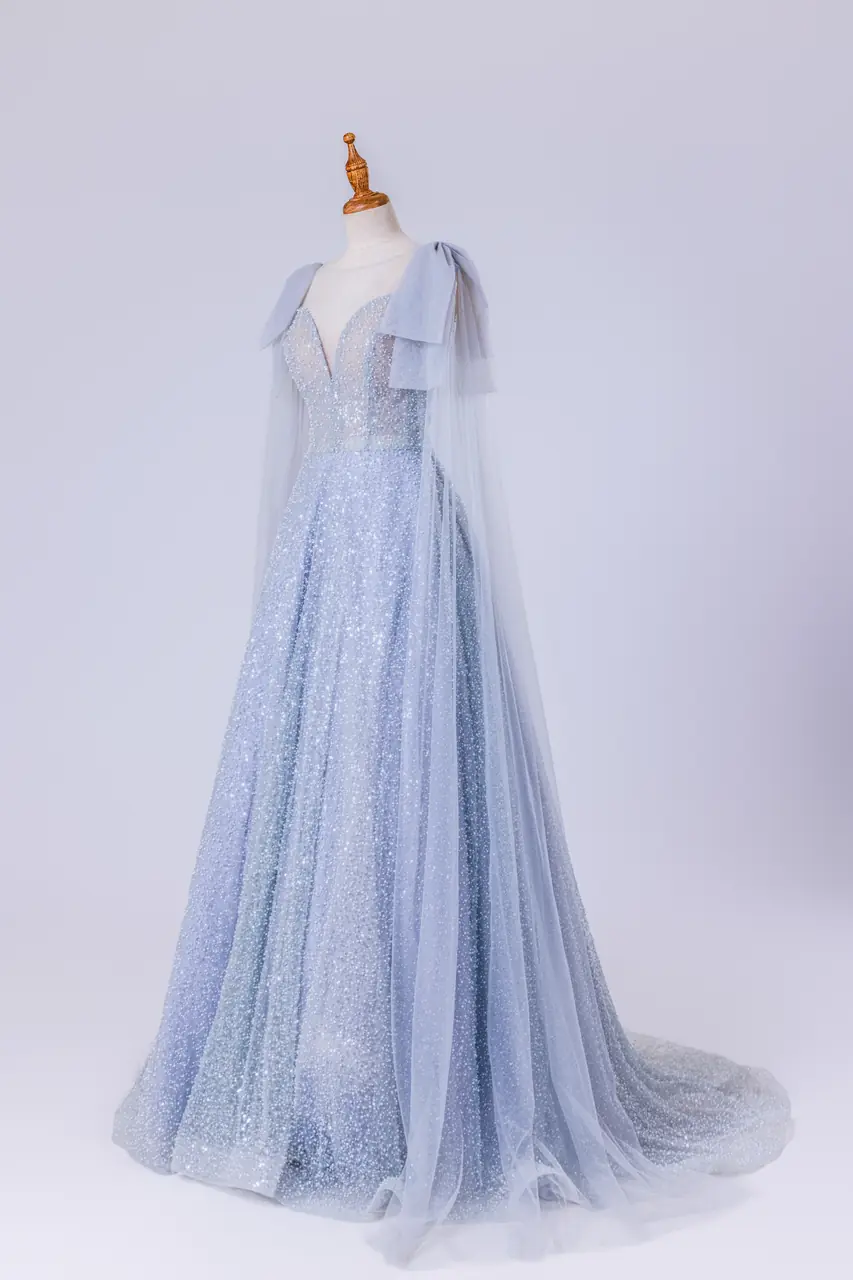 以灰藍為主調,整件覆上細密亮片網紗,呈現若霧若星的冷調銀輝。上身採心型深V剪裁,貼合胸線並於腰部收束,悄然拉長比例。肩口以雙層立體肩片連接極輕薄的長披肩,自肩沿背垂落至地,與寬大的A字裙擺相合,行走間掀起流光與層次。裙身透而不薄,內襯親膚,穿著舒適;在日光與宴會燈下皆能細碎反射,如湖面微波。適合晚宴、婚宴二進、訂婚與舞會場合,低調而耀目,將靜謐的情感化為每一步的光。