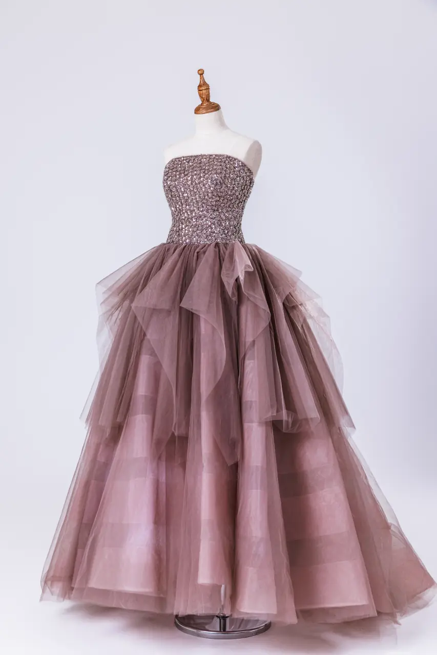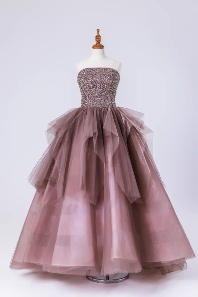 《灰燼舞序》是一首燃盡後的浪漫殘響,霧褐疊紗如絮語紛落,仿若暮色中簷下最後一道光。裙擺層層堆疊,藏著未盡的告白;胸口以萬點微光繡就,如沉默中仍堅定閃爍的記憶。這不是奢華誇示的禮服,而是一場對過去的深刻凝視——以微光代言情感,於尚有餘溫的夜晚中舞起。適合暗夜宴會、私語約會或靜謐婚禮,在靜靜轉身之際,引來所有目光。