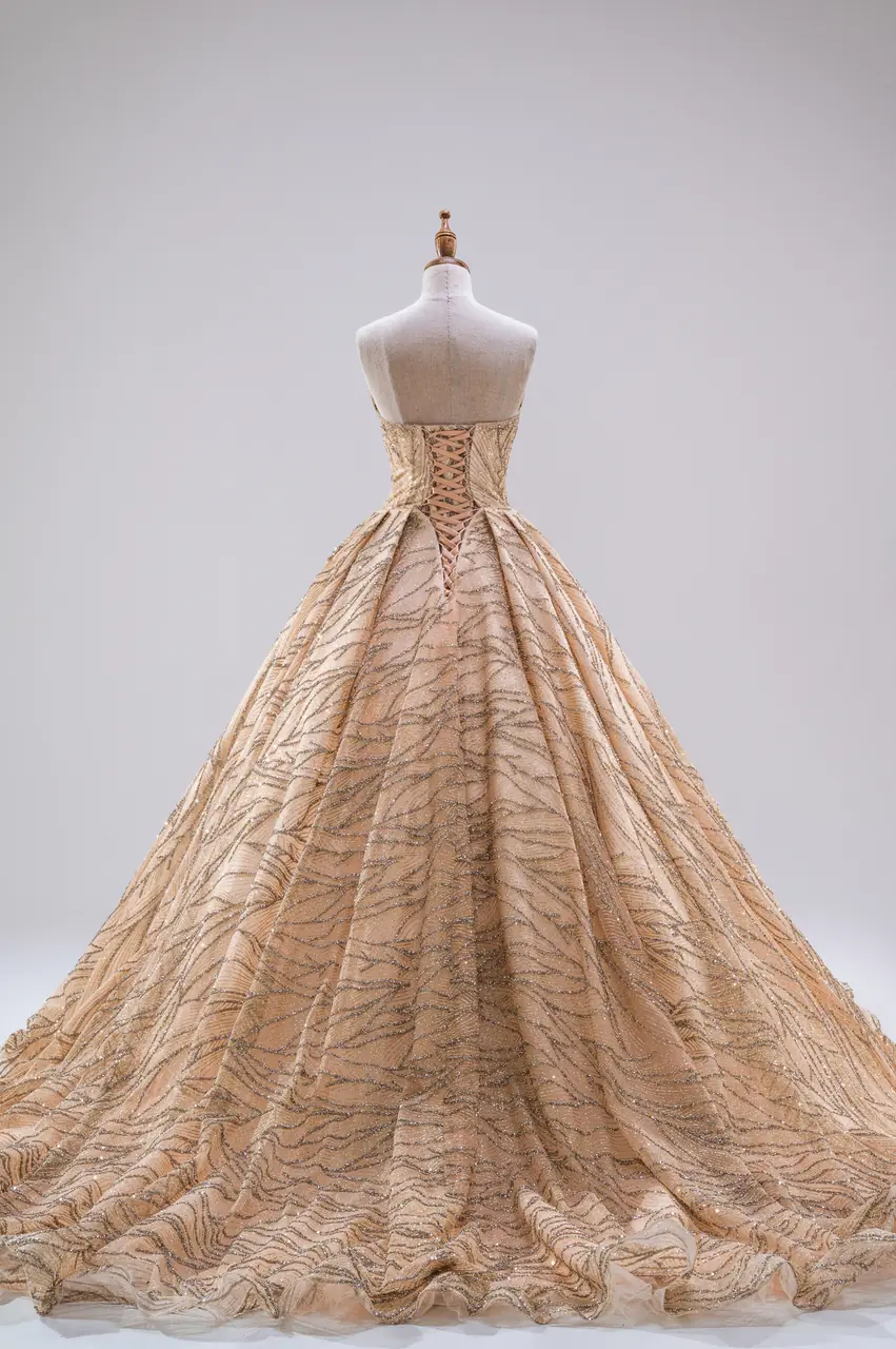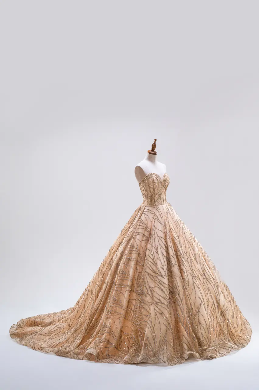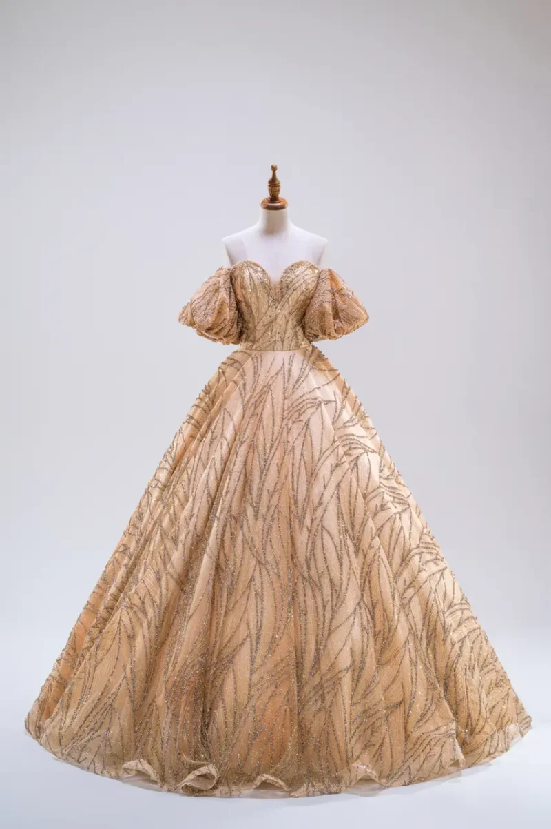 每一道金色的紋理,如山林間倦鳥歸巢時,天空灑下最後一段光。這件「琥珀枝語晚宴禮服」以寬鬆澎袖與桃心領開啟情緒的節點,異材質的厚實編織讓整體語彙更具雕塑感,彷彿穿戴者不只是出席,而是出場。繁複的琥珀織線交錯如枝似語,在燈火迷離間投射出隱含詩意且有分量的身影。如同深秋黃昏裡的一場私語,她是金色林間唯一的聽眾,也是最後說出心語的人。